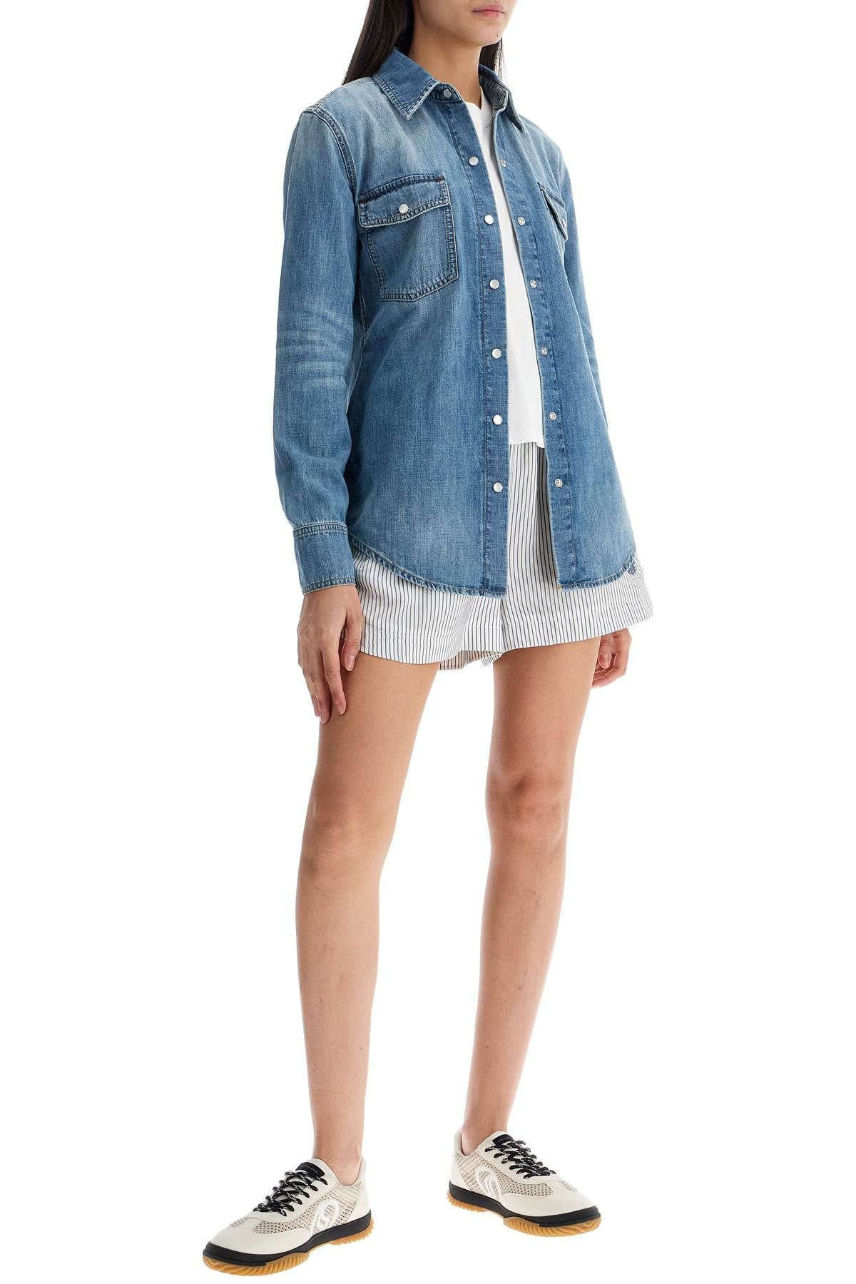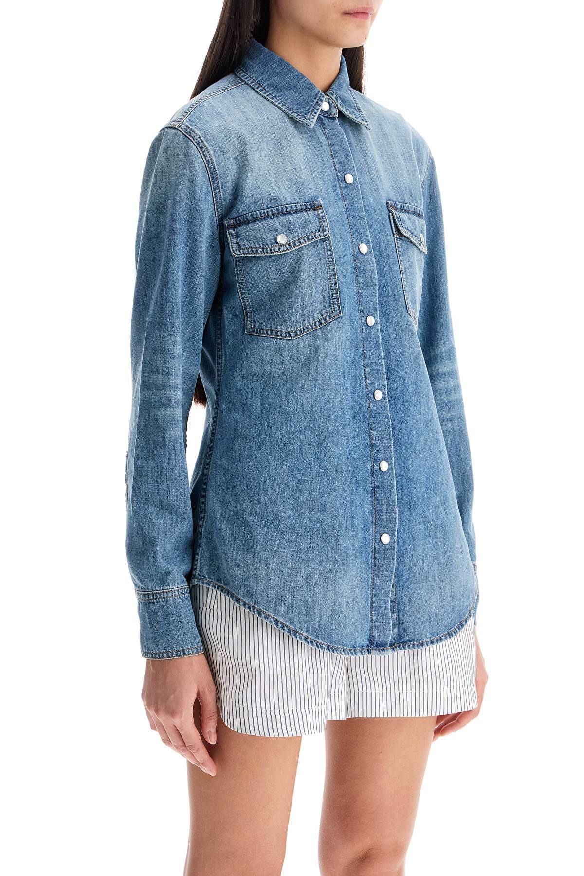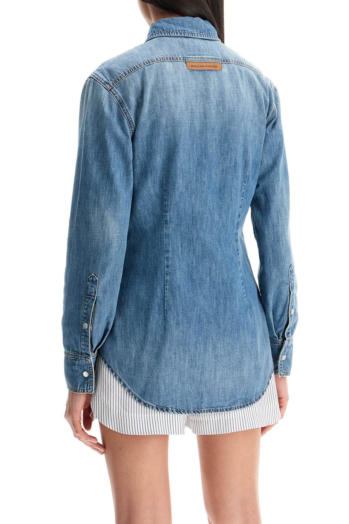 Crafted in medium vintage wash denim, this Stella McCartney shirt features a fitted silhouette with a collar, two front pockets, and a curved hem