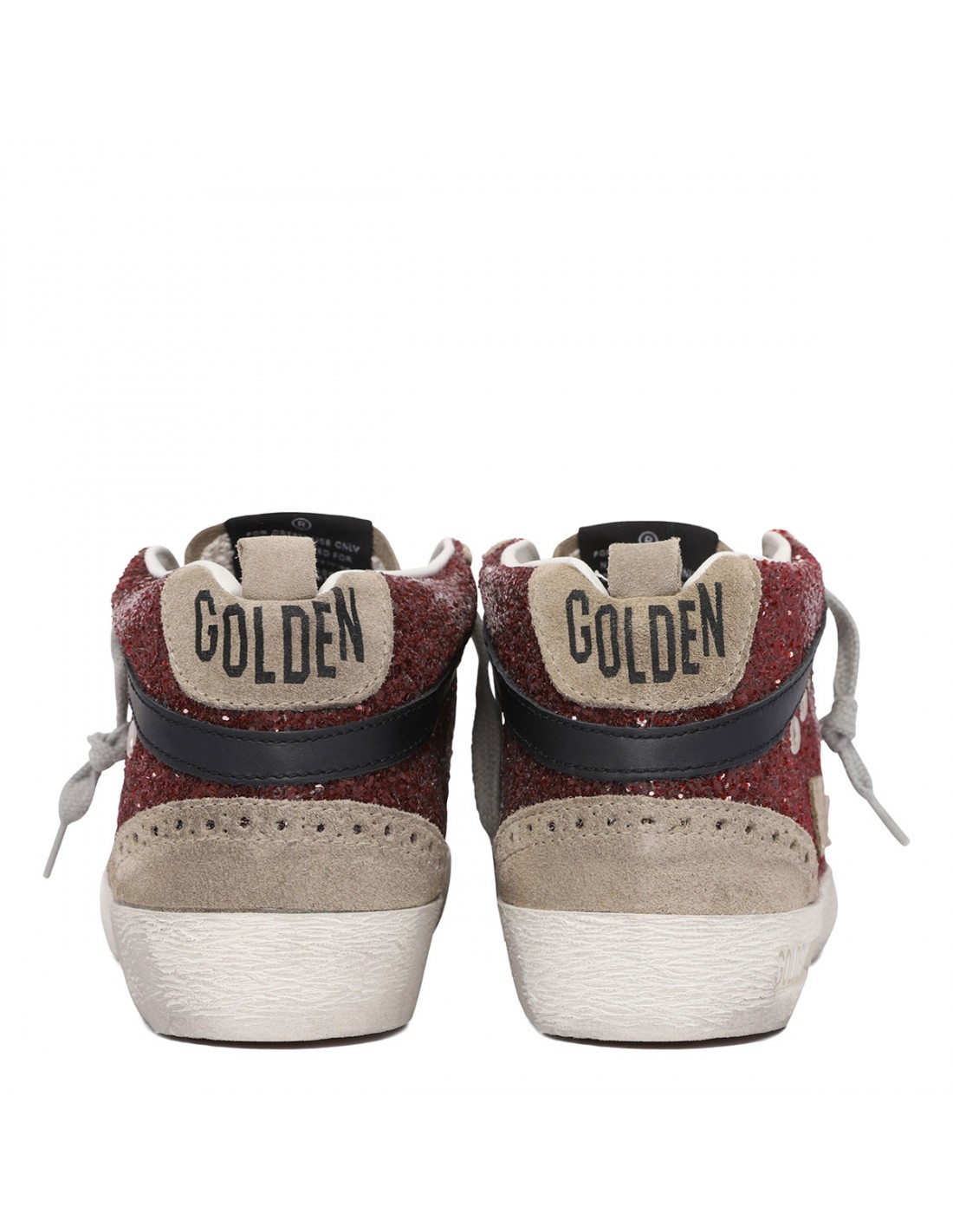 Burgundy glittery MidStar sneakers from Golden Goose featuring taupe suede inserts, signature white leather star, black leather flash, brogue detail, vintage finish, round toe, ice-gray laces closure, taupe suede heel tab with logo, suede pull tab, logo tag, rubber sole.