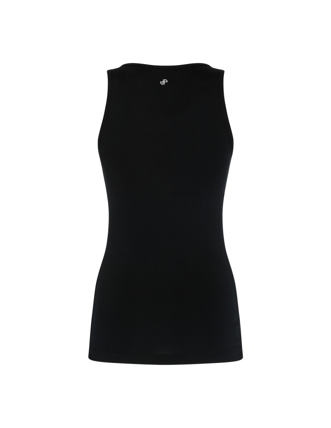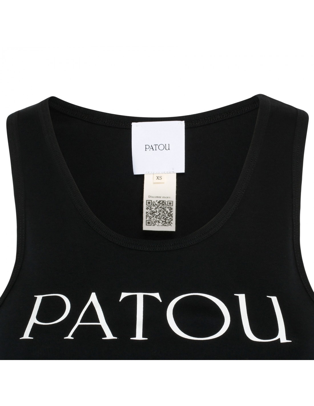 Black organic cotton tank top from Patou featuring contrasting white logo print on chest, sleeveless style, U-neck, monogram at back.