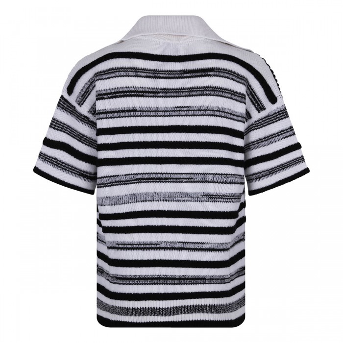 White and black knitted cashmere and cotton blend polo from Barrie featuring striped motif, polo collar with split, short sleeves and slightly dropped shoulders.