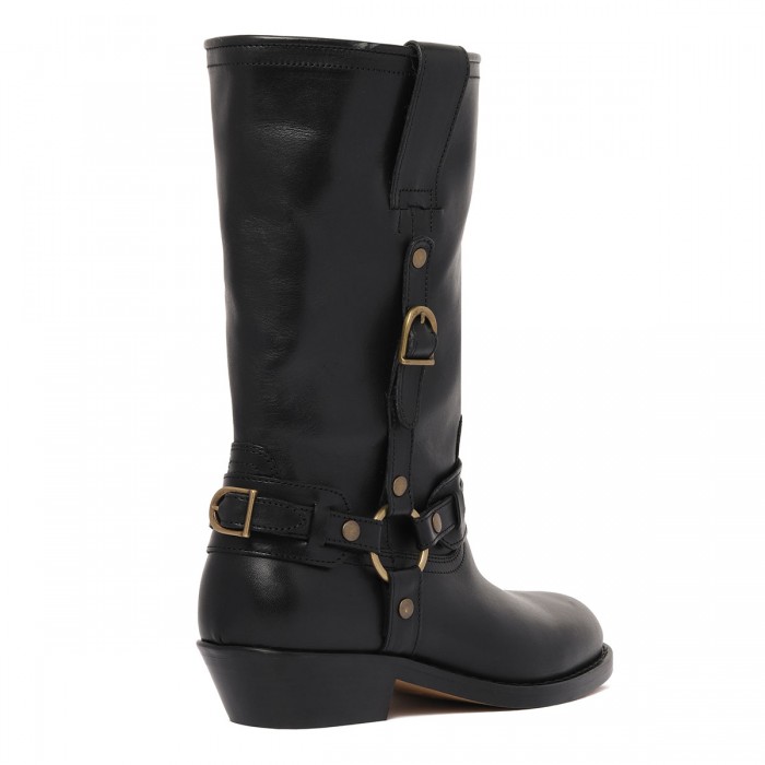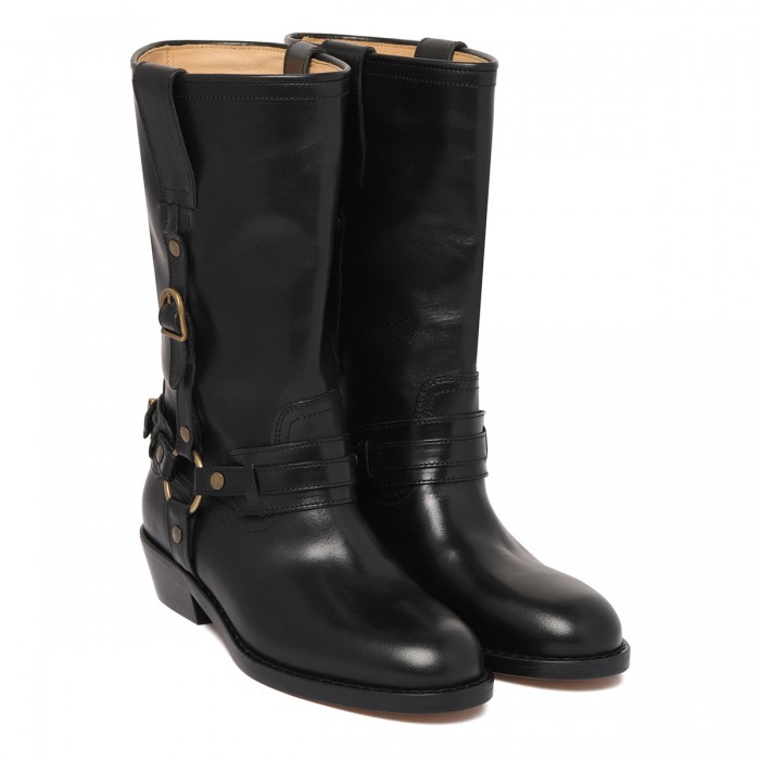 Black leather Heiko cowboy boots from Isabel Marant featuring Cowhide leather boots featuring straps with a ring, studs and buckles, round toe, gold-finish metal details, laminated leather heels, leather lining, insole and outsole.