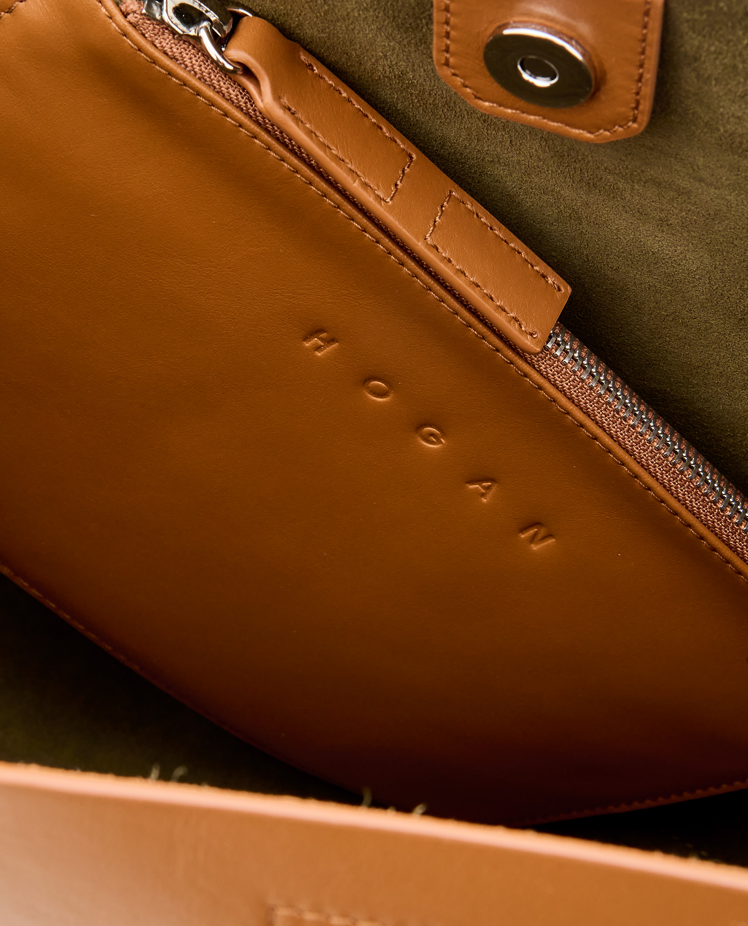 H10R Hobo medium shoulder bag in calfskin from Hogan. Magnetic closure and internal pouch with zip. Brown colour. New Arrivals SS25.