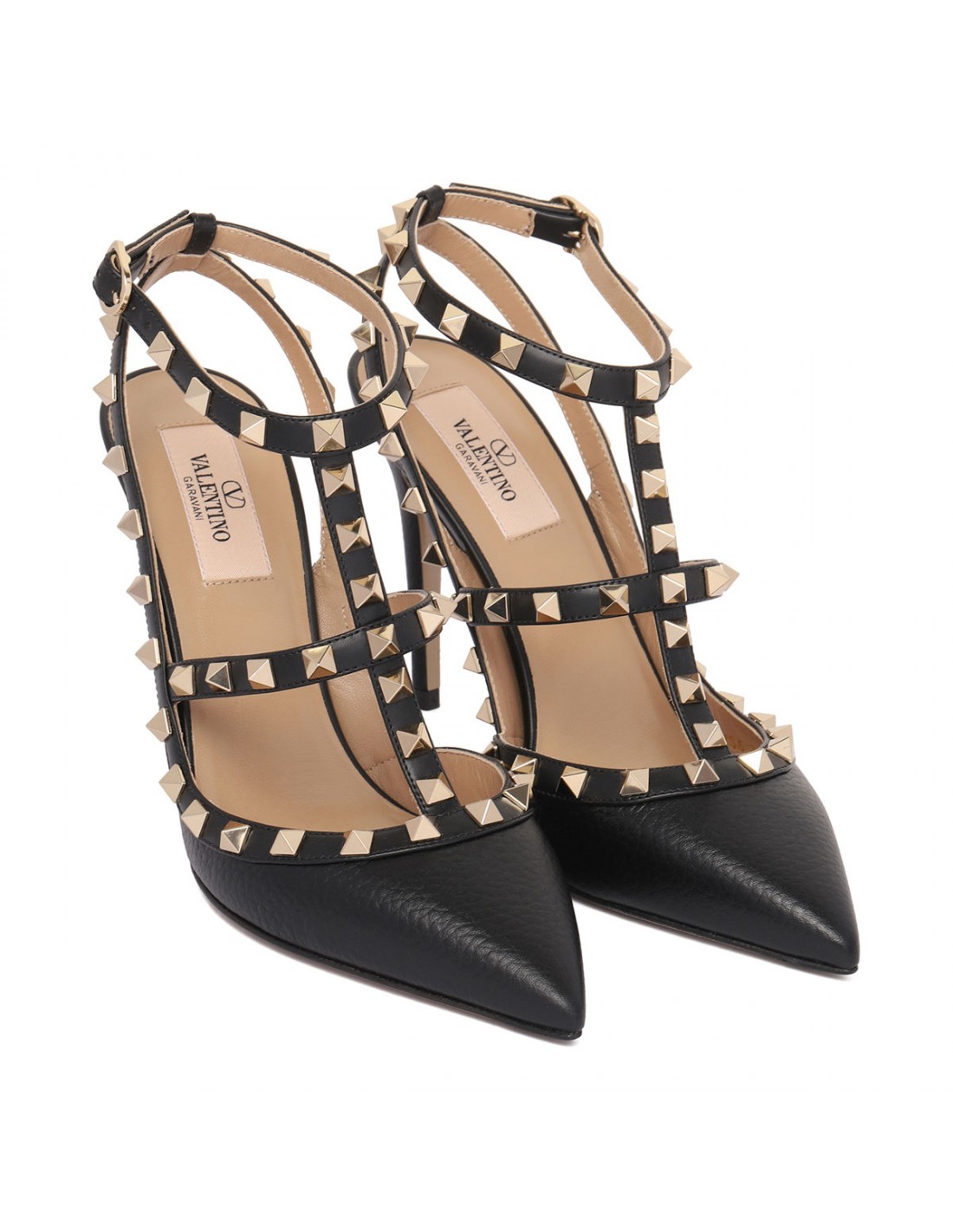 Black grained leather Rockstud ankle strap pumps from Valentino Garavani featuring buckle fastening ankle strap, pointed toe, platinum finish studs and hardware, stiletto heel, leather insole and sole.?