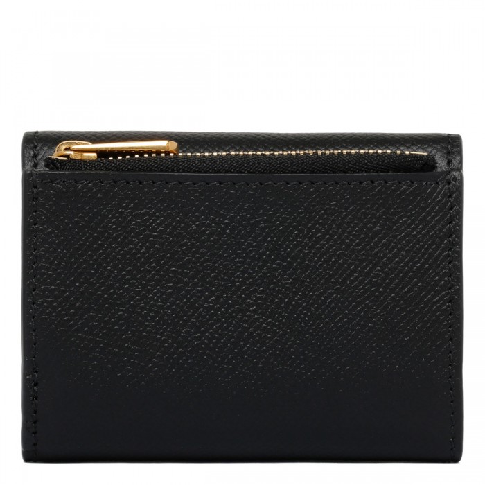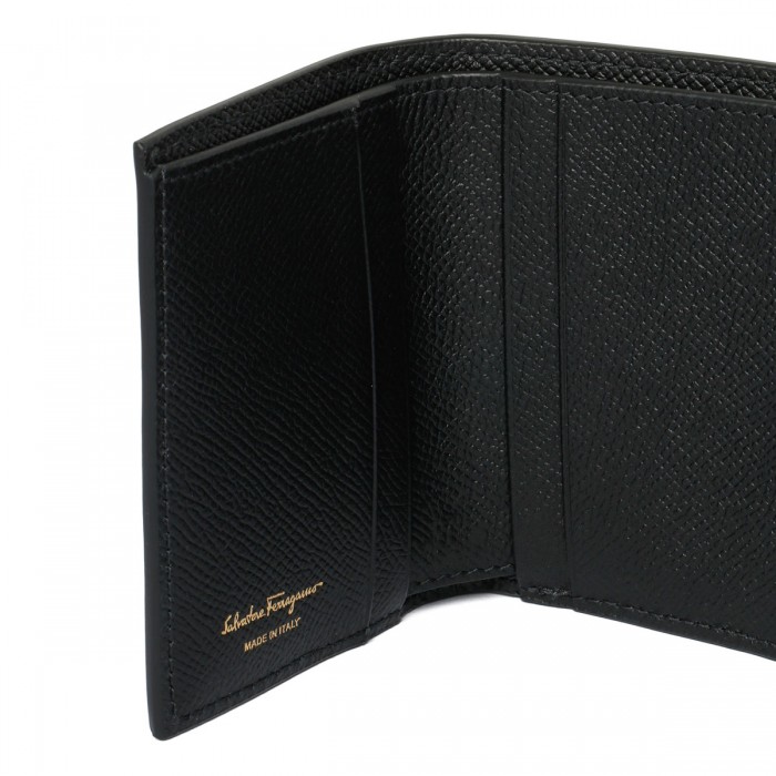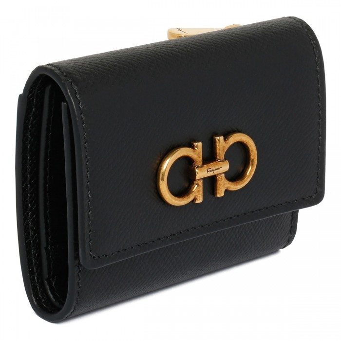 Black hammered calfskin Gancini credit cardholder from Ferragamo, featuring flap decorated with palladium double Gancini, back flat pocket with zip, internal card slots.