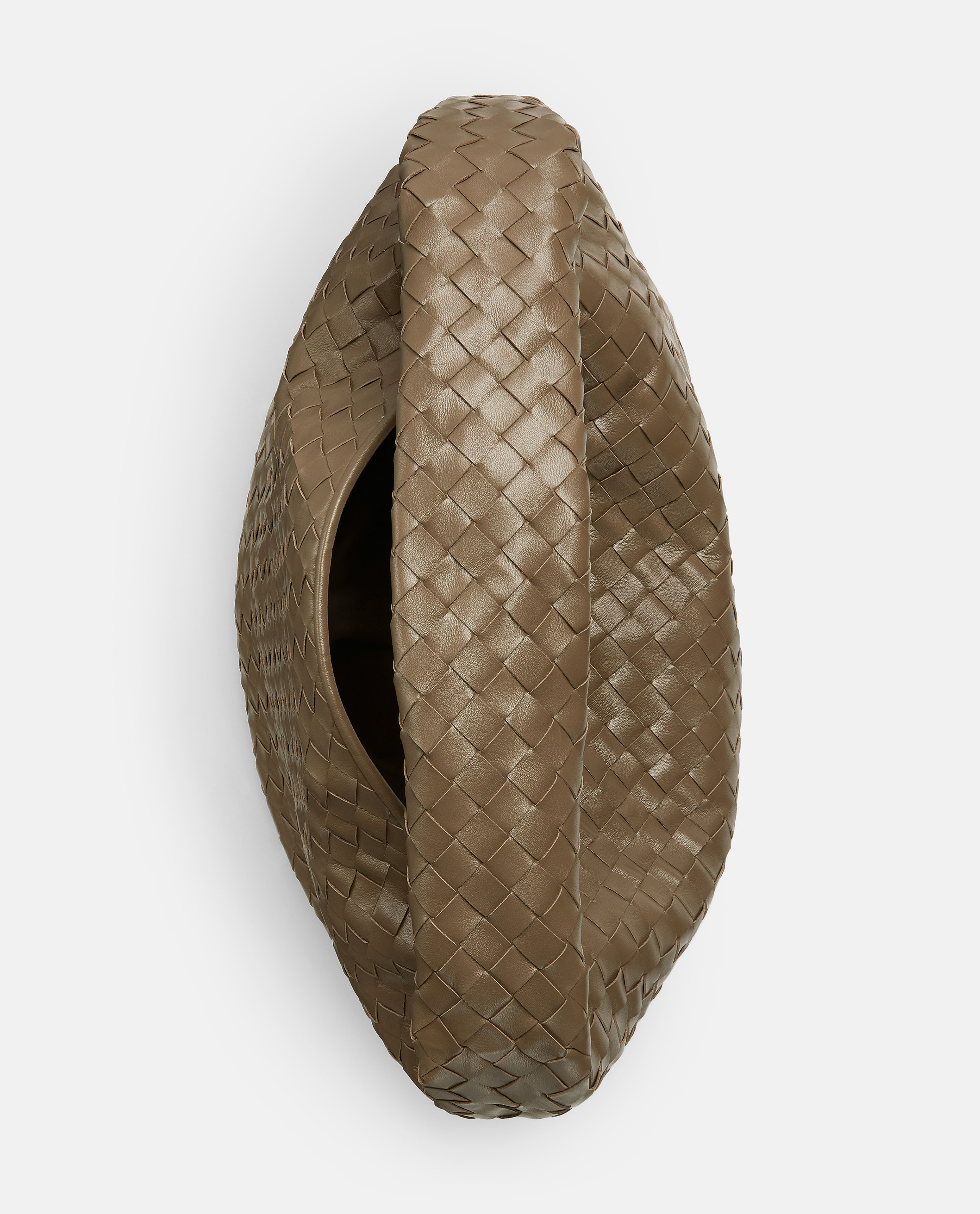 Brown Hop shoulder bag by Bottega Veneta. Braided calfskin pattern and magnetic closure. Brass metal accessories. New Arrivals SS25.