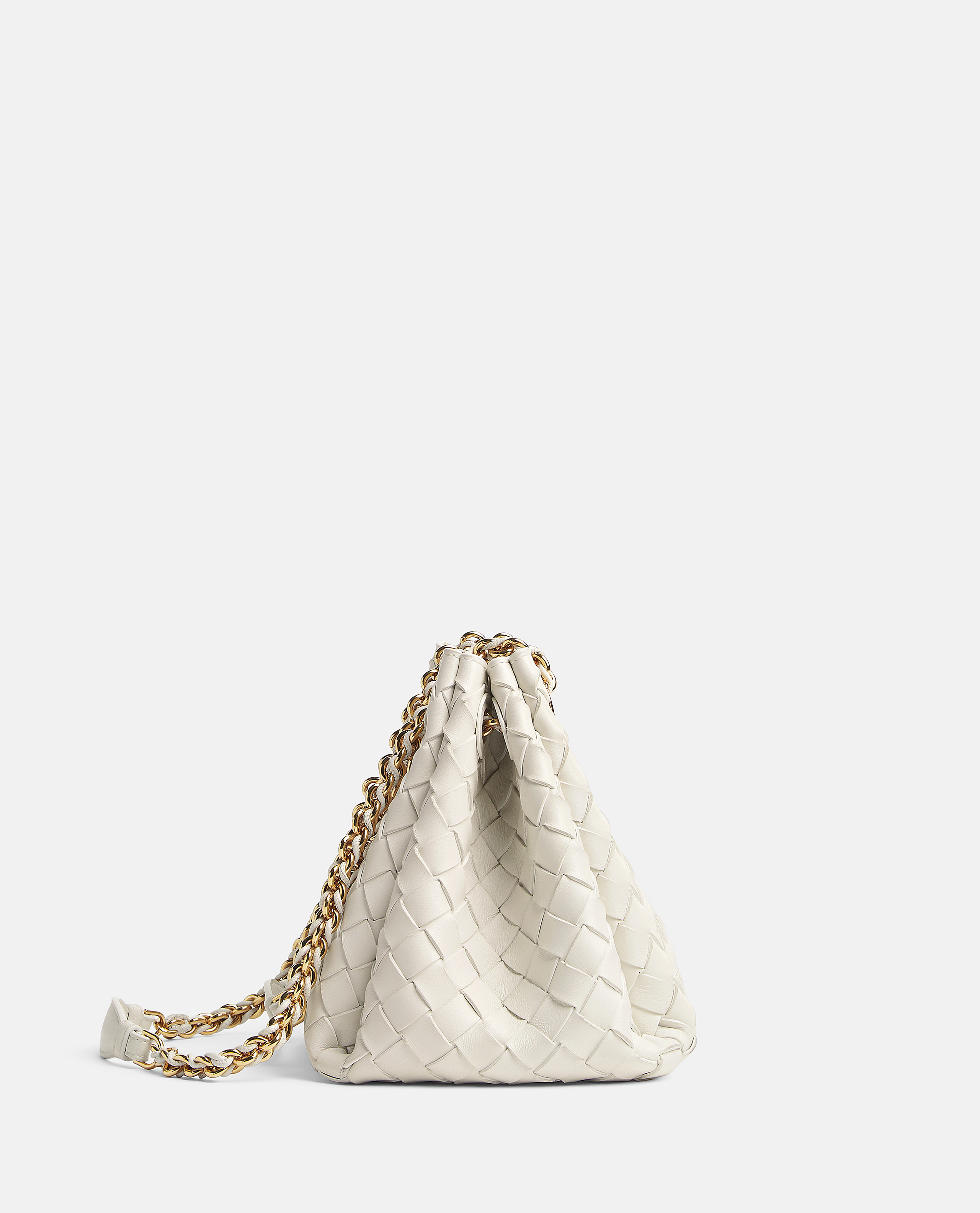 Small white Parachute shoulder bag by Bottega Veneta. Made of lambskin with magnetic closure. Brass metal accessories. New Arrivals SS25.