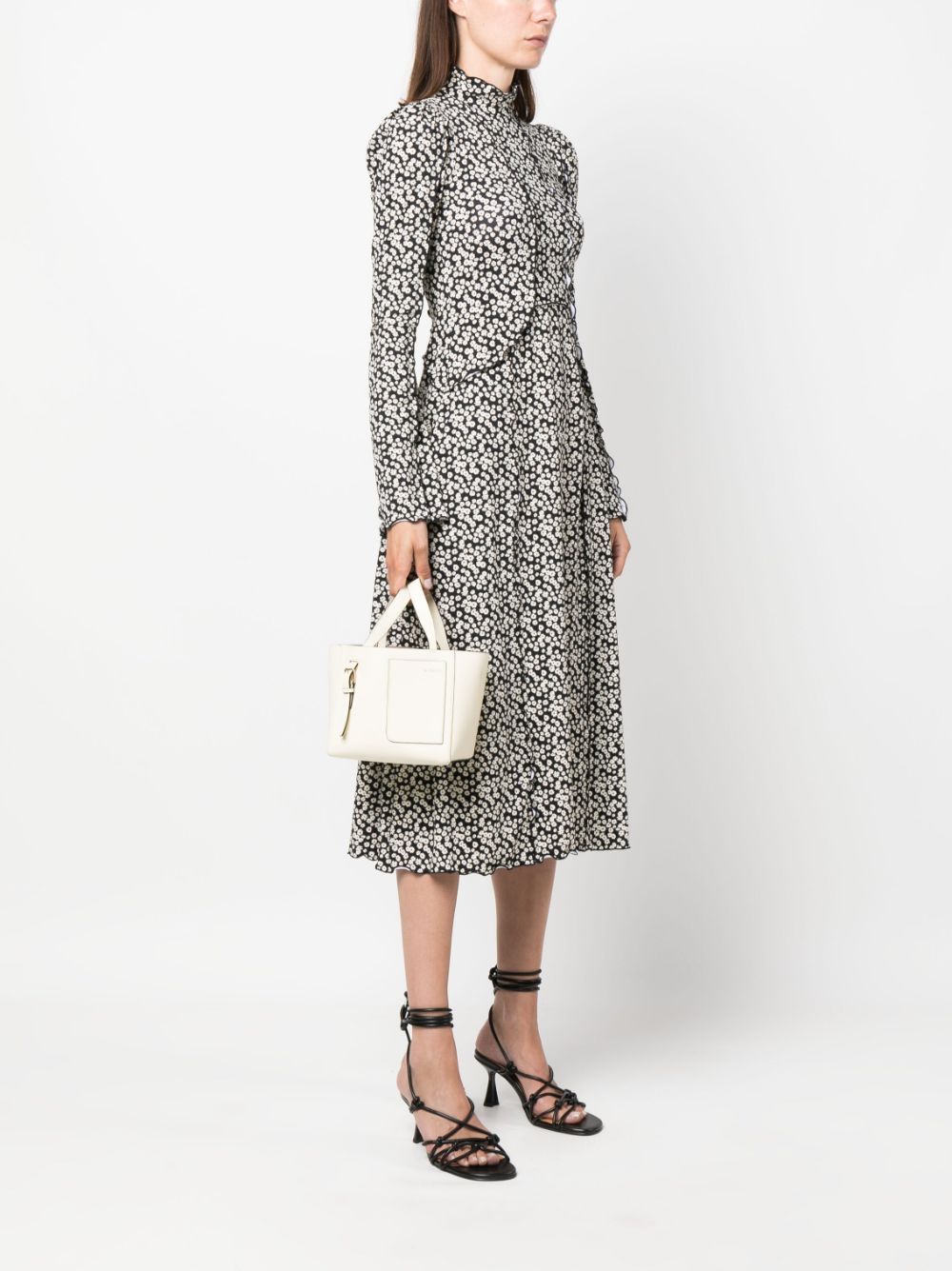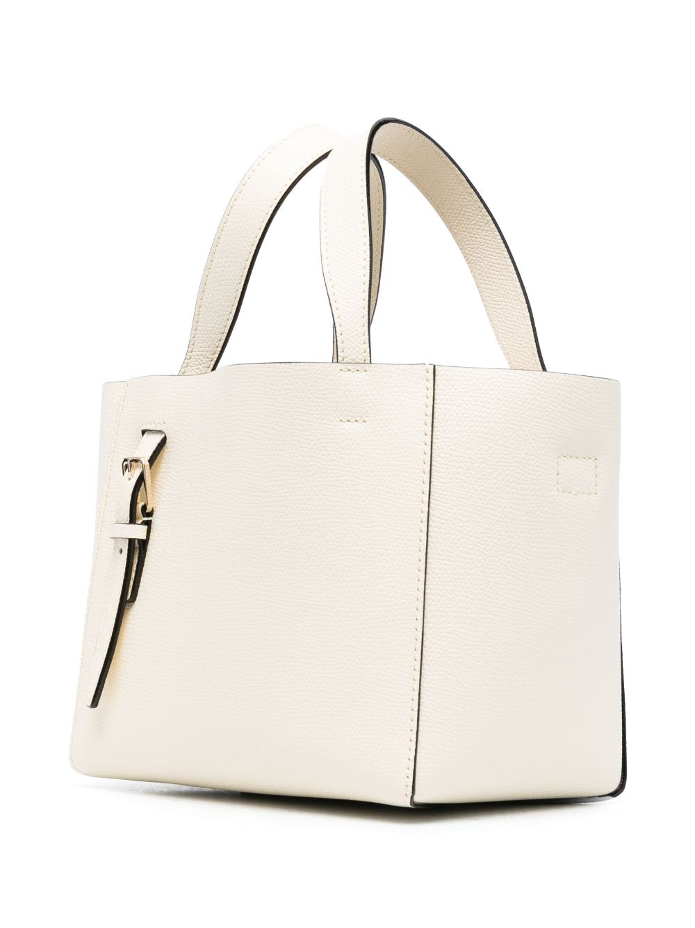 Bucket crossbody micro tote bag from VALEXTRA featuring decorative buckle detailing, two flat top handles, top zip fastening, front patch pocket, adjustable shoulder strap, ivory white and calf leather.