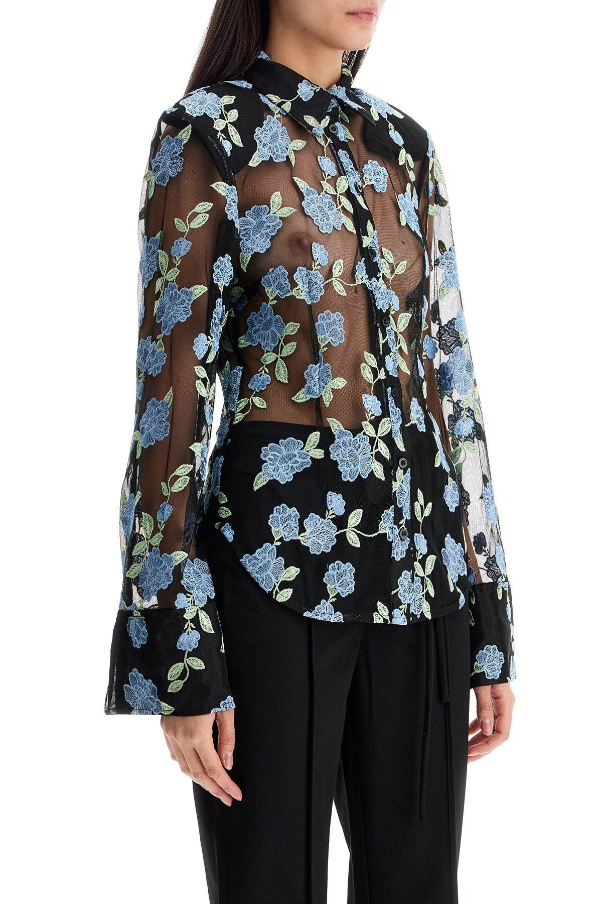 The black mesh shirt by ROTATE offers timeless elegance with floral embroidery on sheer fabric