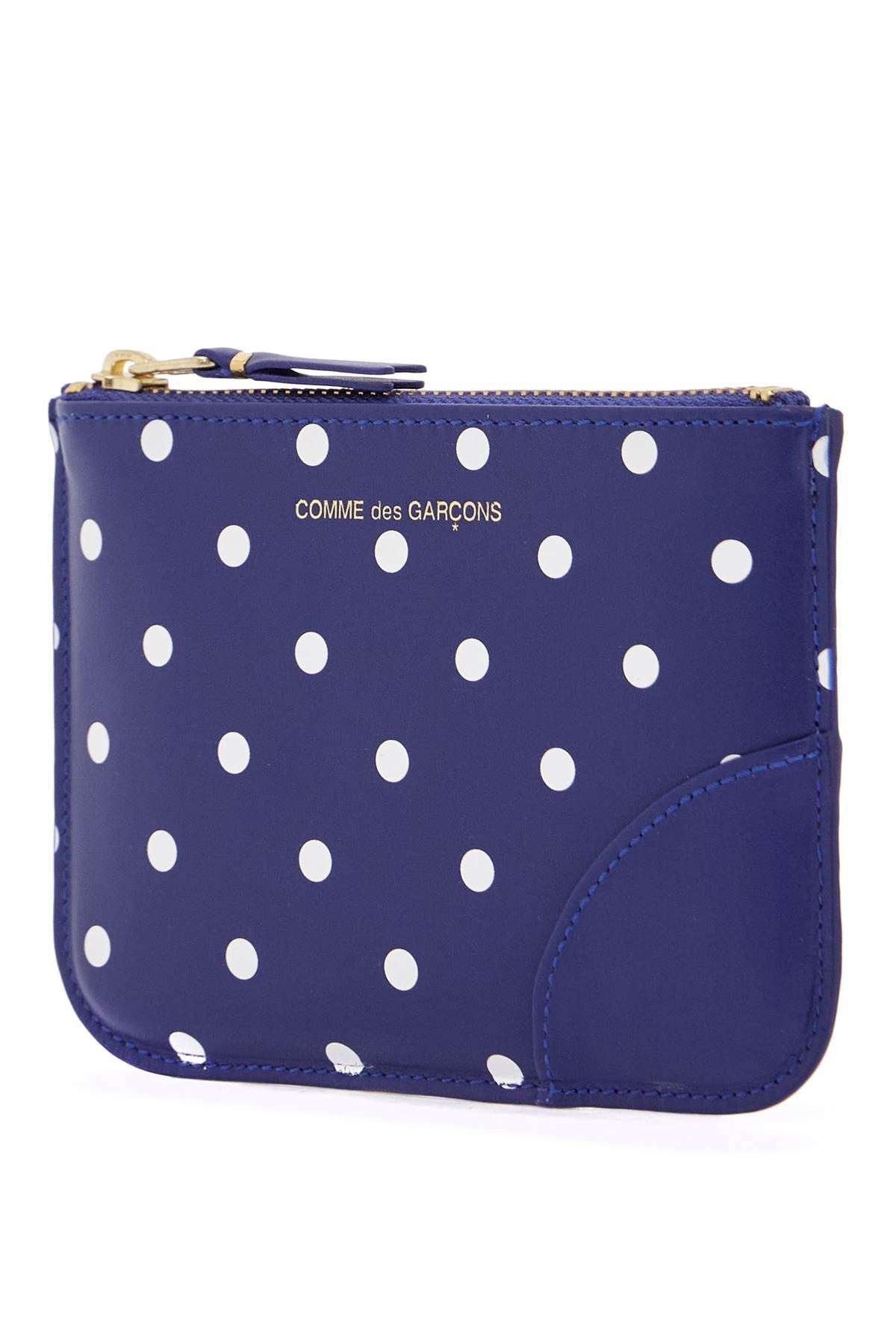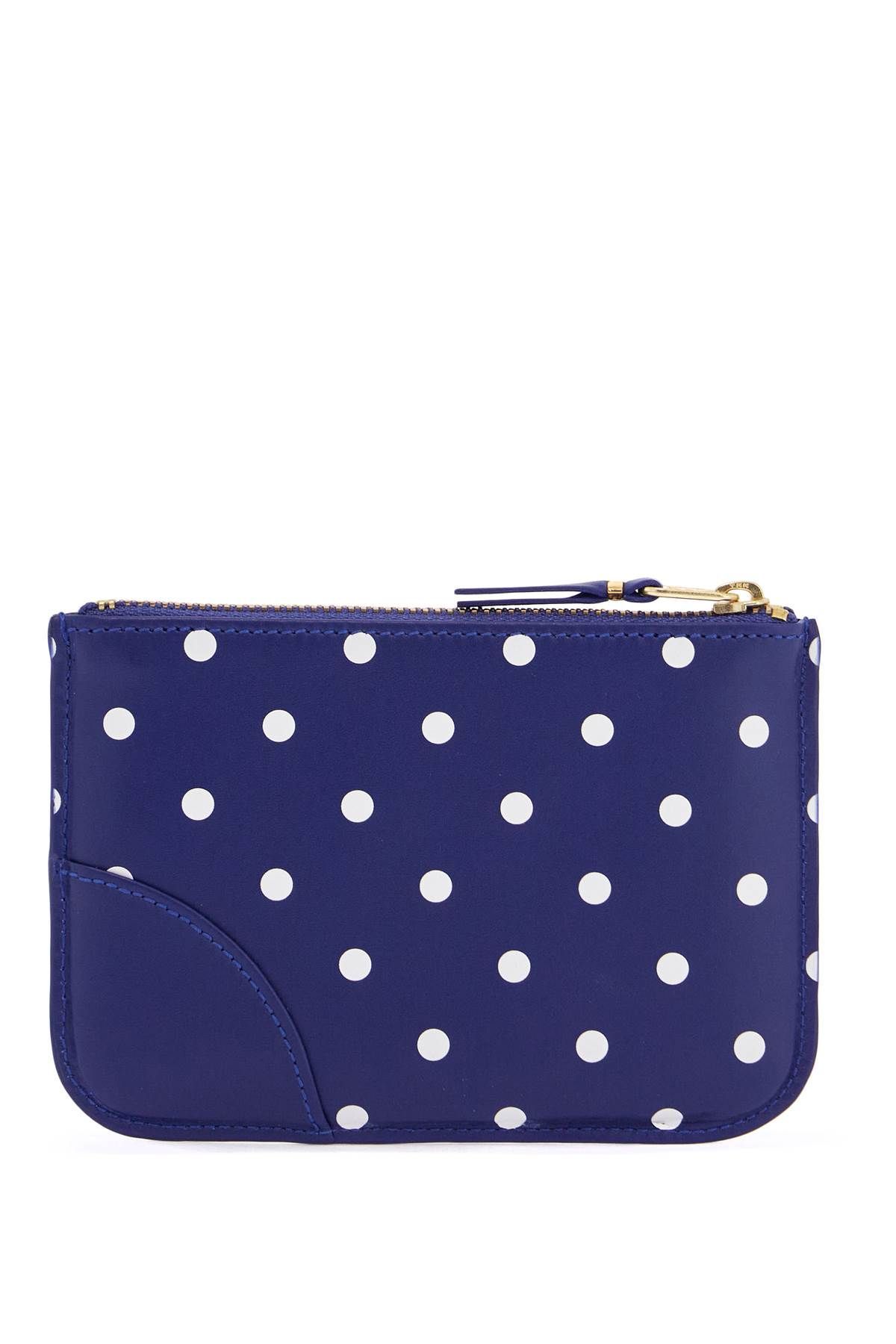 > portafoglio in pelle di vitello blu con pois bianchi e chiusura zip