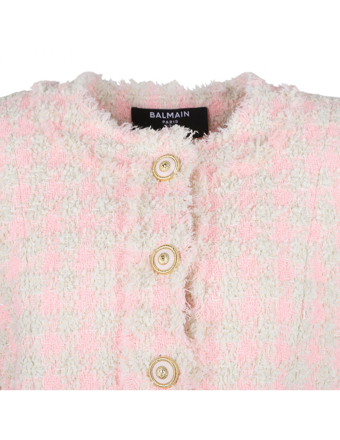 Rose and beige tweed jacket from Balmain featuring gold metal double chain lion buttons, round neckline, structured shoulders, long sleeves, buttoned cuffs, front fastening with press studs, raw hem.