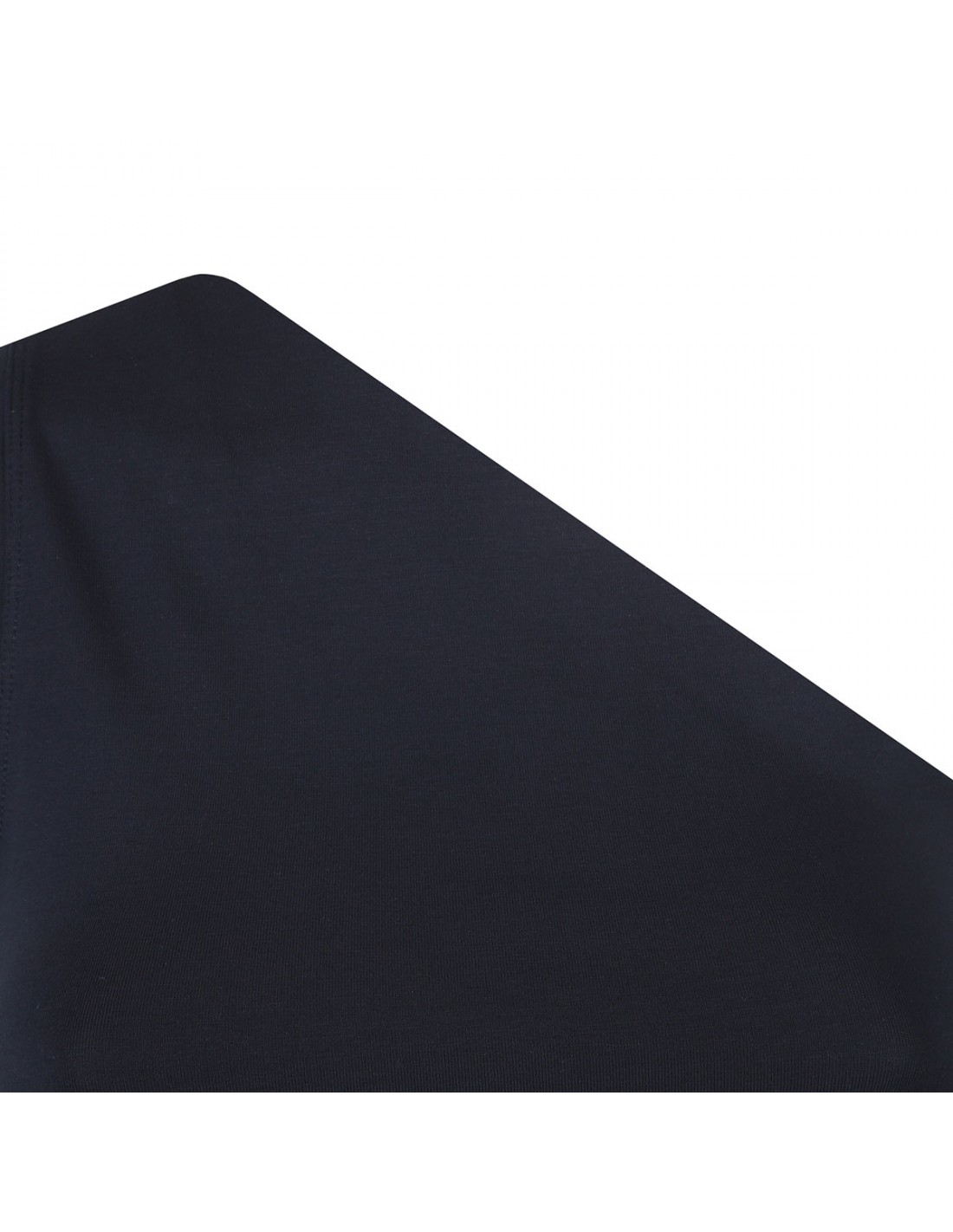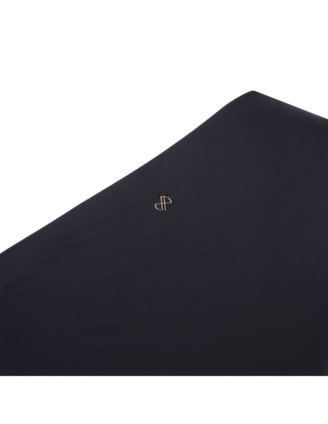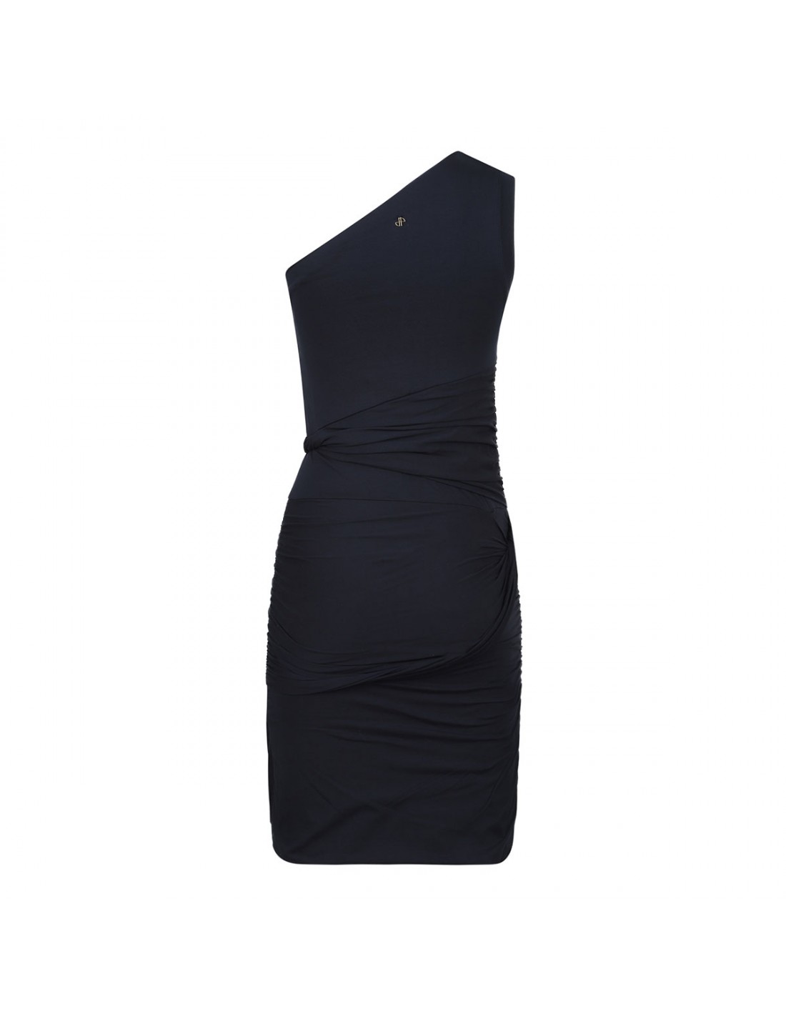 Black draped dress from Patou featuring one-shoulder style, sleeveless design, fitted silhouette, small JP logo monogram on back.