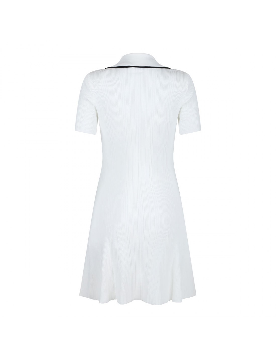 White slightly stretch ribbed knit viscose mini dress from Self-Portrait featuring button closure at front, lapel, sculpted fit, functional pockets, flared hem, contrast piping, detachable shoulder pads.