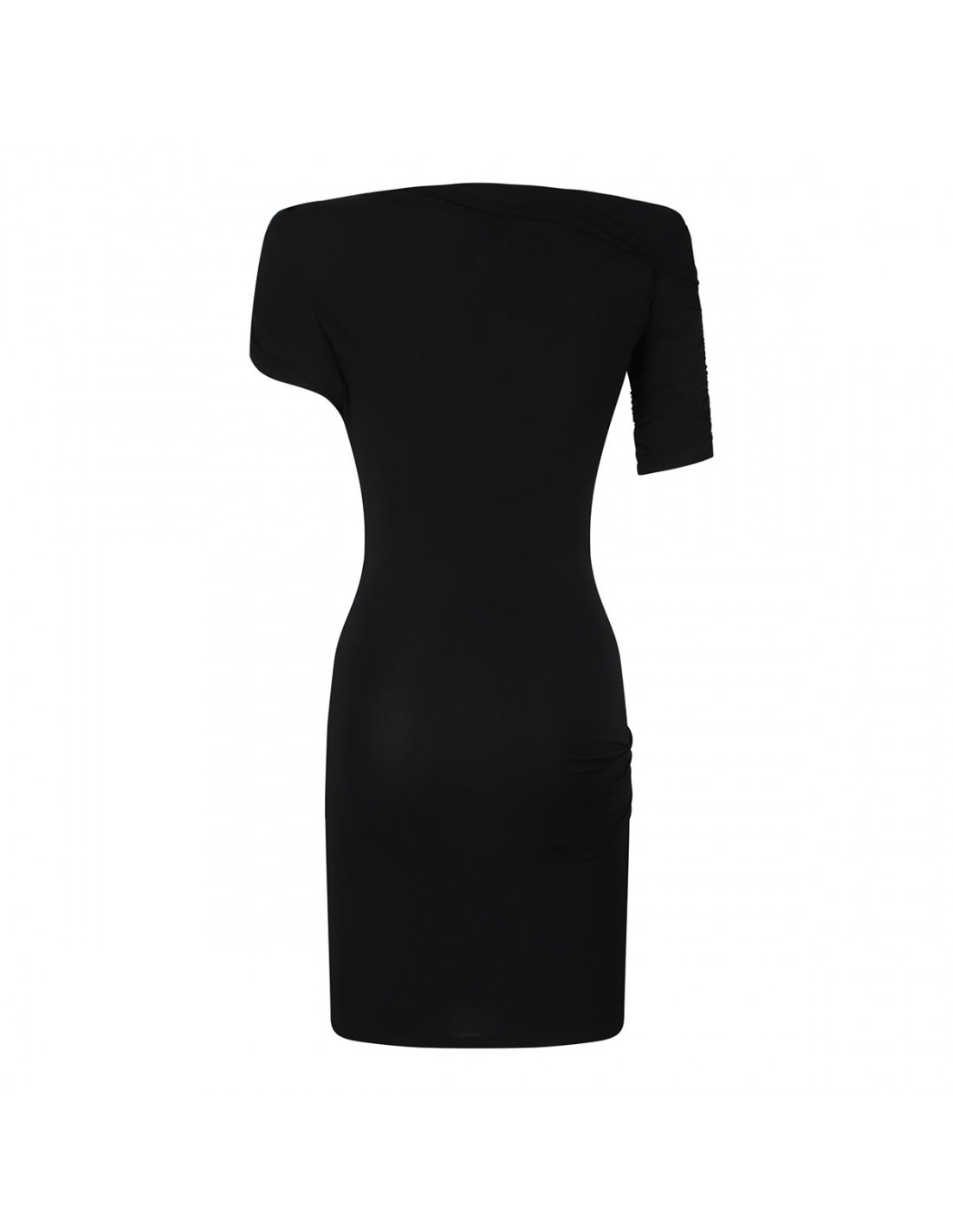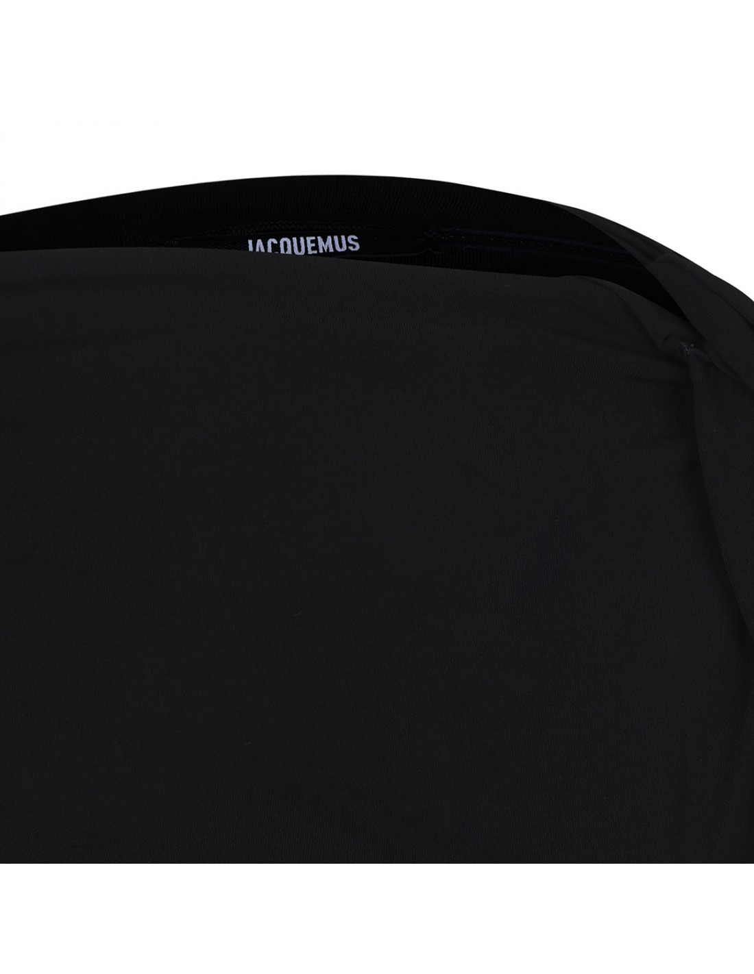 The drapeado mini dress from Jacquemus featuring fitted draped silhouette, draped asymmetric boat neckline, knotted neckline detail on left shoulder, gathered elbow-length sleeve on right side, pleated detail on side.