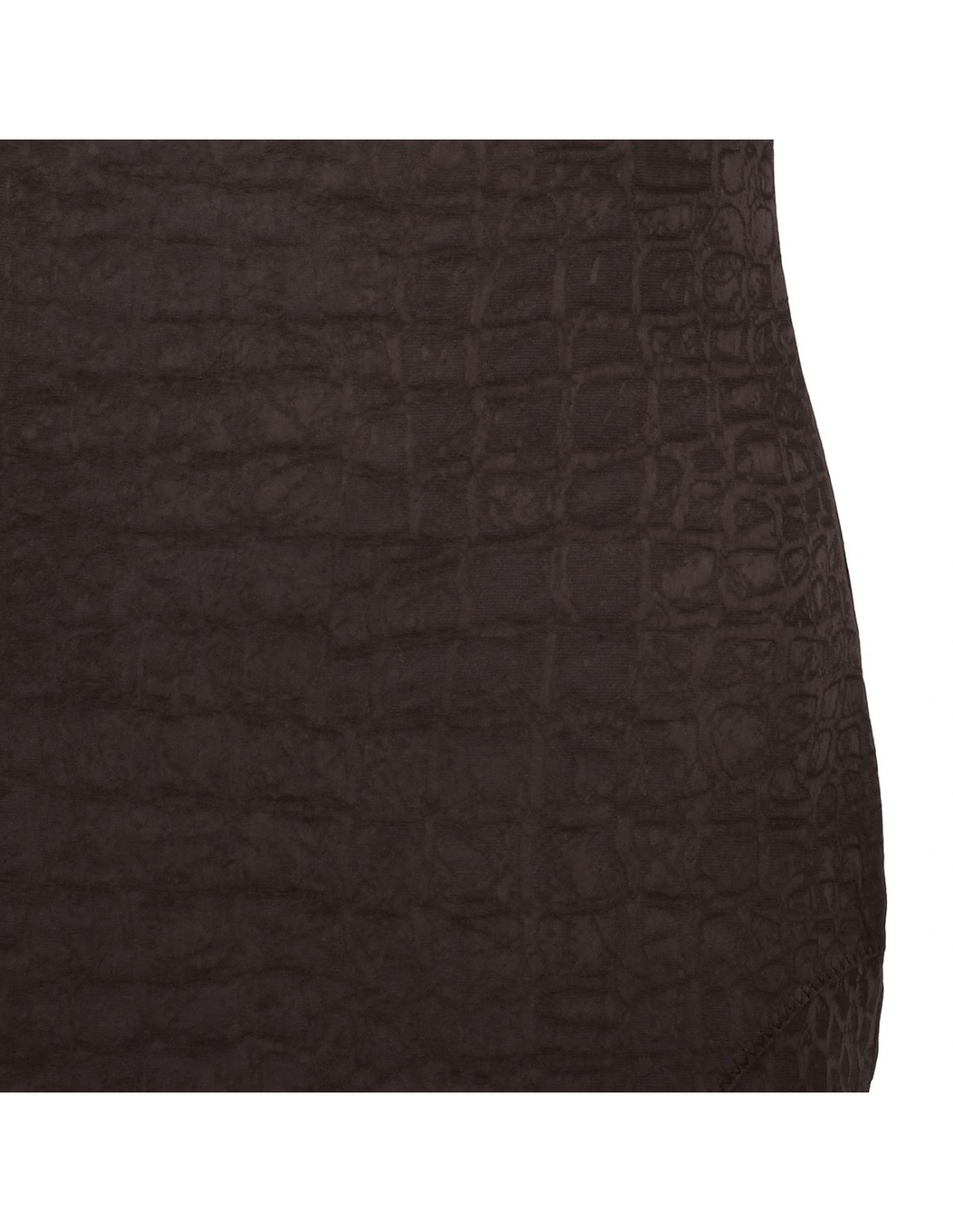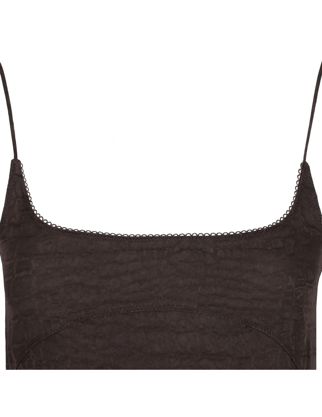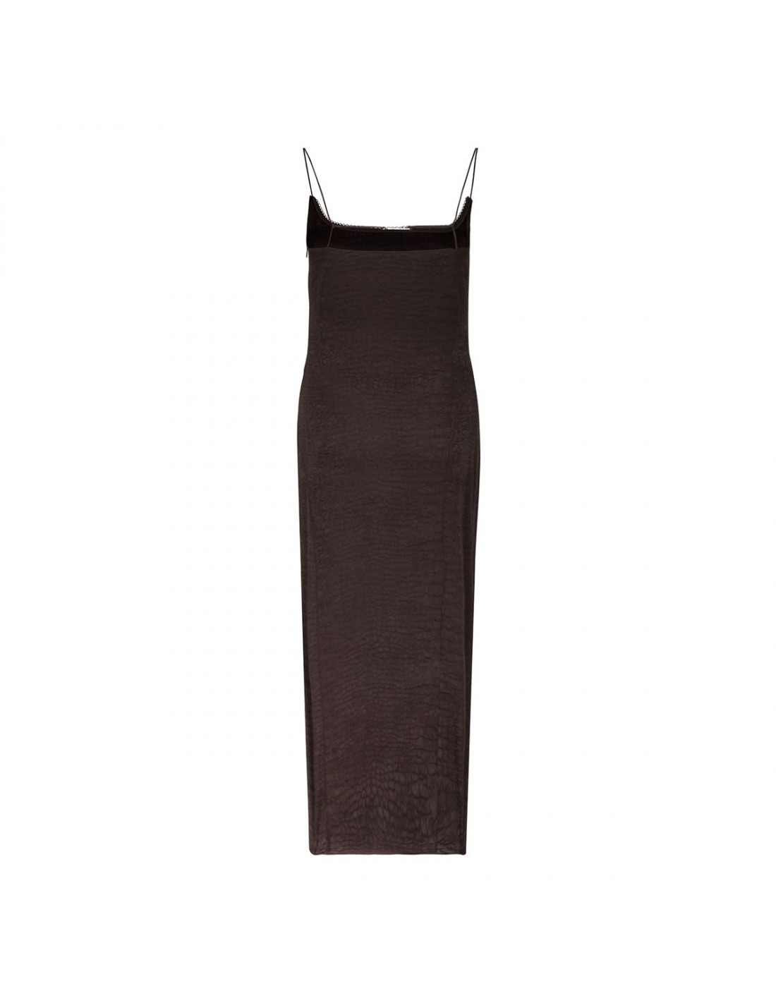 Chocolate brown crocodile viscose jacquard The Notte dress from Jacquemus featuring calf length, spaghetti straps with gold metal charm logo in the back, fitted shape, scalloped neckline and side slit, concealed zip fastening at side.