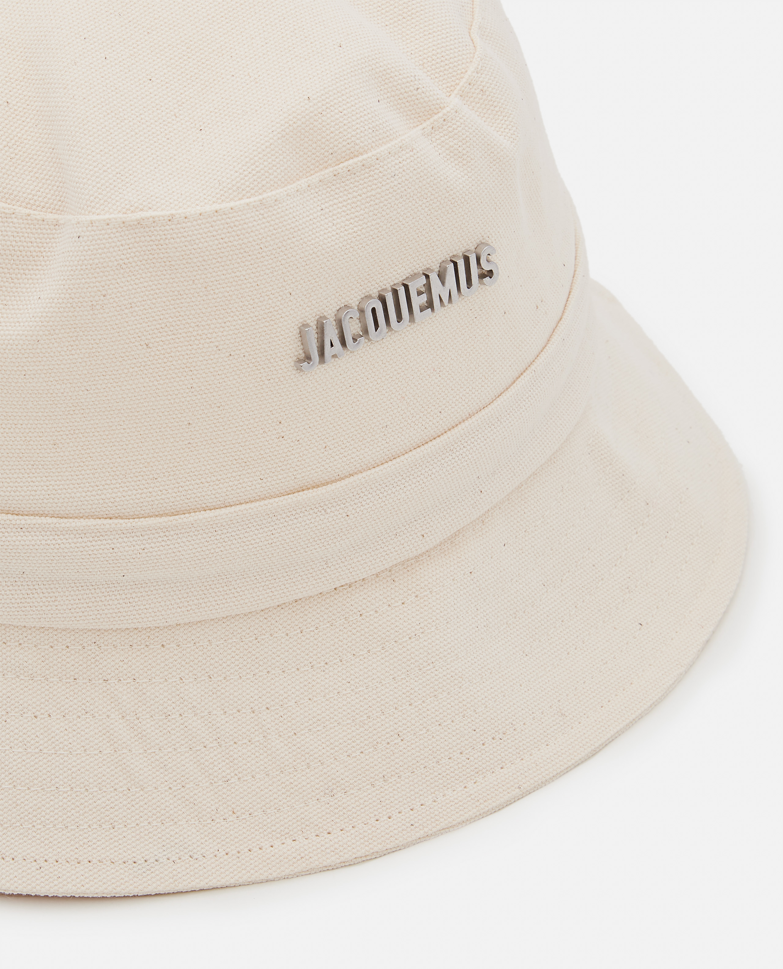 Cotton bucket hat.Silver metal logo.Visible topstitched drawcord in the back that can be. tied in a bow.Topstitched brim.Color: white.