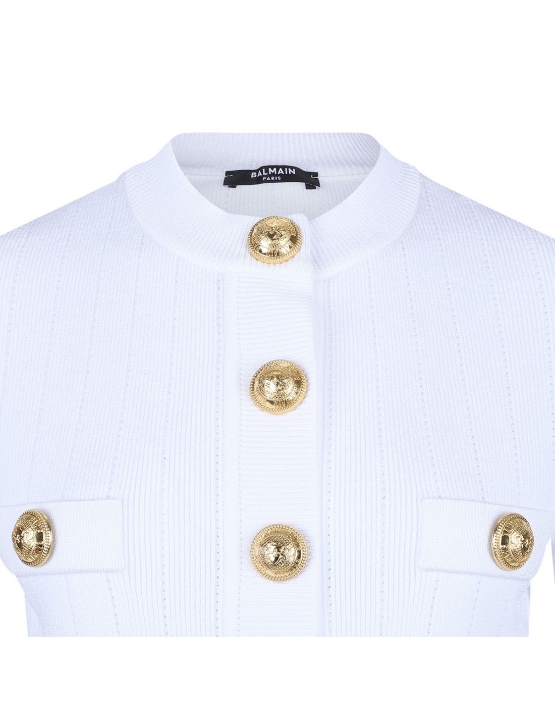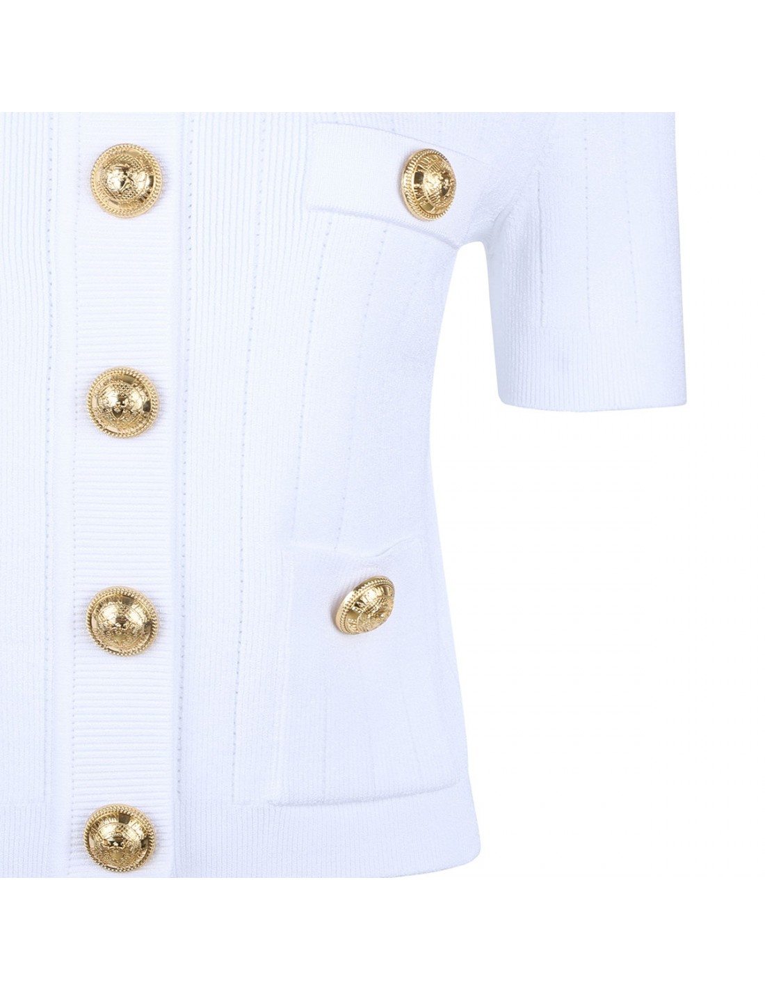 White ribbed knit cardigan from Balmain featuring gold metal signature coin button fastening, fitted silhouette, crew collar, fake pockets with buttons, structured shoulders and short sleeves.