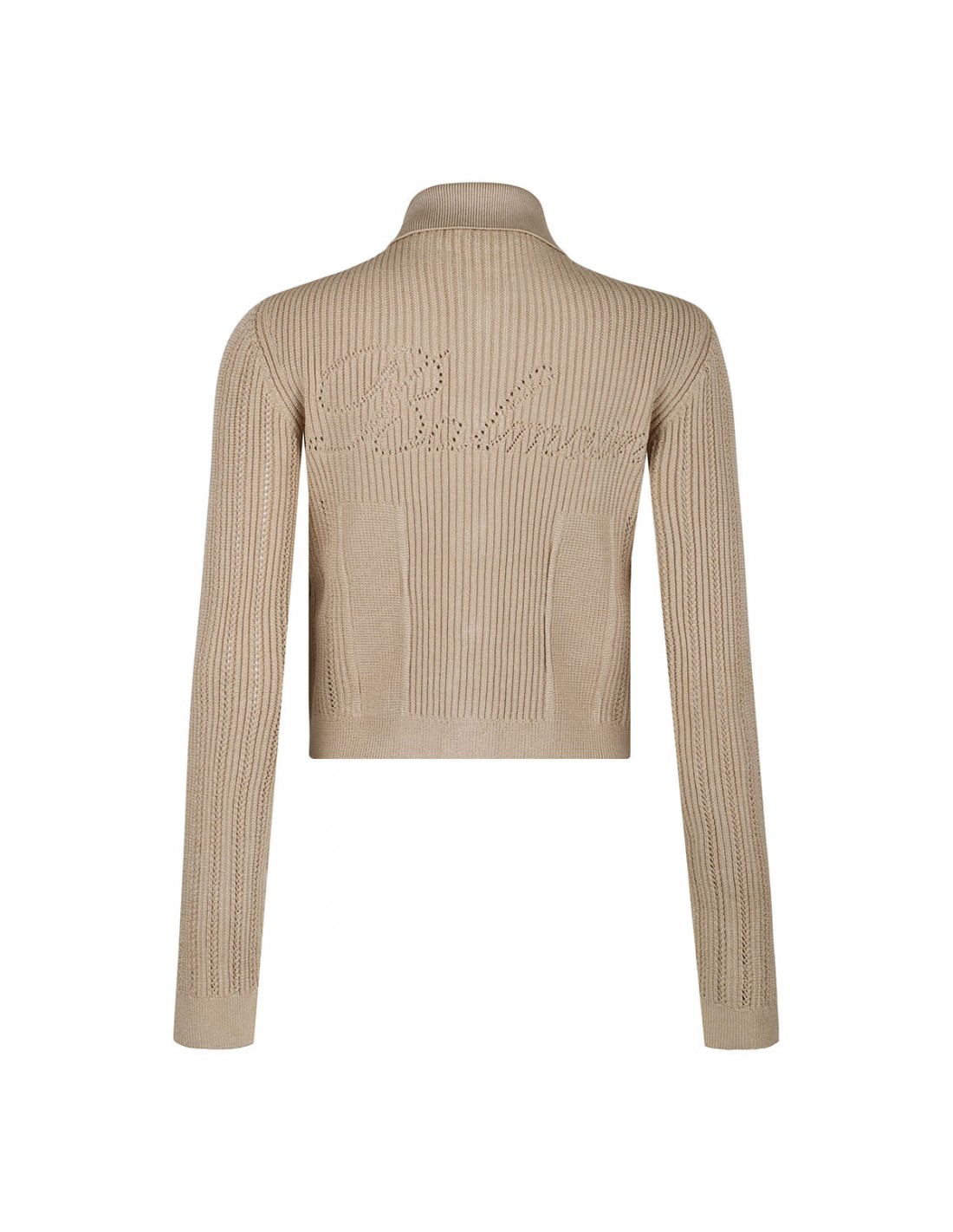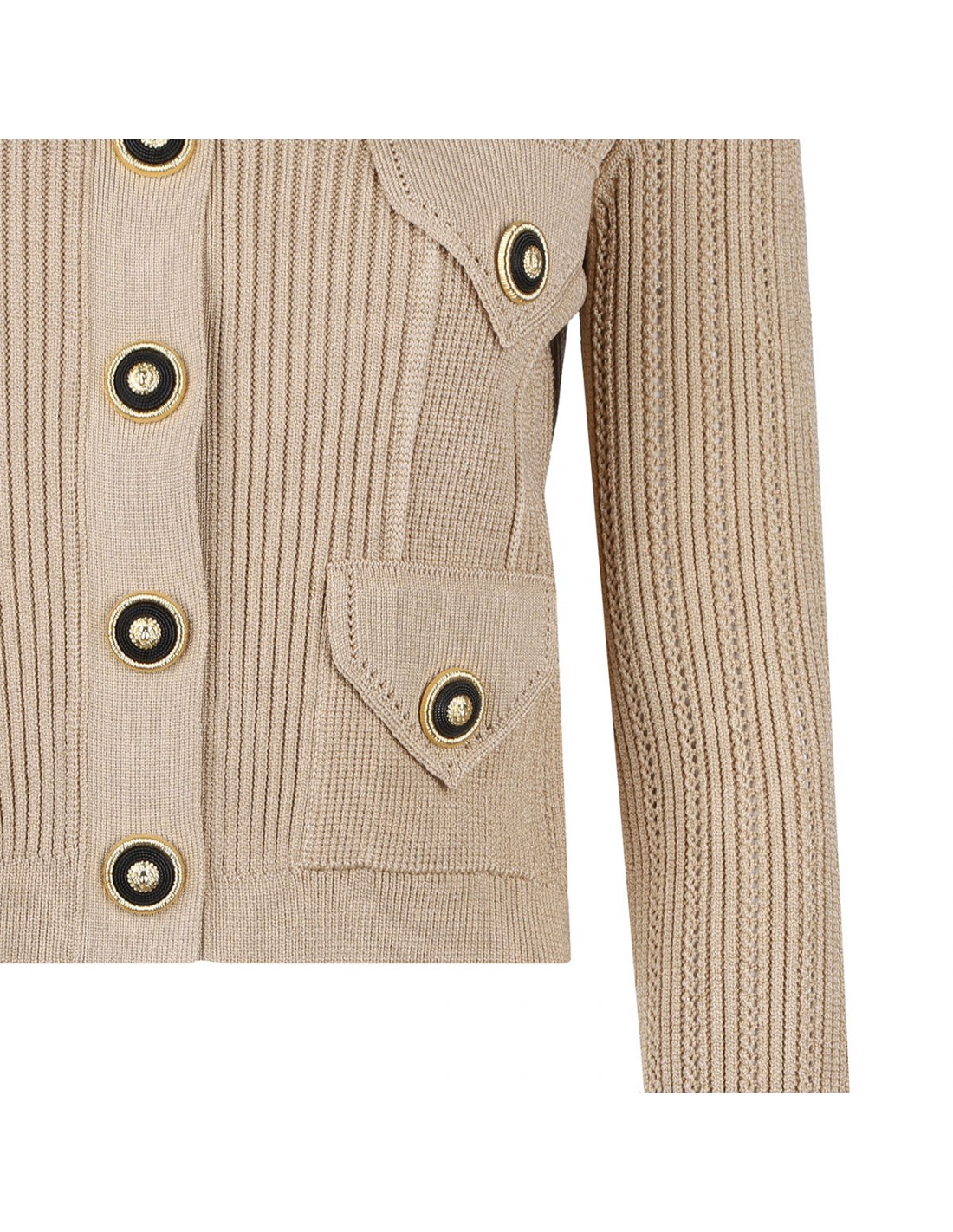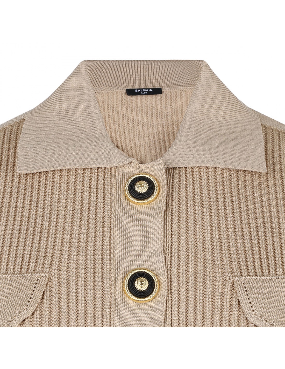 Beige ribbed openwork knit cardigan from Balmain featuring cropped slim fit, shirt pointed collar, long openwork knit sleeves, press stud fastening, chest pockets with fake flaps, patch pockets with press-stud flaps, two-tone metal chain lion thread buttons, openwork signature logo on back, ribbed-knit trims.