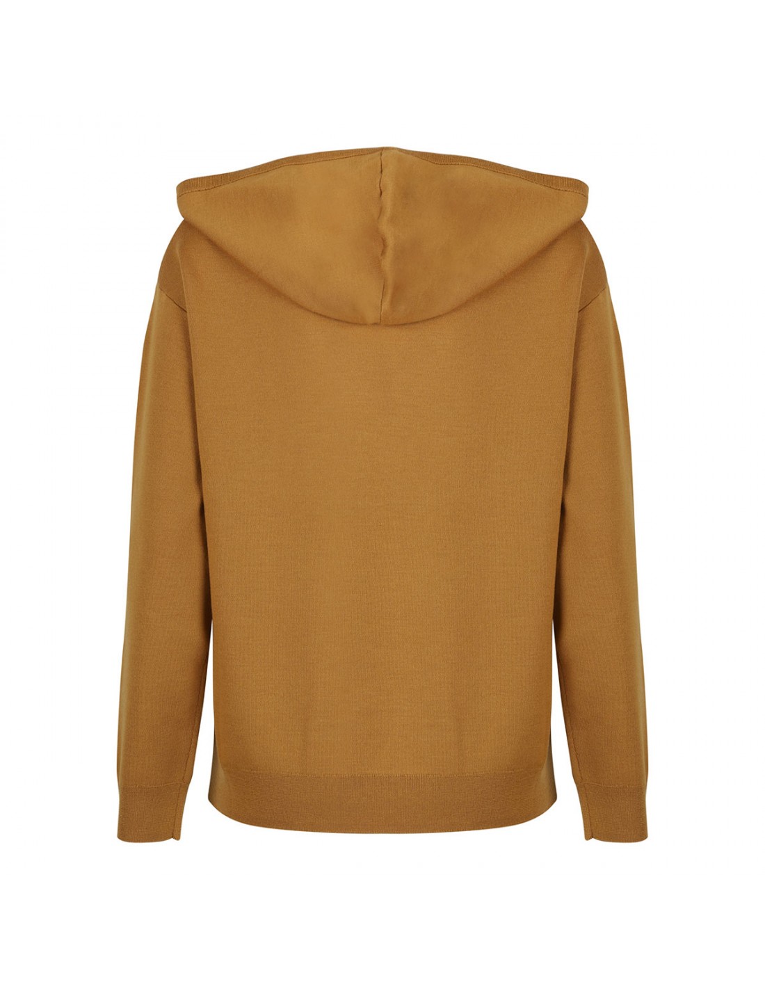 Amber hue pure wool Sfinge sweatshirt from Max Mara featuring hood with drawstring, MaxMaraGram motif jacquard and the Max Mara Resort 2025 logo on front, long sleeves, dropped shoulders and ribbed-knit edges.