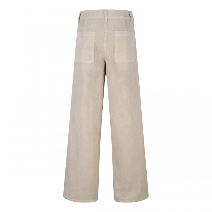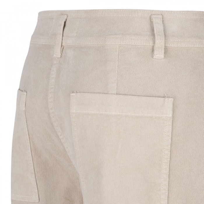 Ecru soft stretch corduroy Megan pants from Nili Lotan featuring mid-rise, wide leg, ankle length, fitted waist and hip, button closure and zip fly, back patch pockets and darts, belt loops on the waistband.