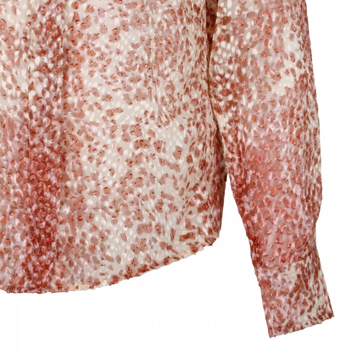 Light red and ecru devore velvet Ilda shirt from Isabel Marant featuring printed motif allover, stand-up collar, concealed button fastening, shoulder yokes, long sleeves with buttoned cuffs, rounded hem and flowing silhouette.