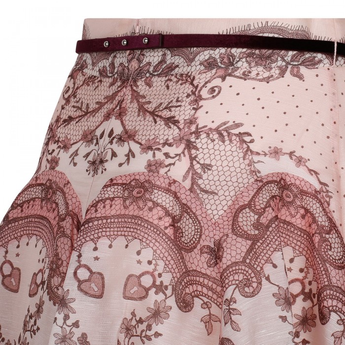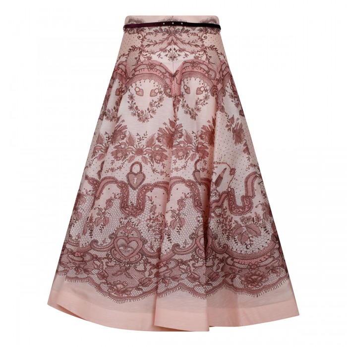 Pink silk linen organza Crush midi skirt from Zimmermann featuring lace print, side seam pockets, centre back concealed zip fastening, high rise, detachable velvet belt with crystal and bow details, crinoline along the hemline.