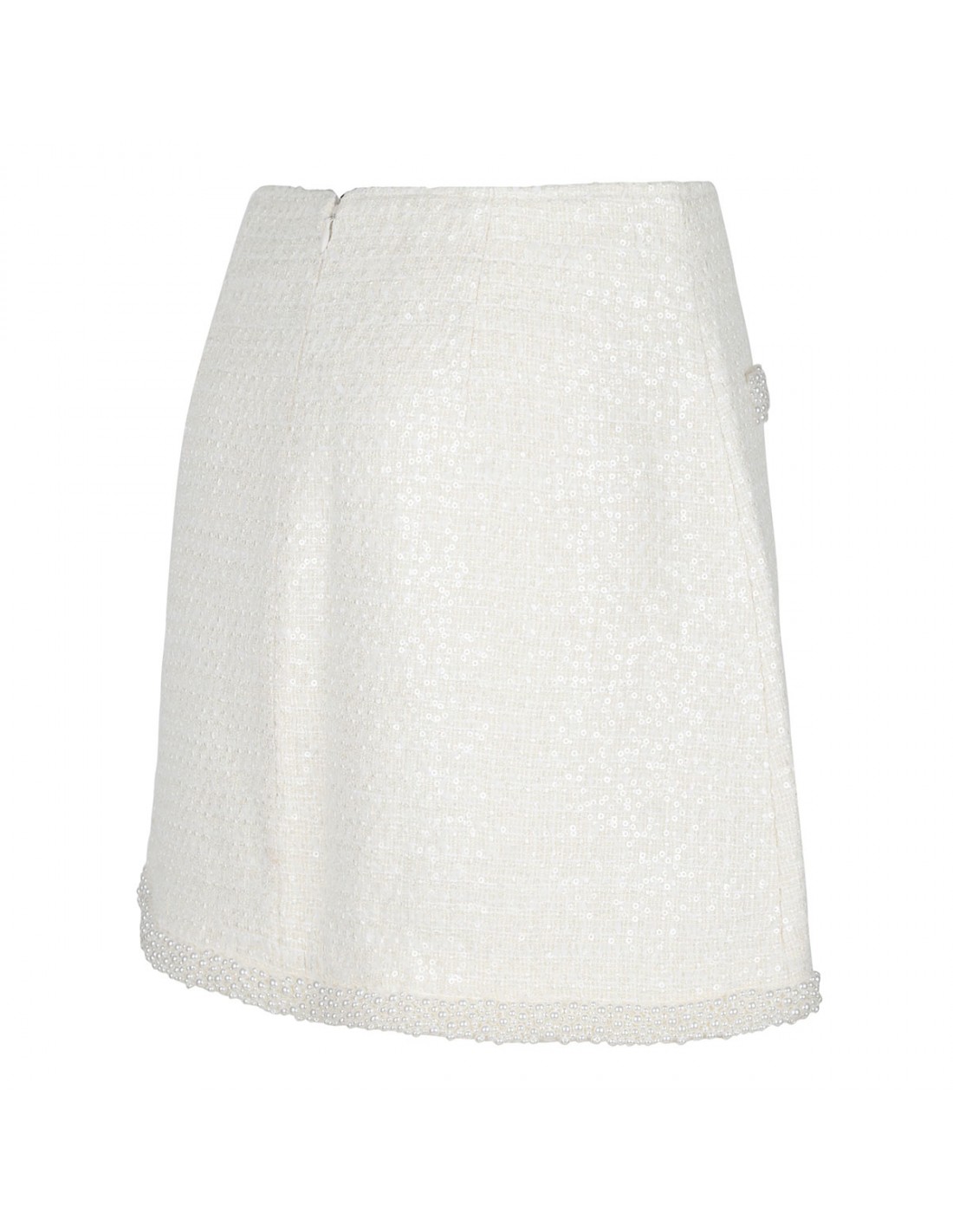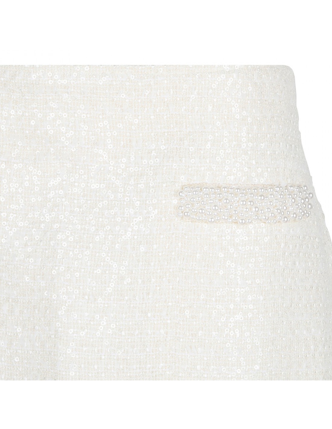 Cream boucle mini skirt from Self-Portrait featuring pearl trims, zip fastening at back, functional pockets, slightly flared silhouette.