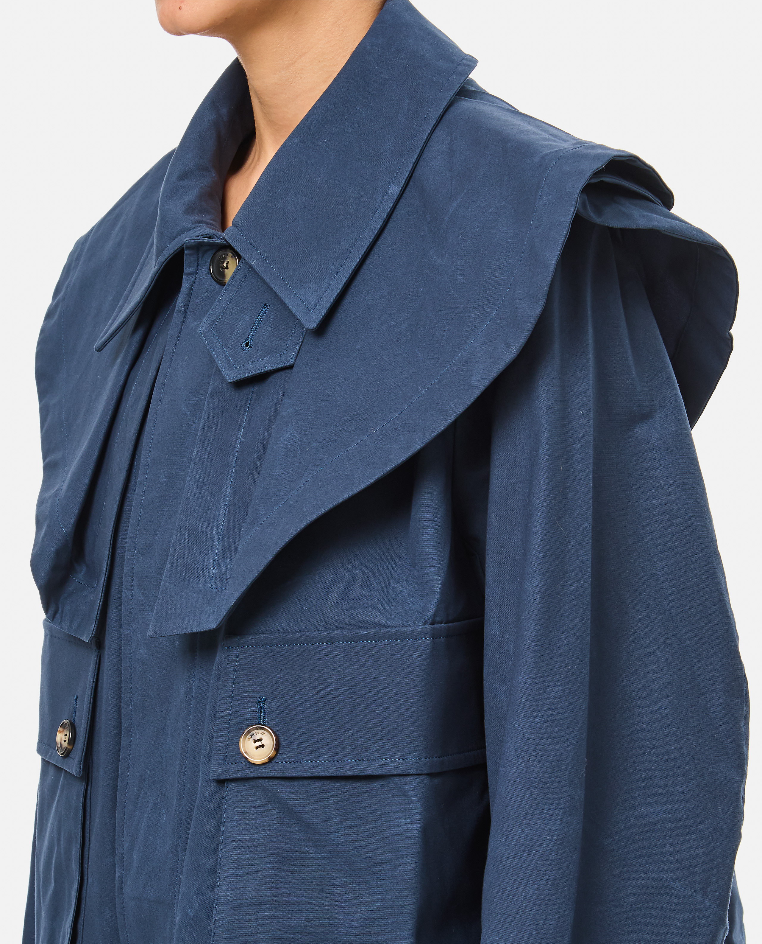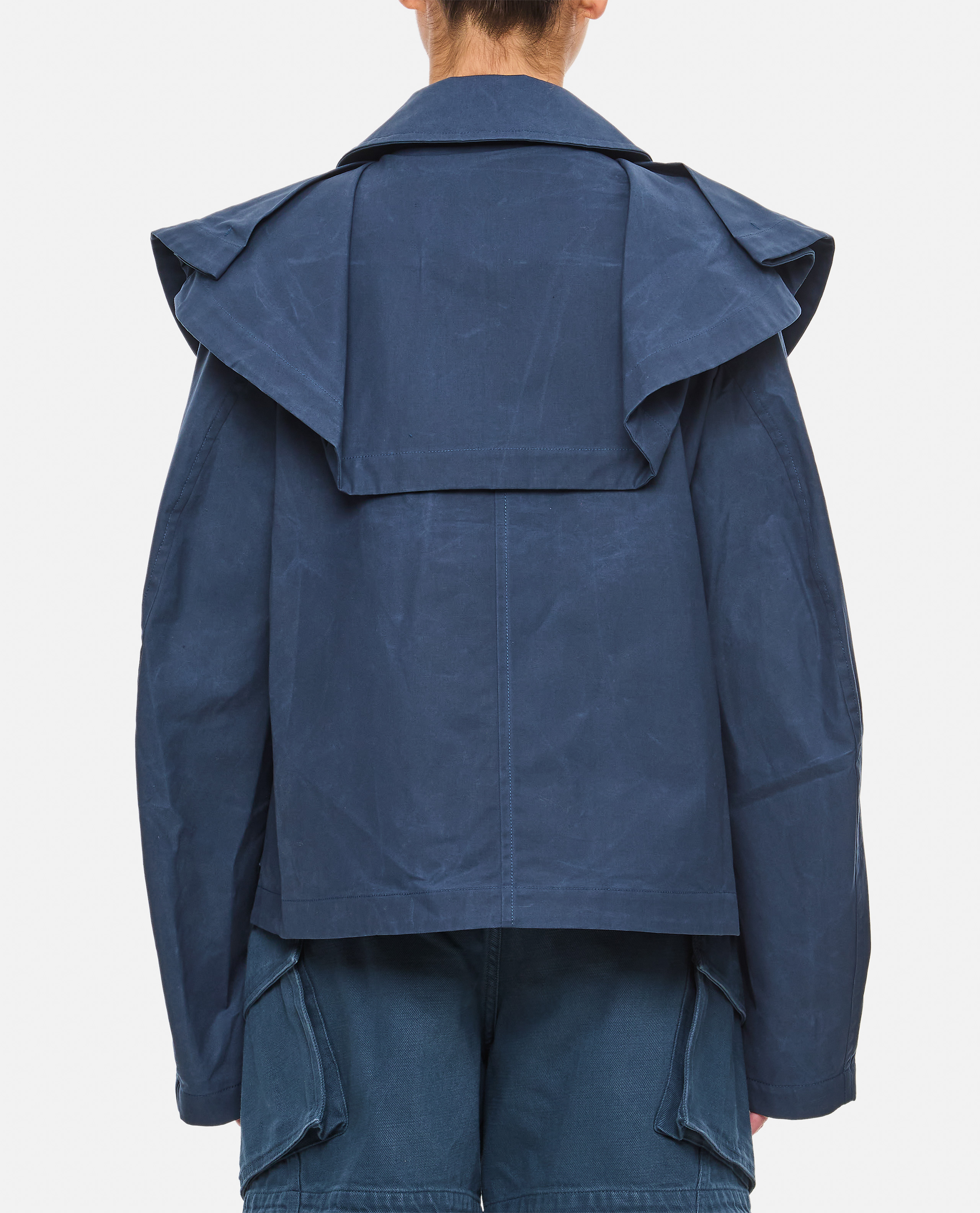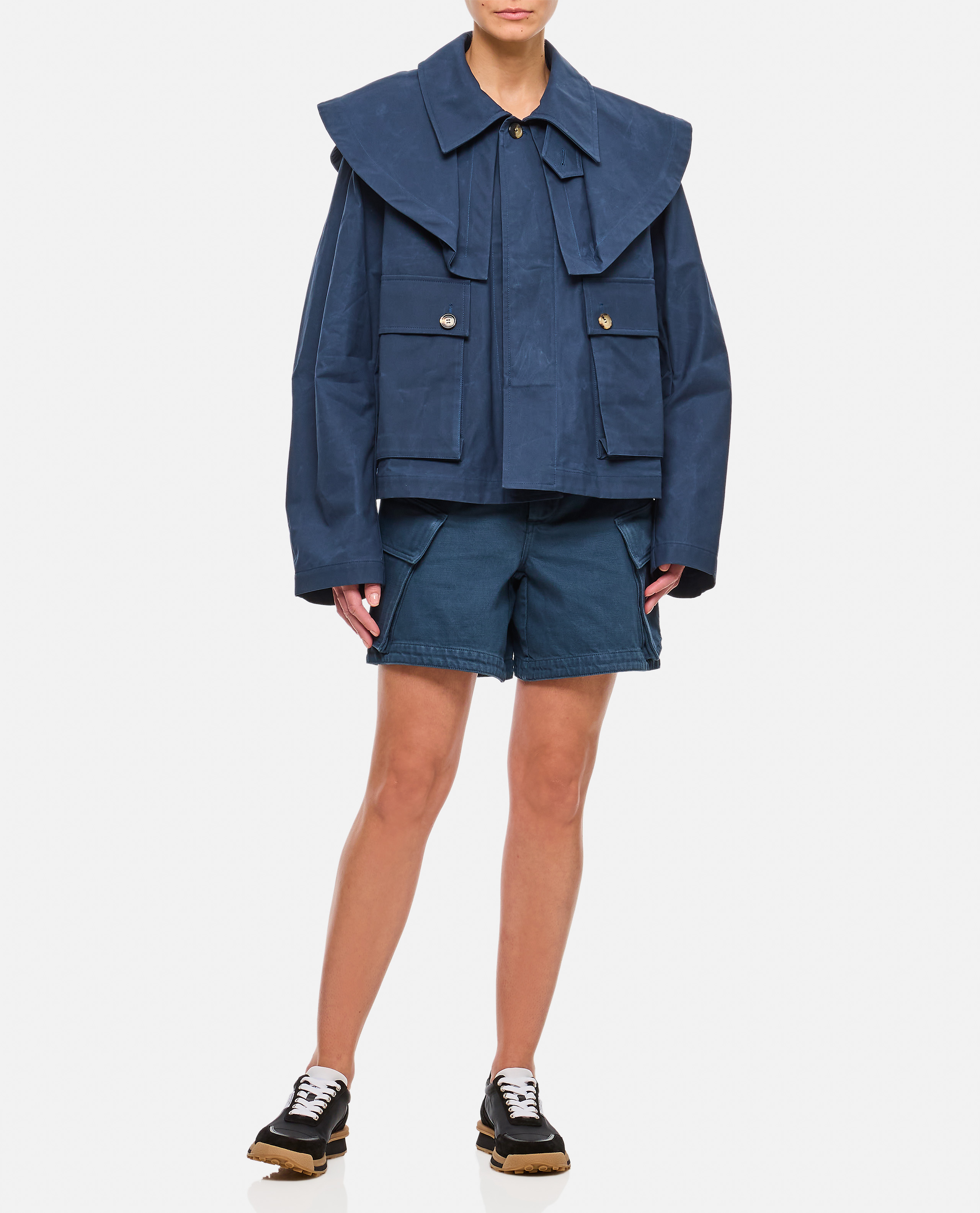 Cropped flared jacket with high neck design.Layered oversize collar.Horn buttons.Oversize flap pockets.Unlined design.Soft-line fit.