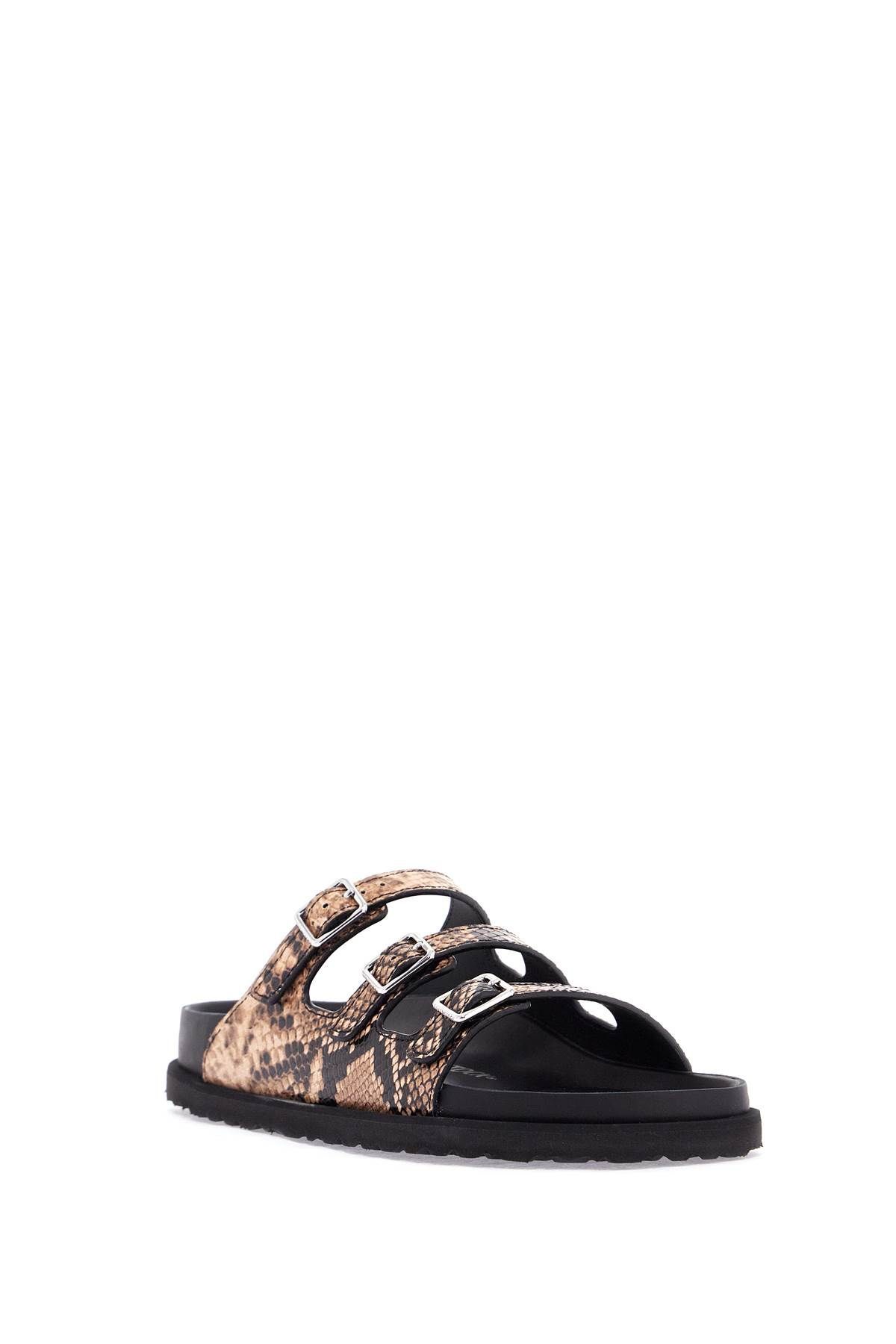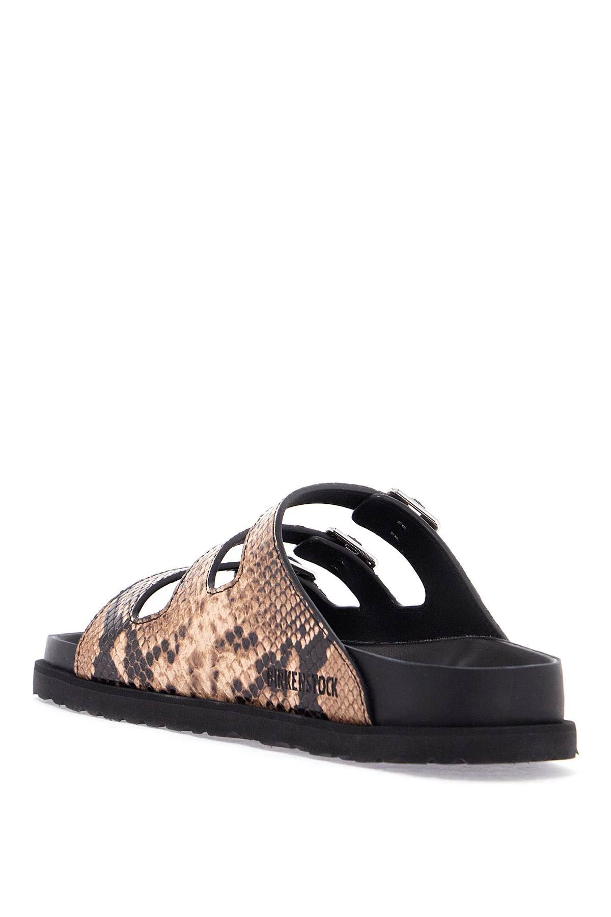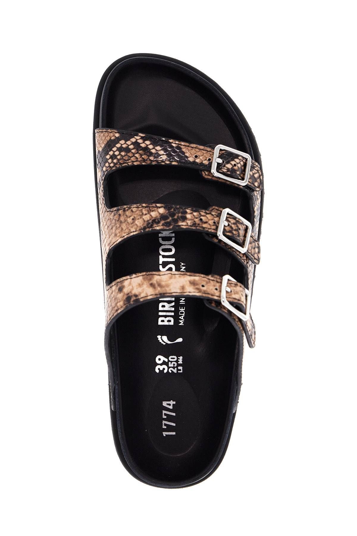 The Florida Lined slides from the Birkenstock 1774 collection are characterized by a snake print leather upper with three adjustable straps