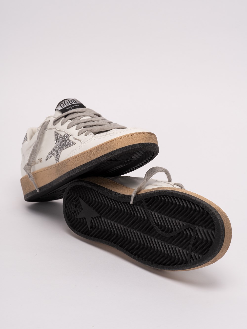 Ball Star low-top sneakers in white/black leather with silver glitter inserts, star patch on the sides, logo print on the back, round toe, front lace-up closure, logo patch on the tongue, insole and flat rubber sole.