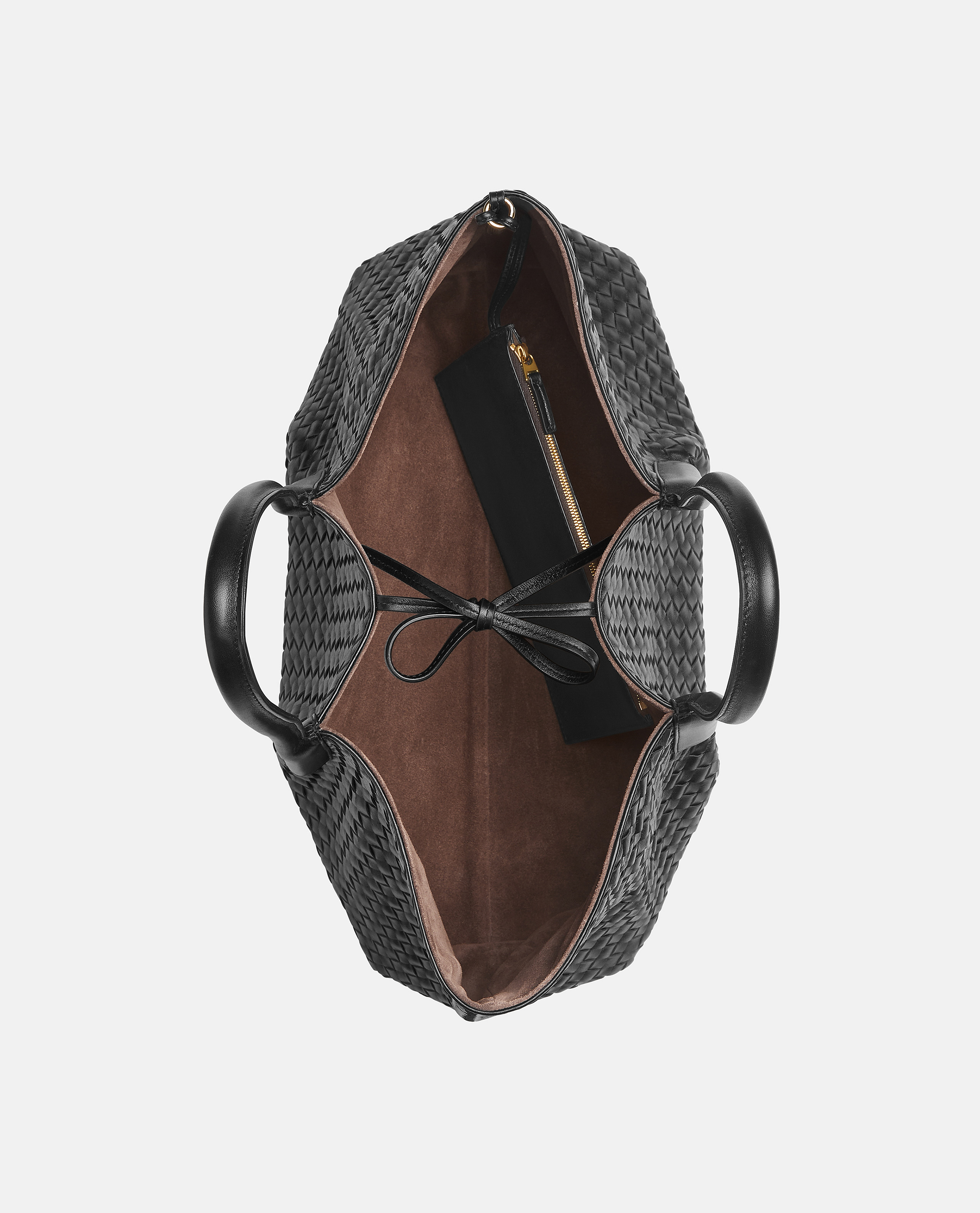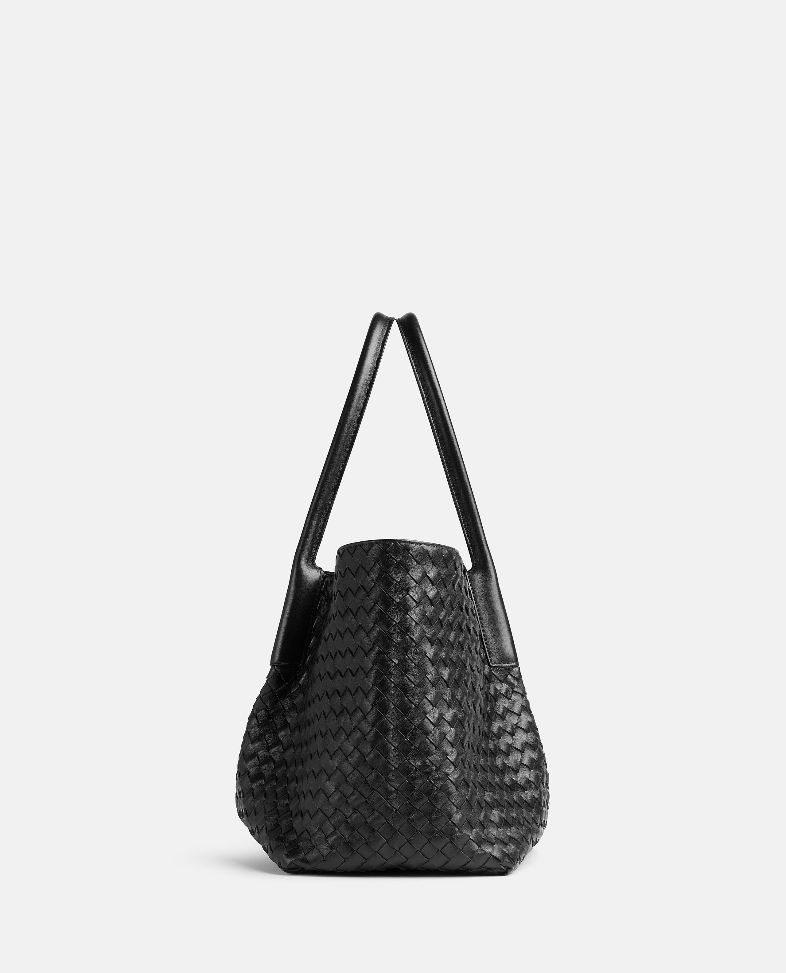 Pinacoteca large tote bag by Bottega Veneta. Reversible: black woven pattern exterior and brown suede interior. Calfskin. New Arrivals SS25.