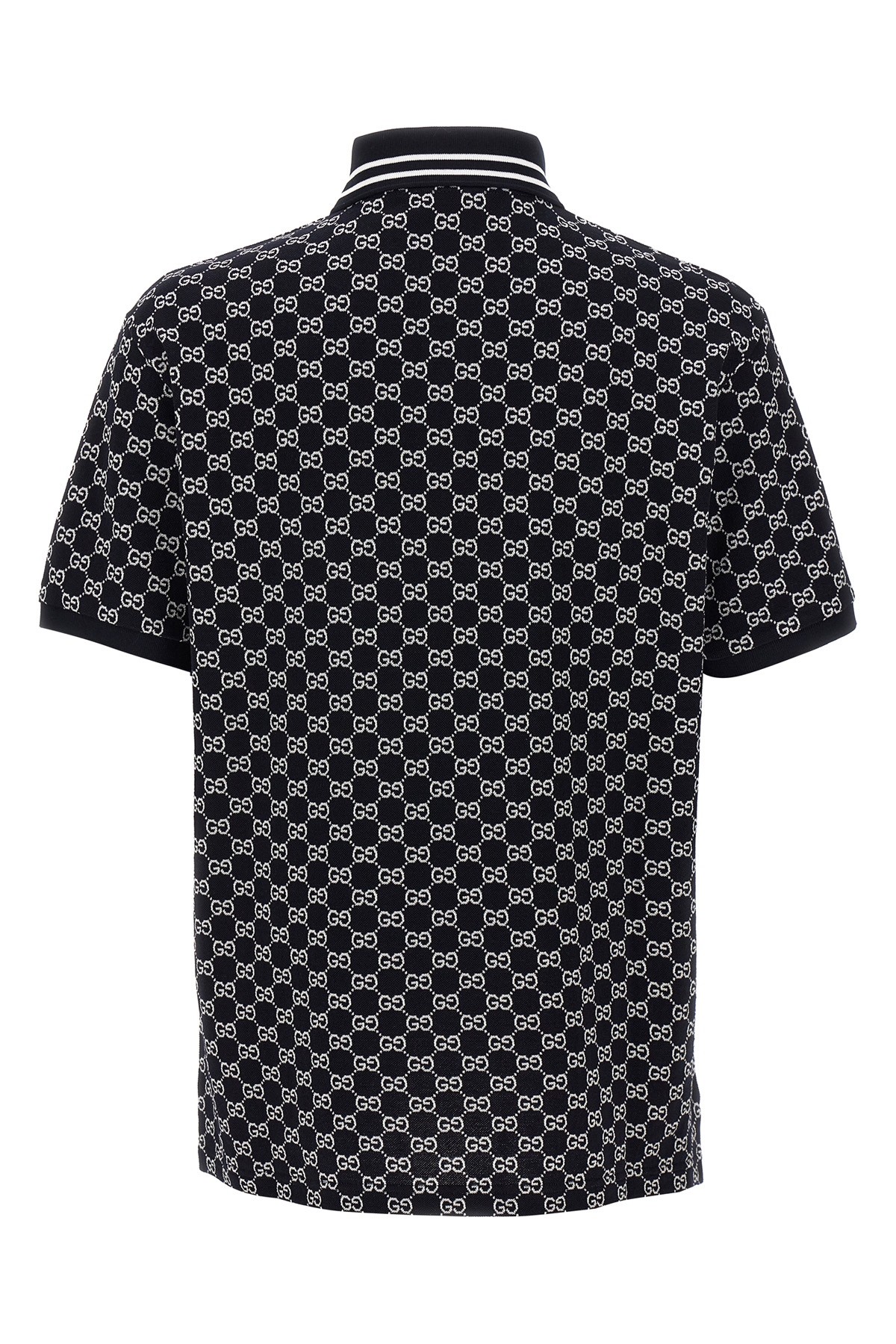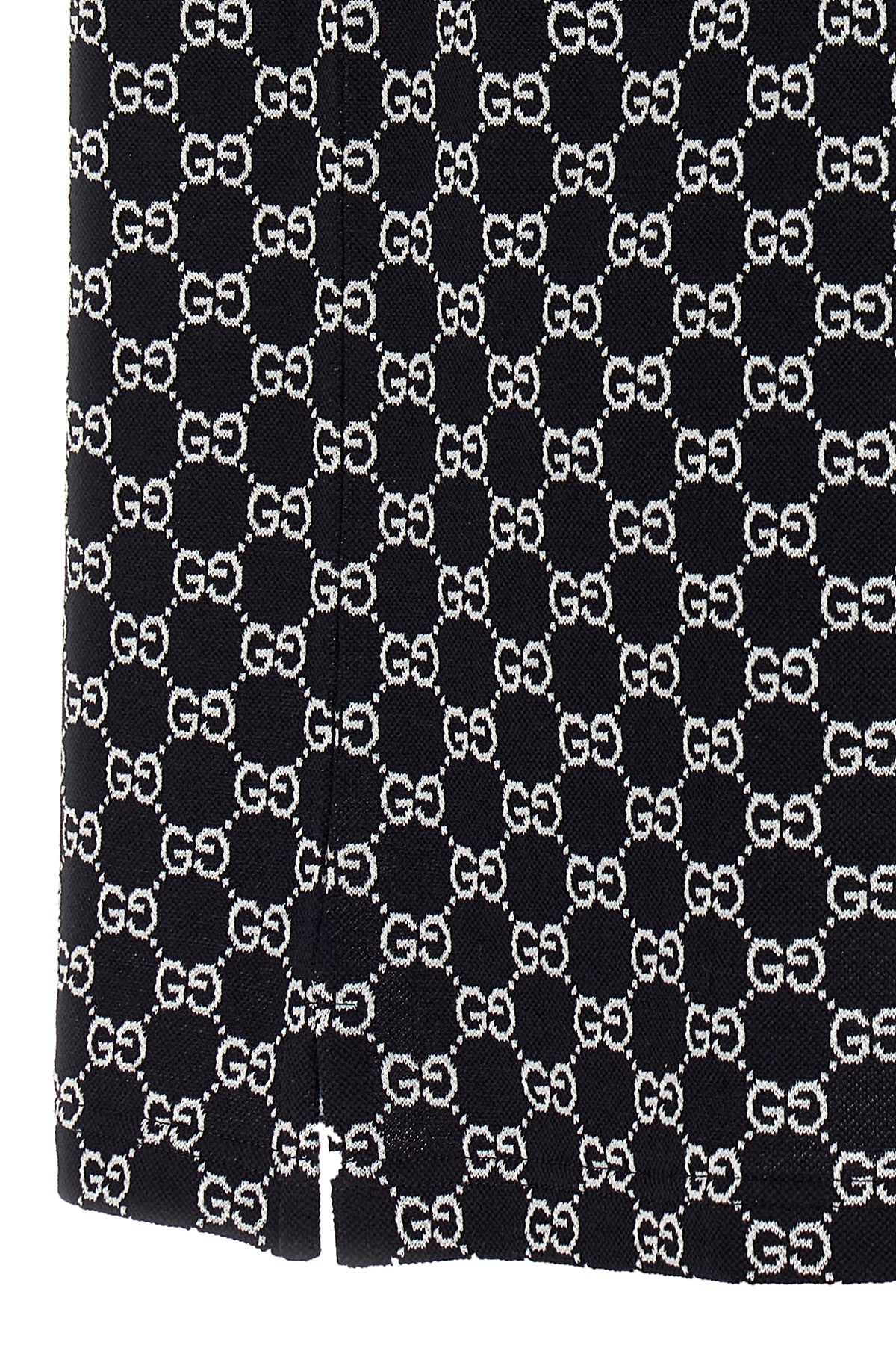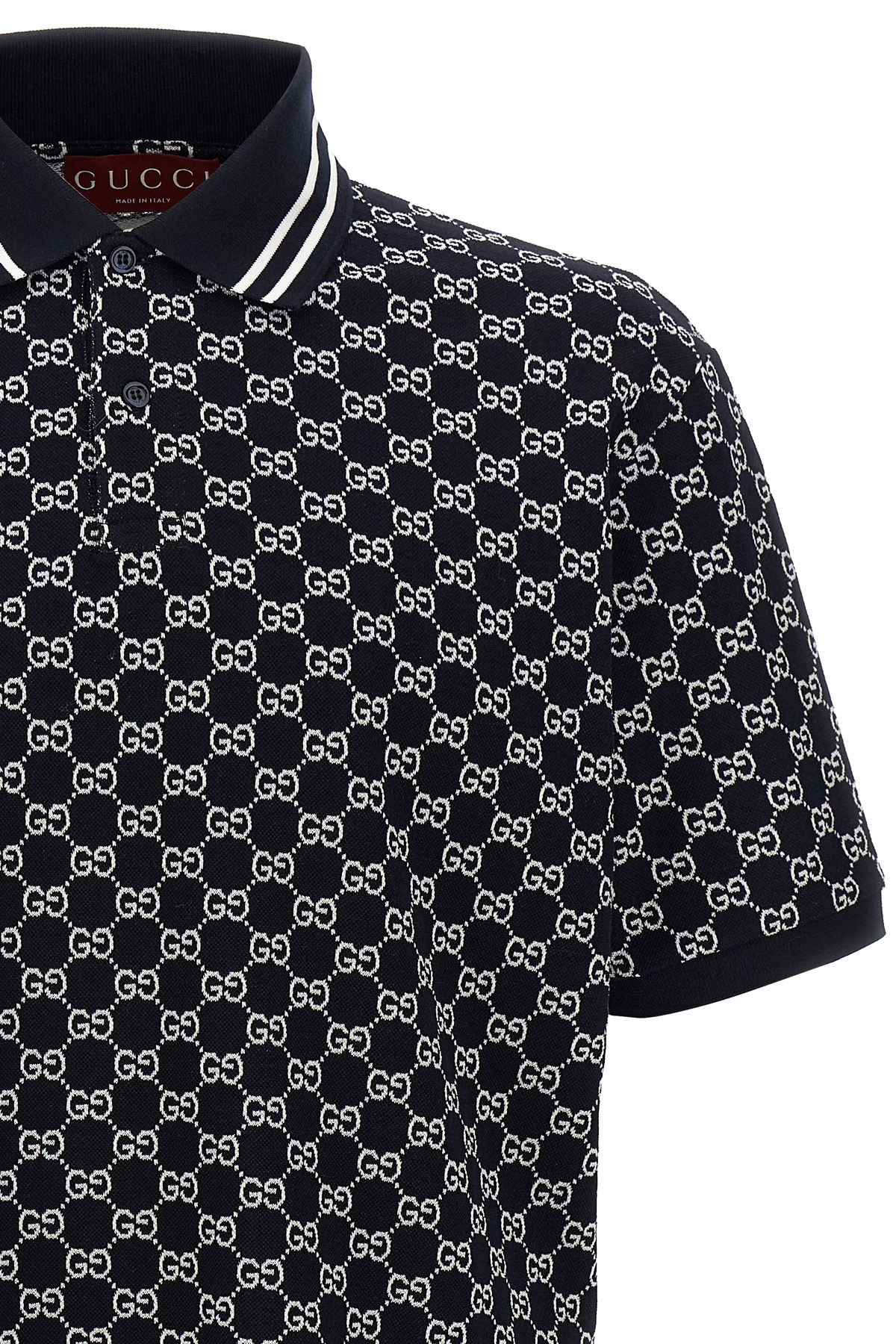 Cotton piquet polo shirt with navy blue and white GG jacquard pattern, collar and buttons, short sleeves, side splits.