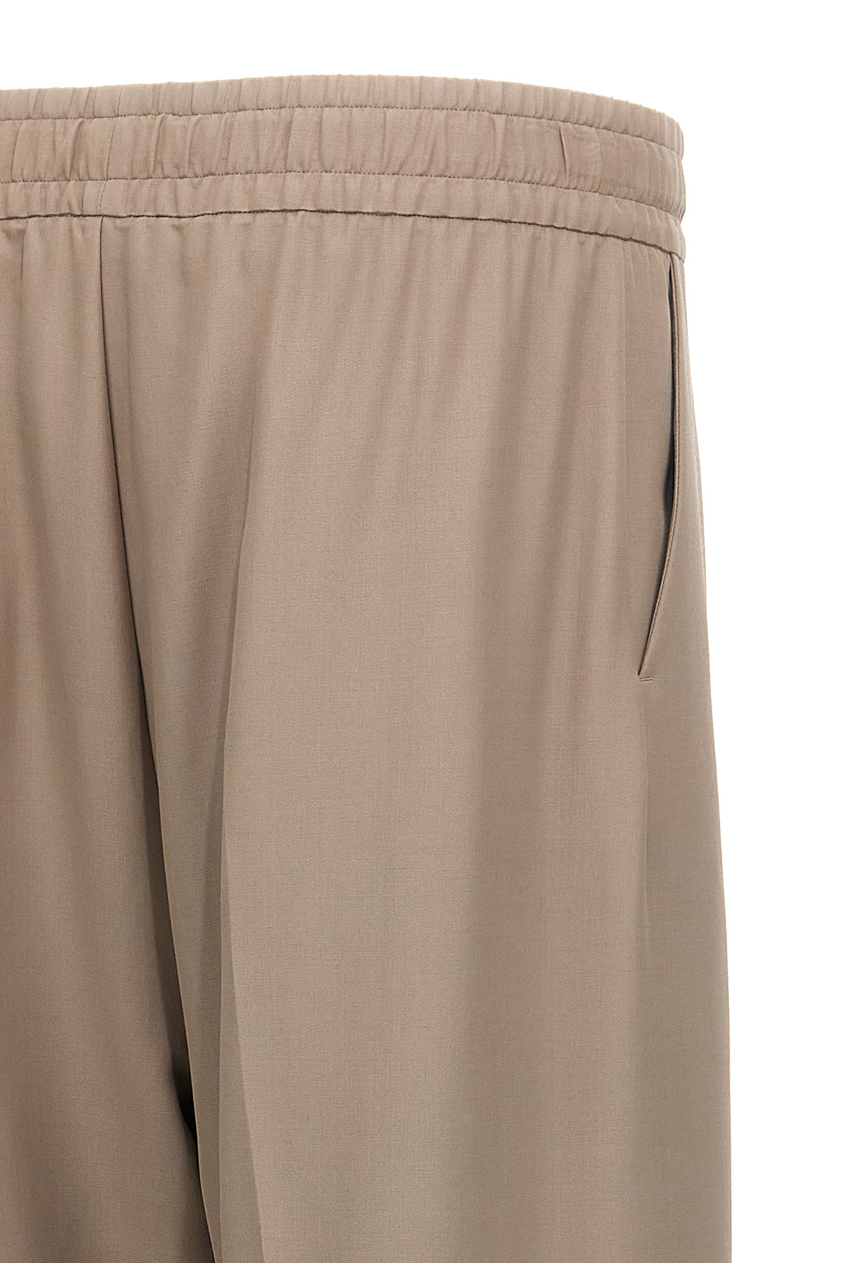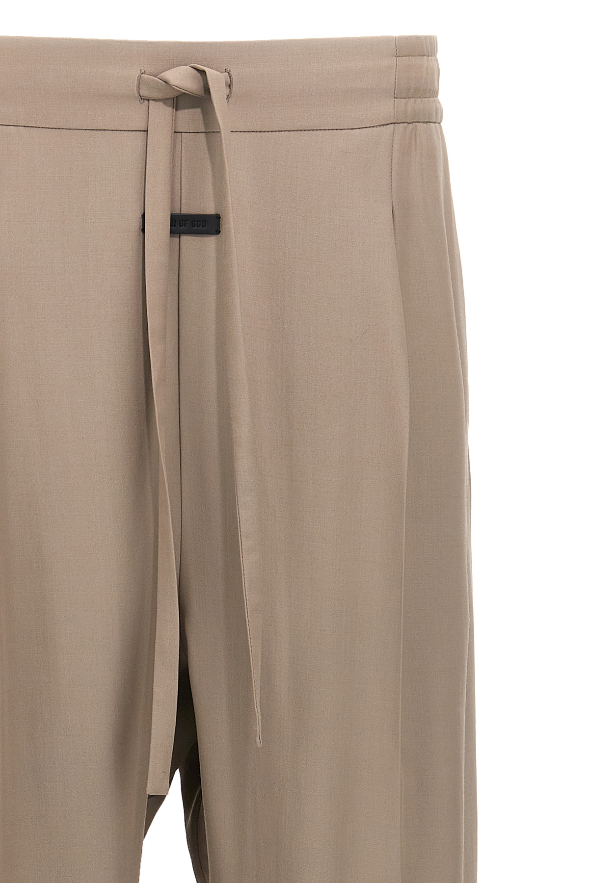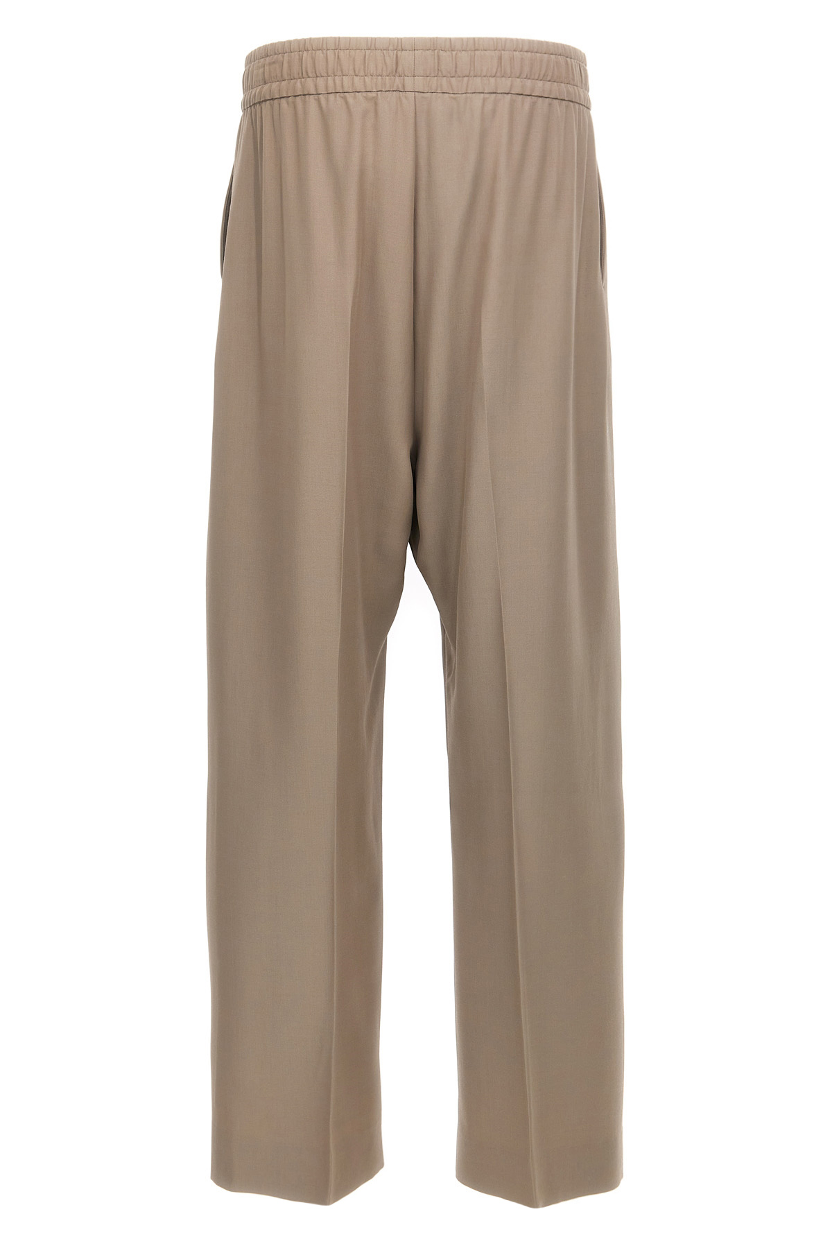 'Eternal' virgin wool and cotton blend pants, contrast front logo patch, wide leg with stretched pleat and low crotch, adjustable drawstring elastic at the waist, pockets.