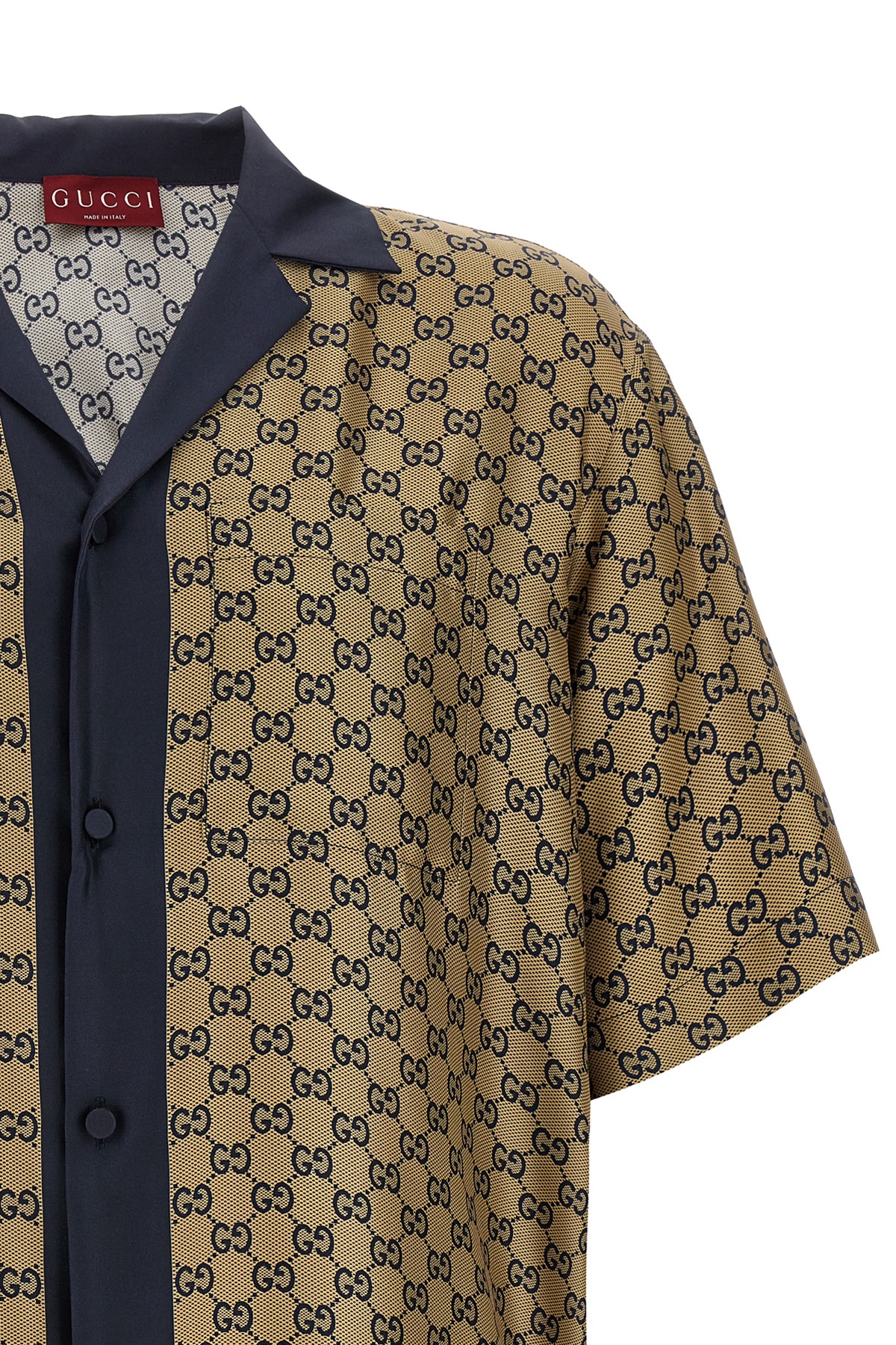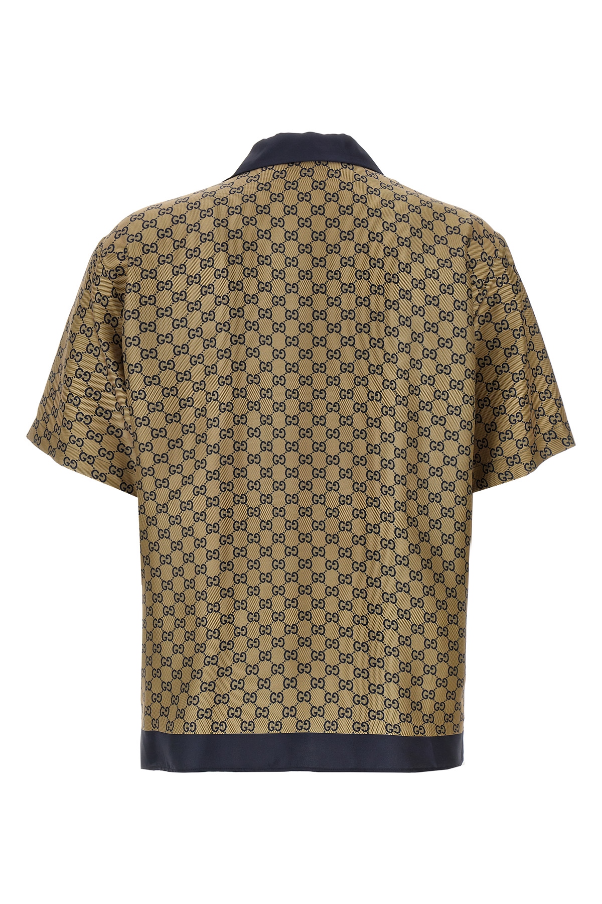 All-over GG silk twill shirt with contrast piping, bowling style, button closure, short sleeves, side splits, chest pocket.