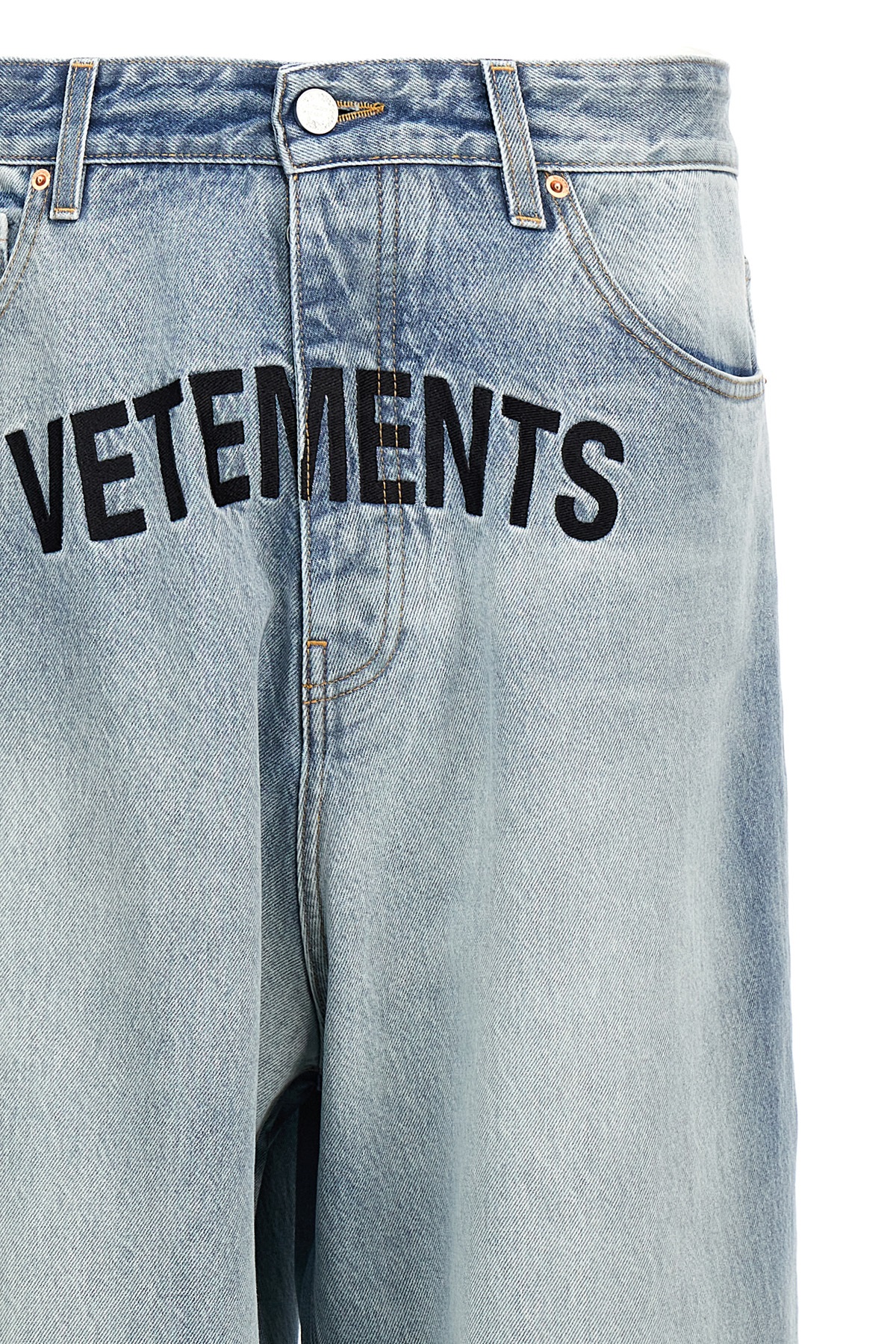 Vintage-effect cotton denim jeans, maxi logo embroidery on the front, button closure, five pockets, wide and straight leg, and leather logo label on the back.