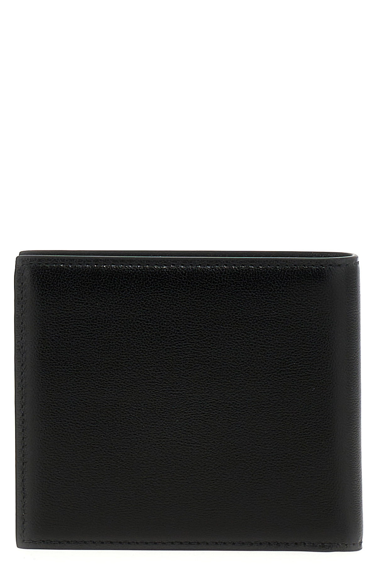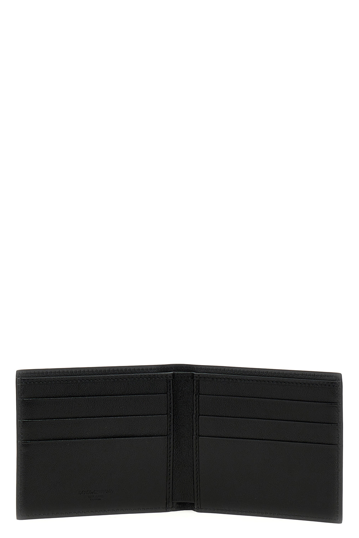 'Bifold' calf leather wallet with front embossed logo, book opening.