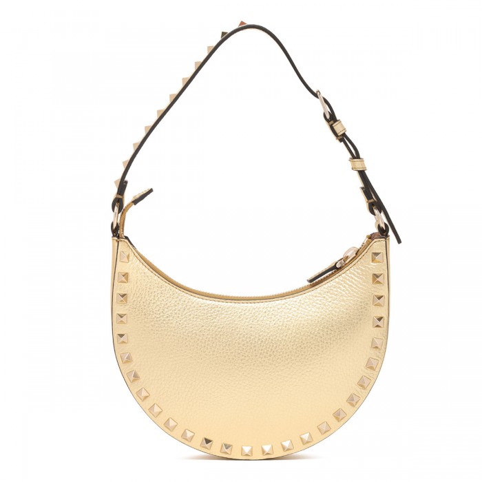 Old-gold hue grained leather Rockstud mini hobo bag from Valentino Garavani featuring adjustable leather handle, zip fastening along top, platinum finish studs and hardware, nappa lining, one internal card slot.