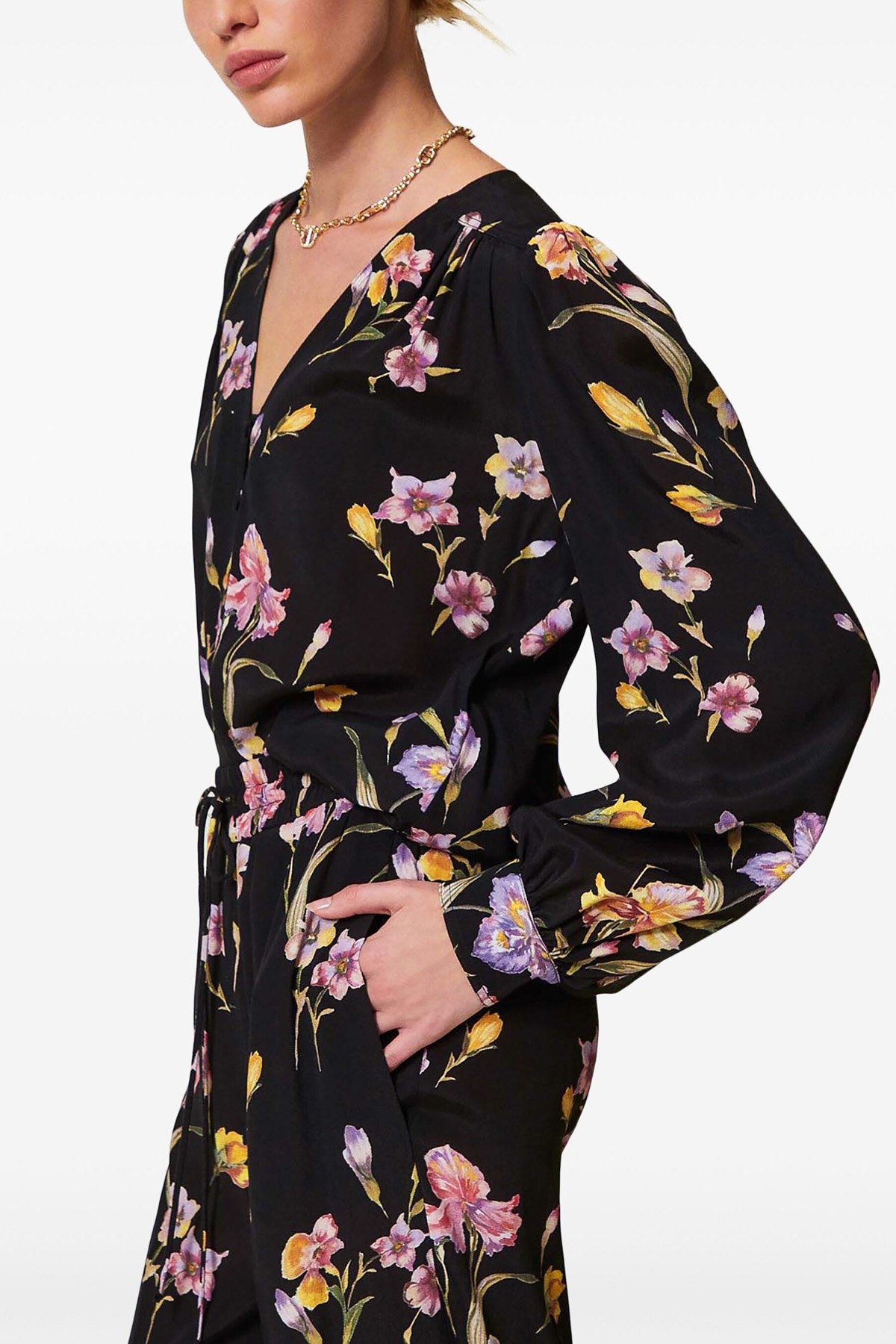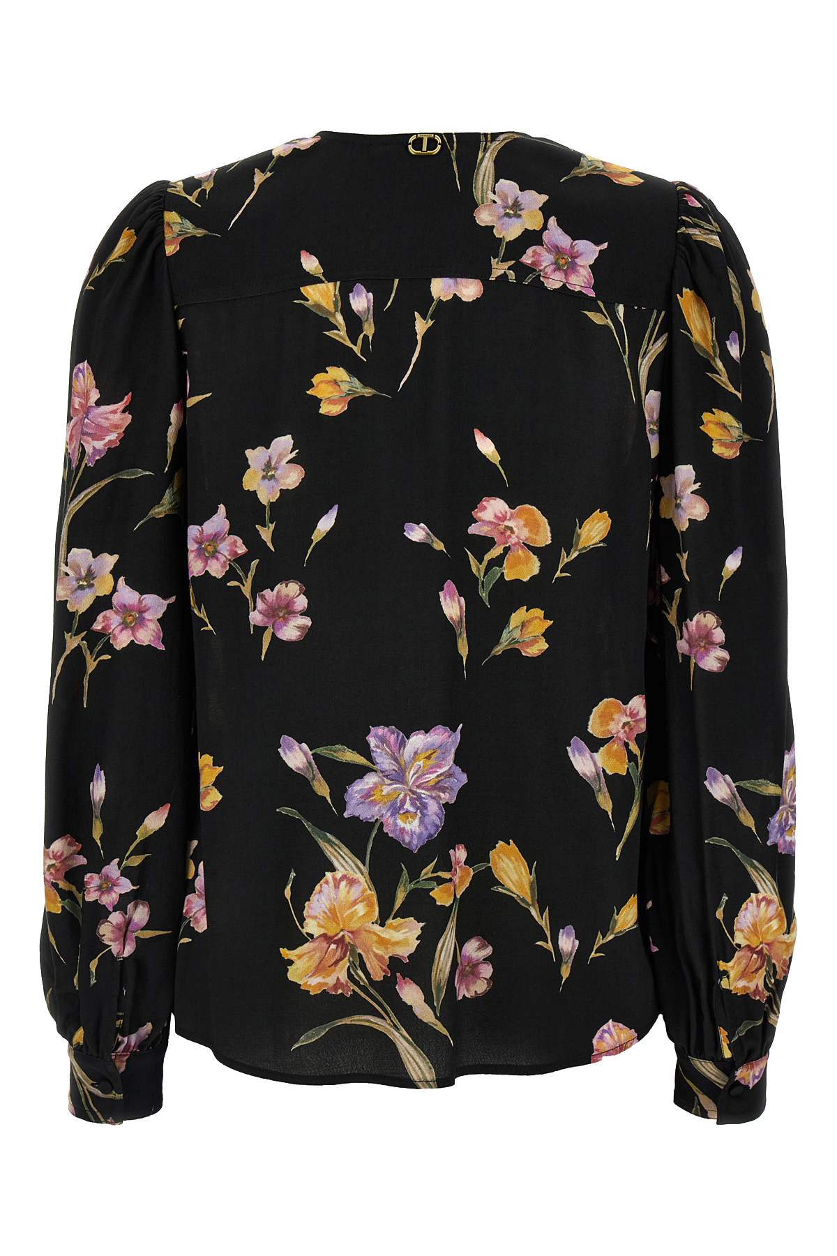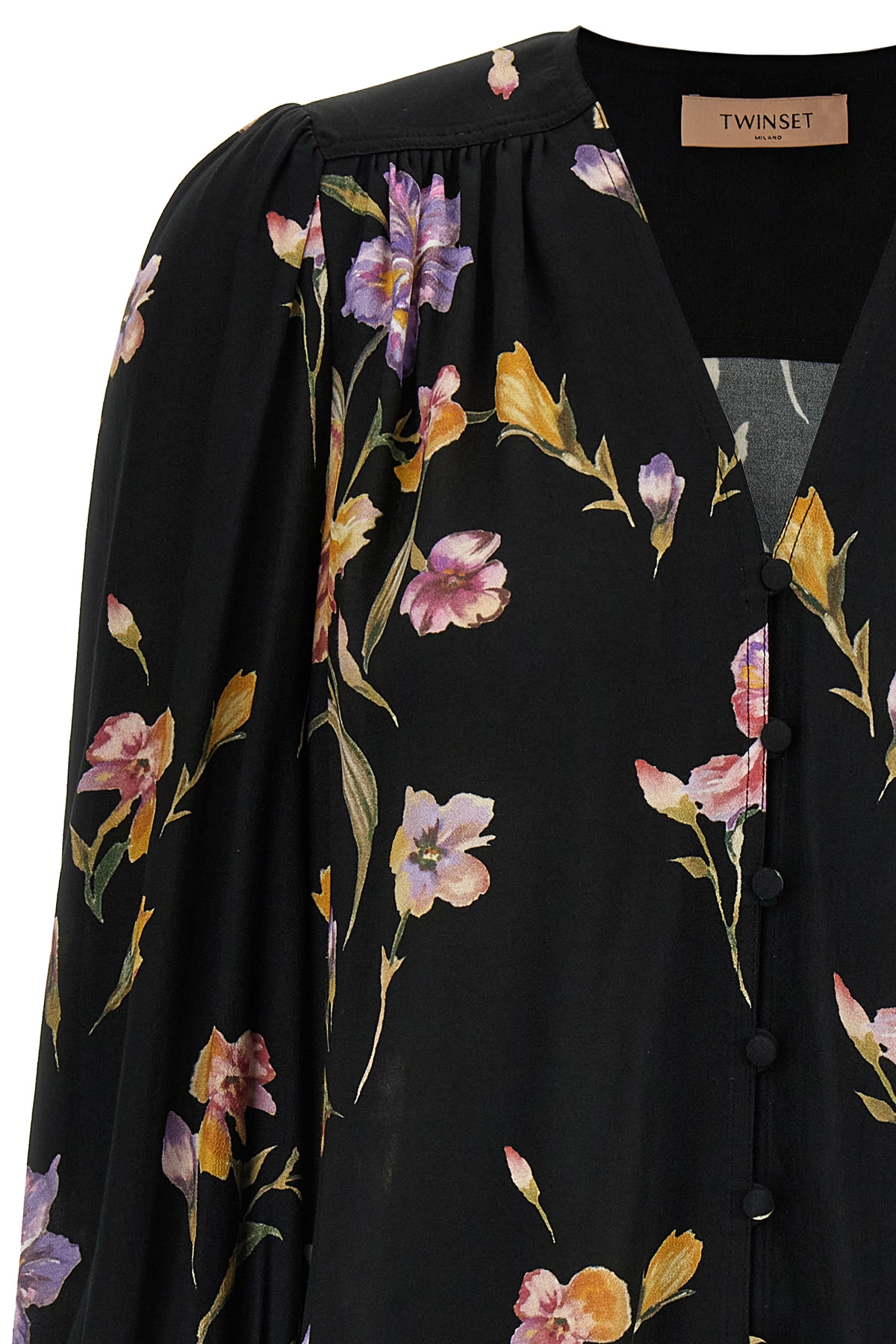 'Iris' crepe de Chine shirt with all-over floral print, V-neck, long puff sleeves, button closure.