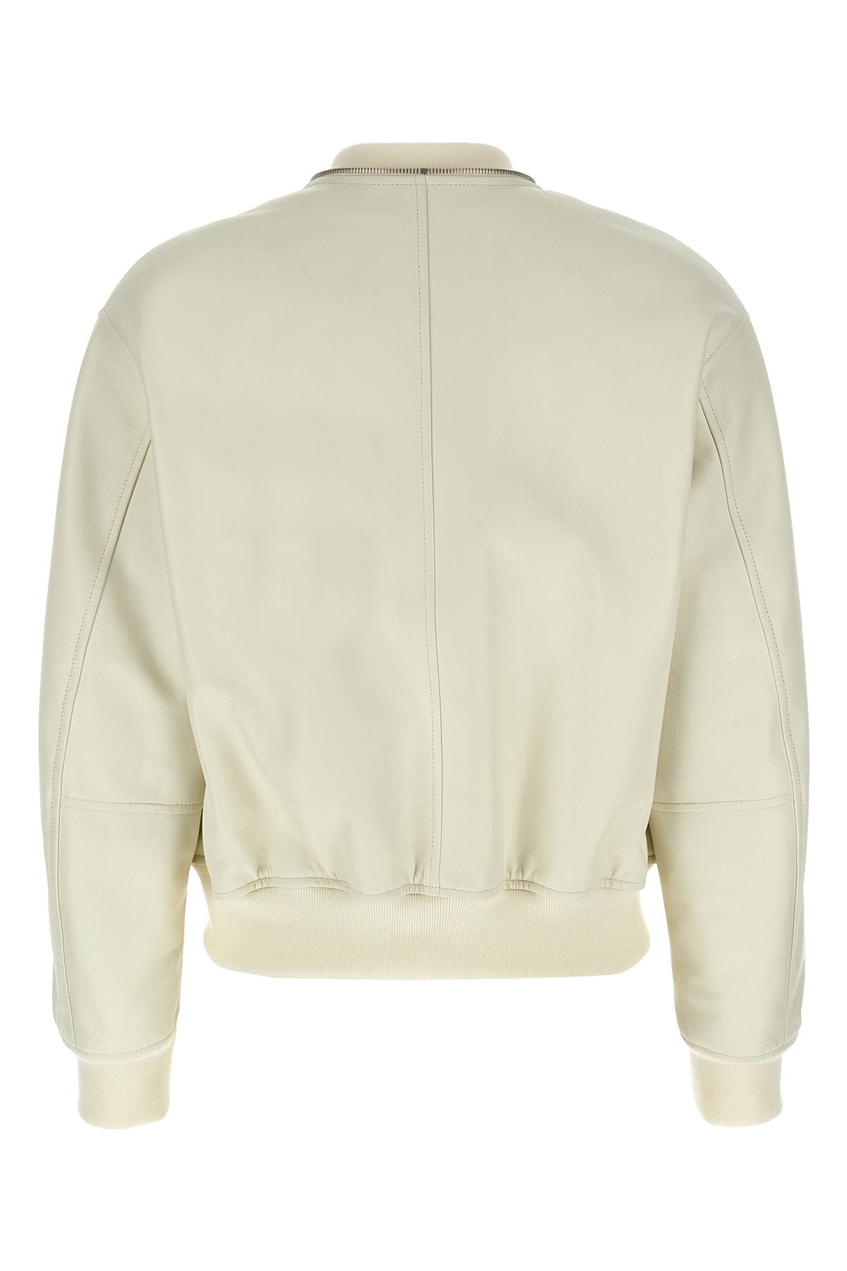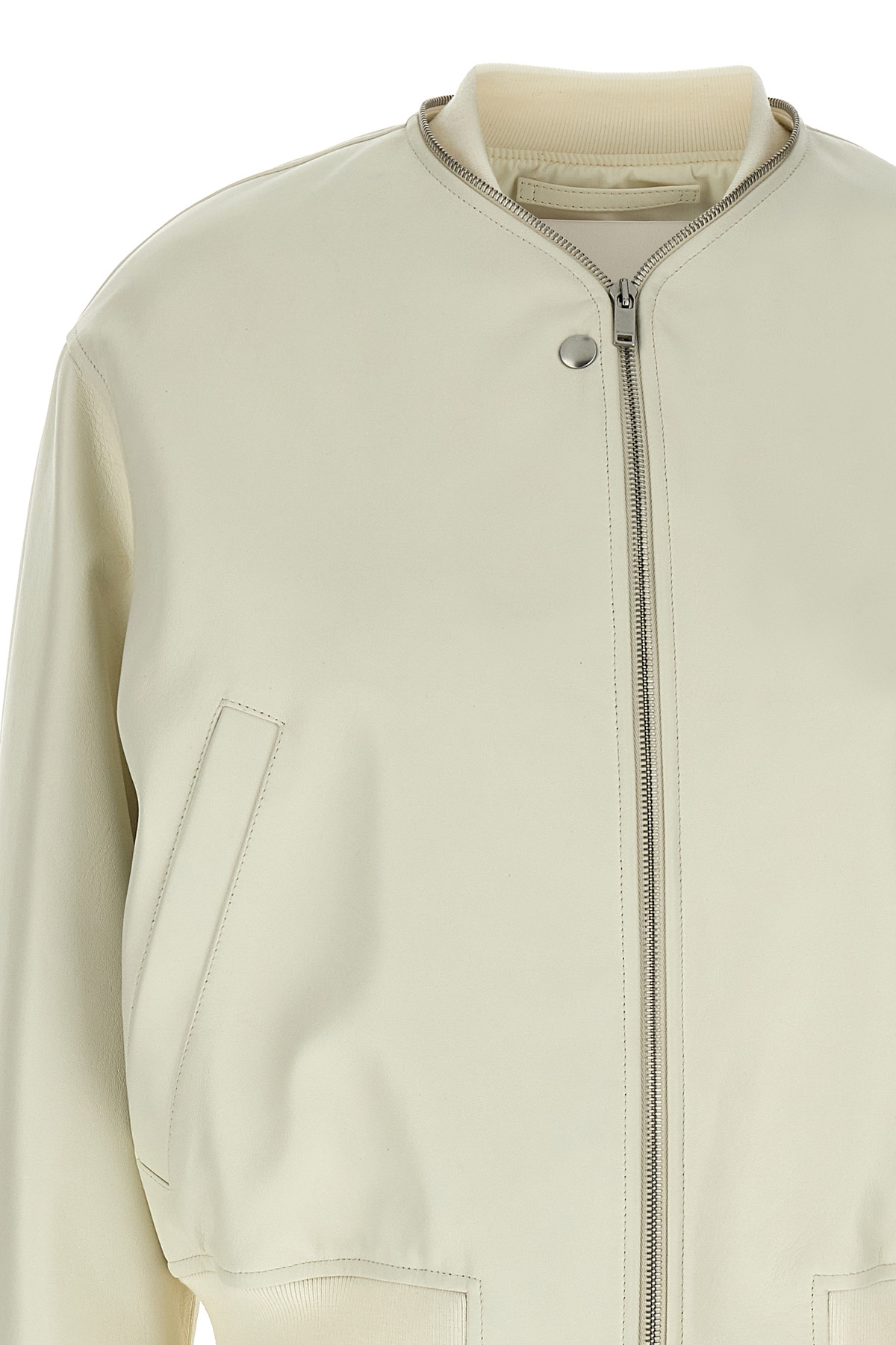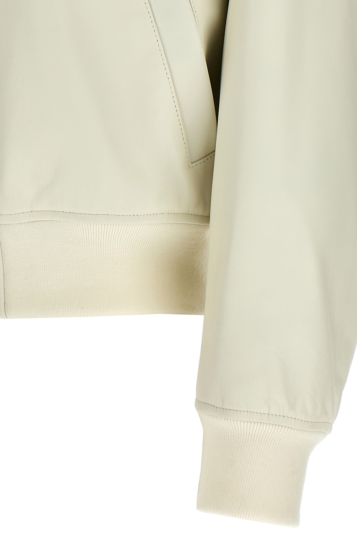 Leather bomber jacket, zip closure, pockets, long sleeves with elastic cuffs.