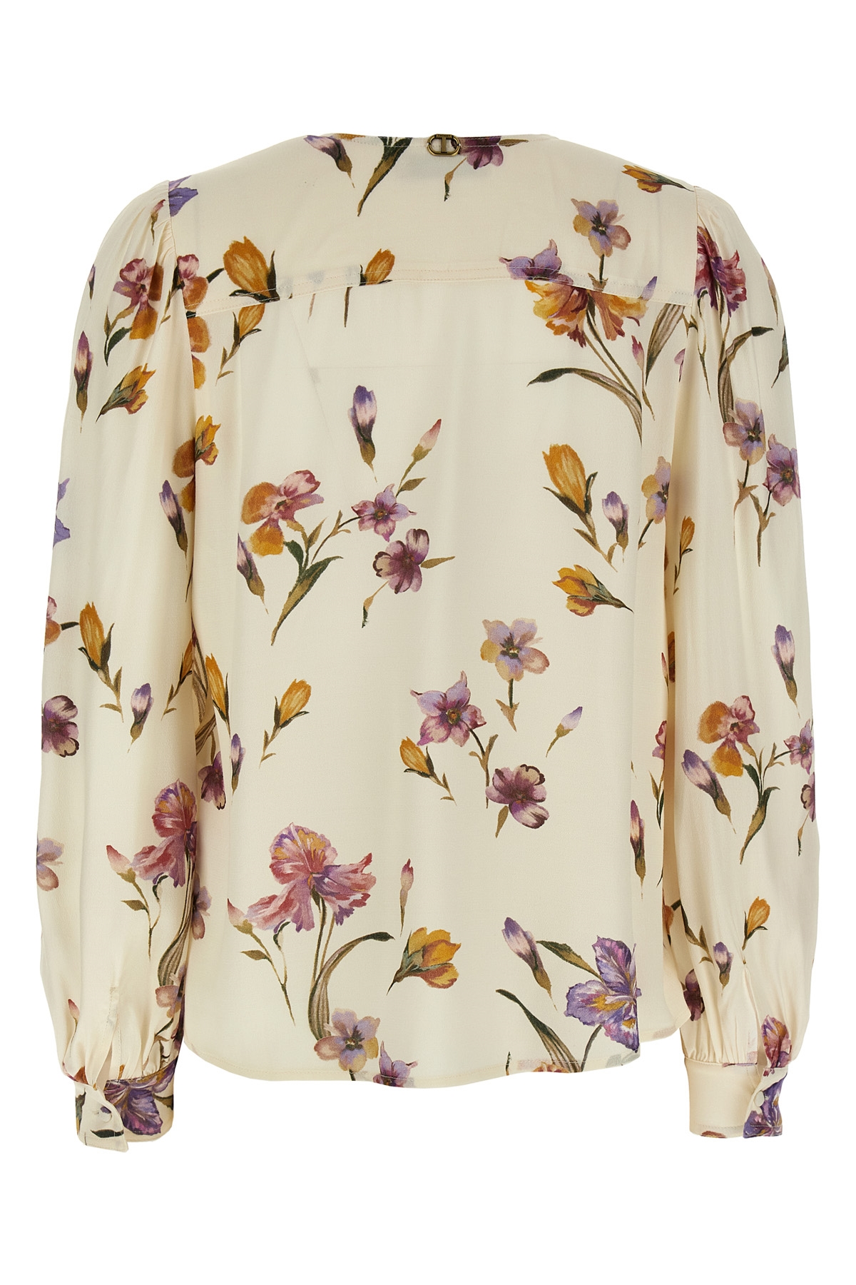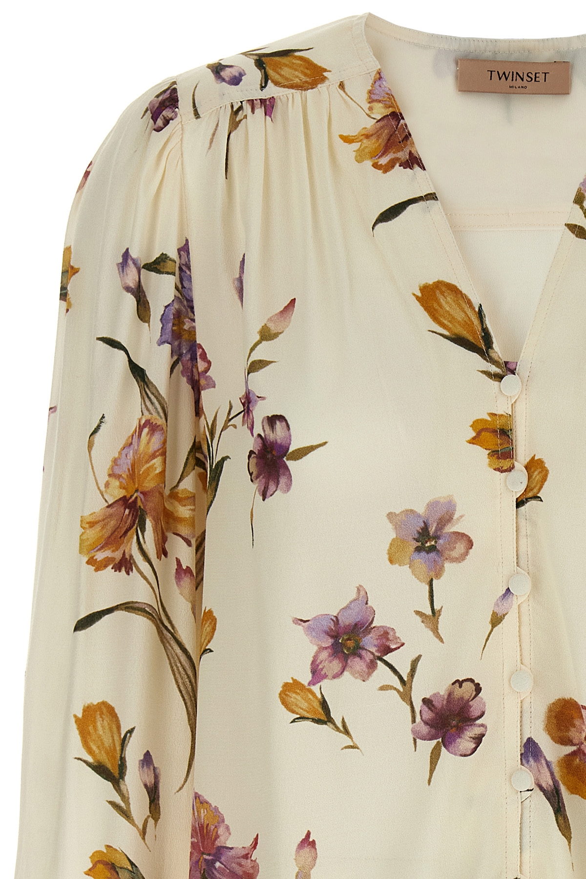 'Iris' crepe de Chine shirt with all-over floral print, V-neck, long puff sleeves, button closure.