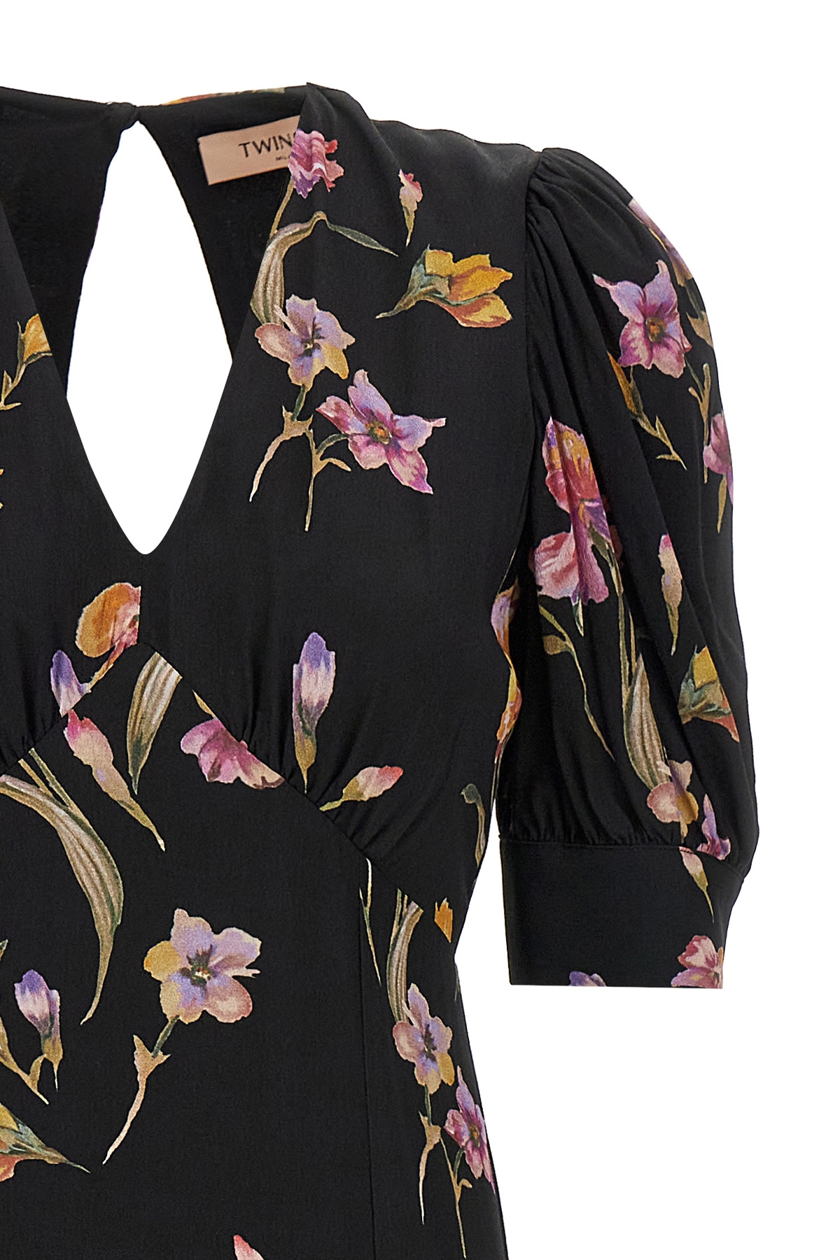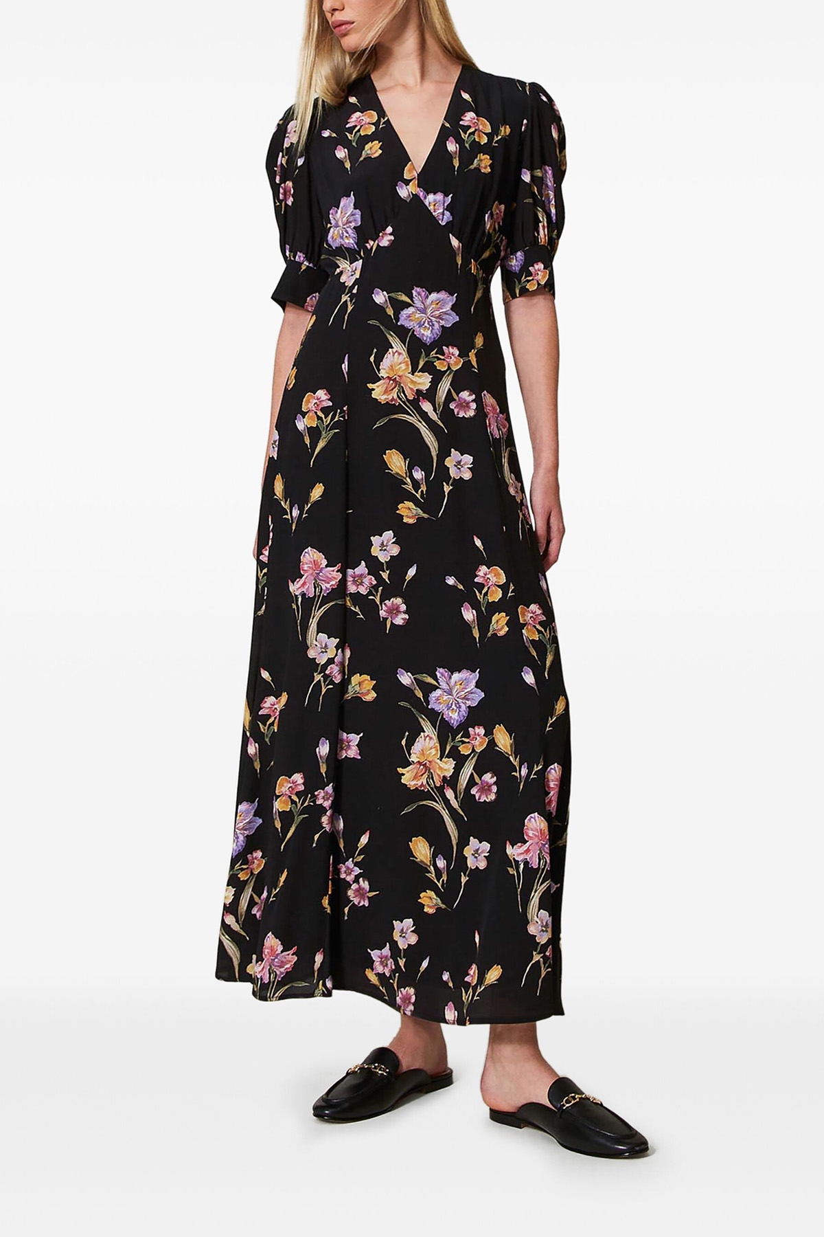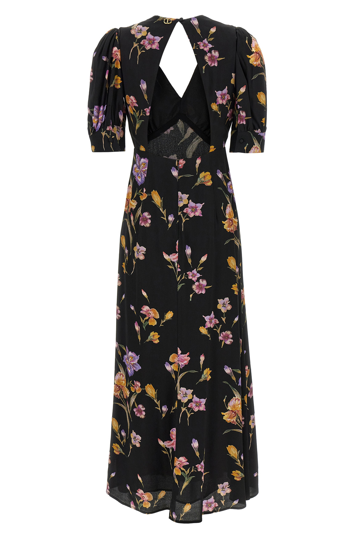 Long 'Iris' dress in crepe de Chine with all-over floral print, V-neck, wide geometric neckline at the back with button and zip closure, short puff sleeves, underskirt.