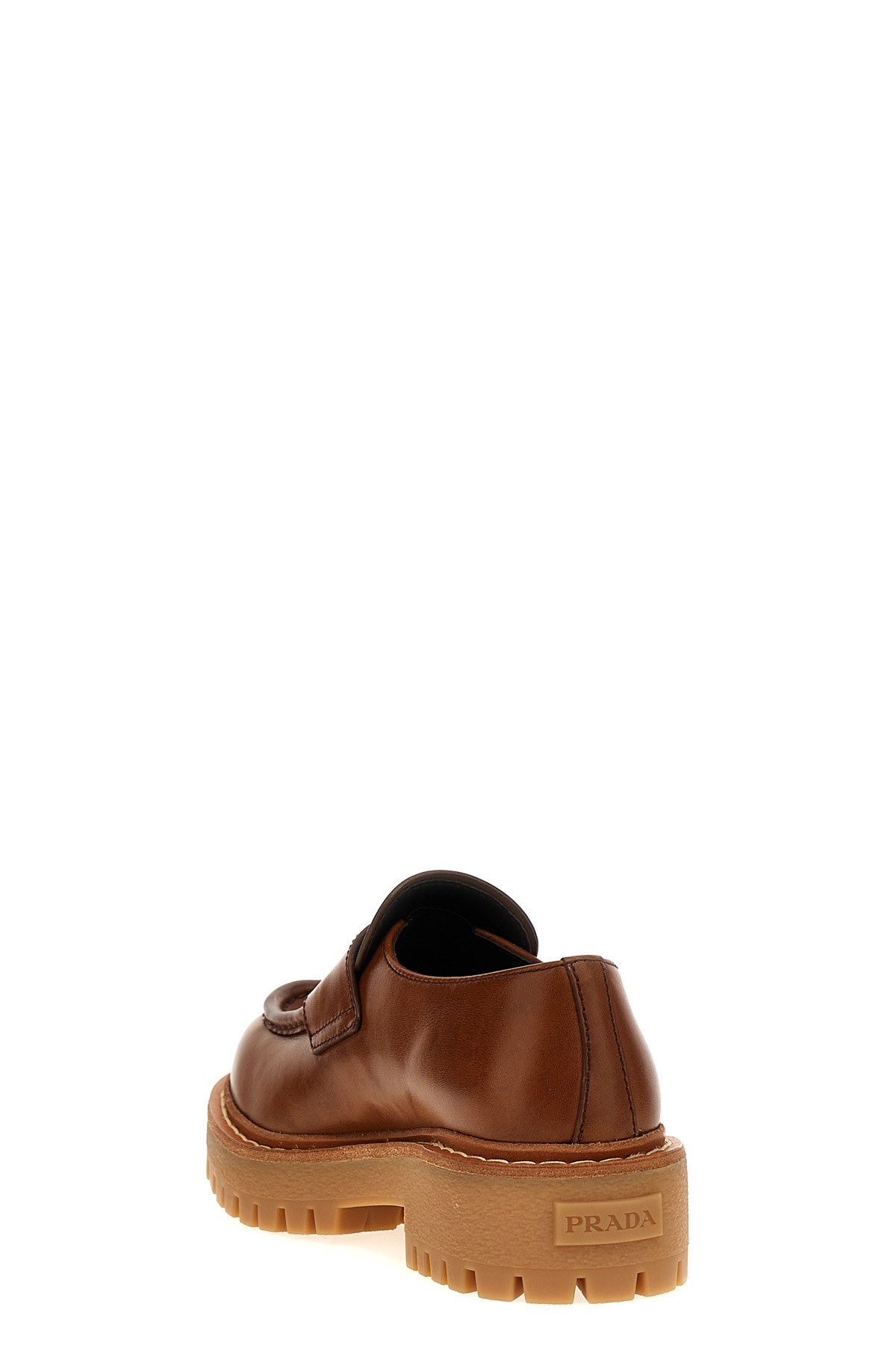 'Double Chocolate' vintage effect leather loafers with triangle enamelled metal logo applique, monobloc rubber sole, double welt in notched molded rubber.