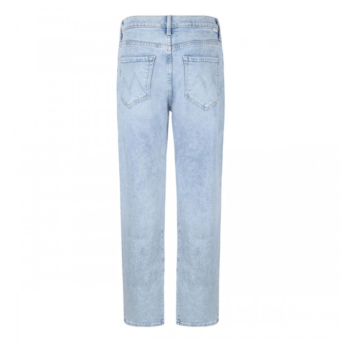 Light-blue wash slightly stretch denim The Ditcher Zip Ankle jeans from Mother featuring whiskering and fading at the knee, straight-leg, ankle-length, slightly dropped crotch, slouch fit, zip fly, high-rise, belt loops on the waistband, M logo embroidery at back.