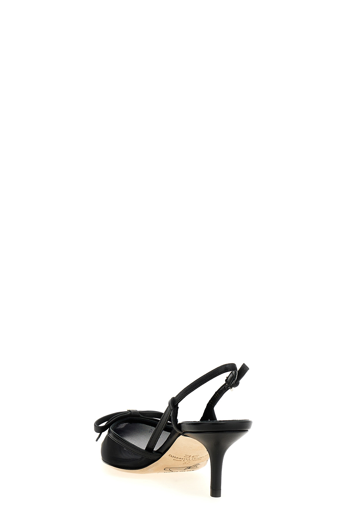 Nappa leather slingback with semi-transparent mesh inserts, bow detail and gold metal logo, pointed toe, adjustable strap, leather sole.
