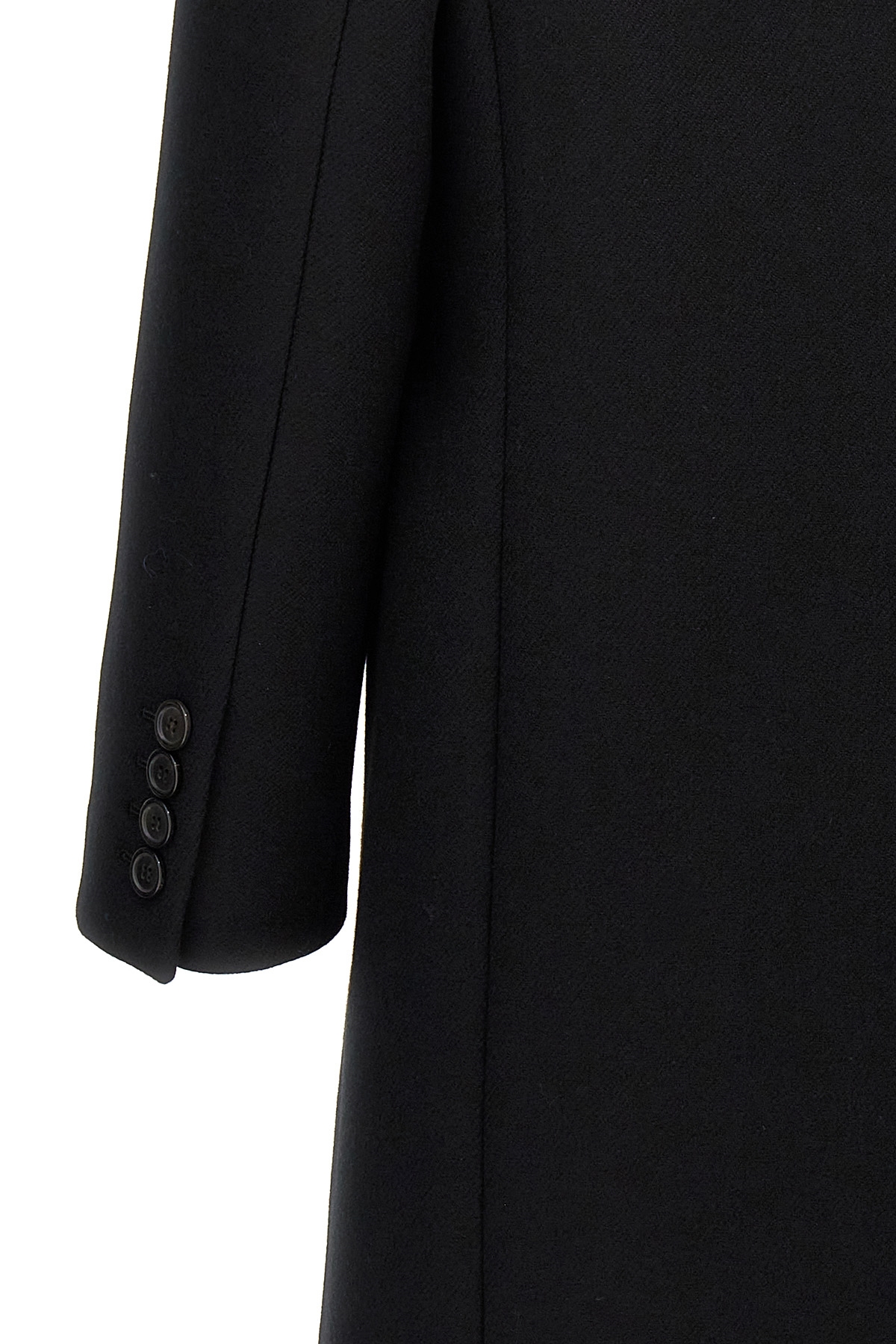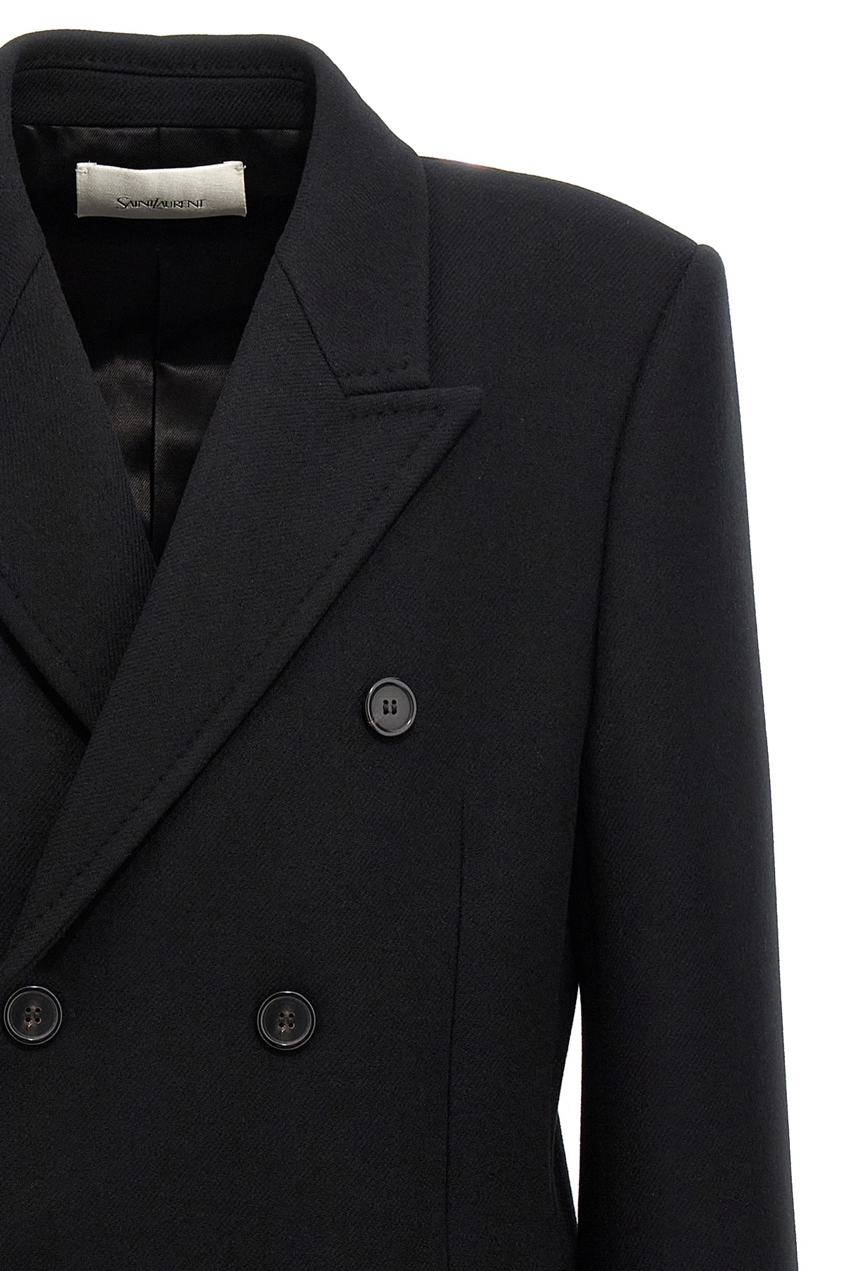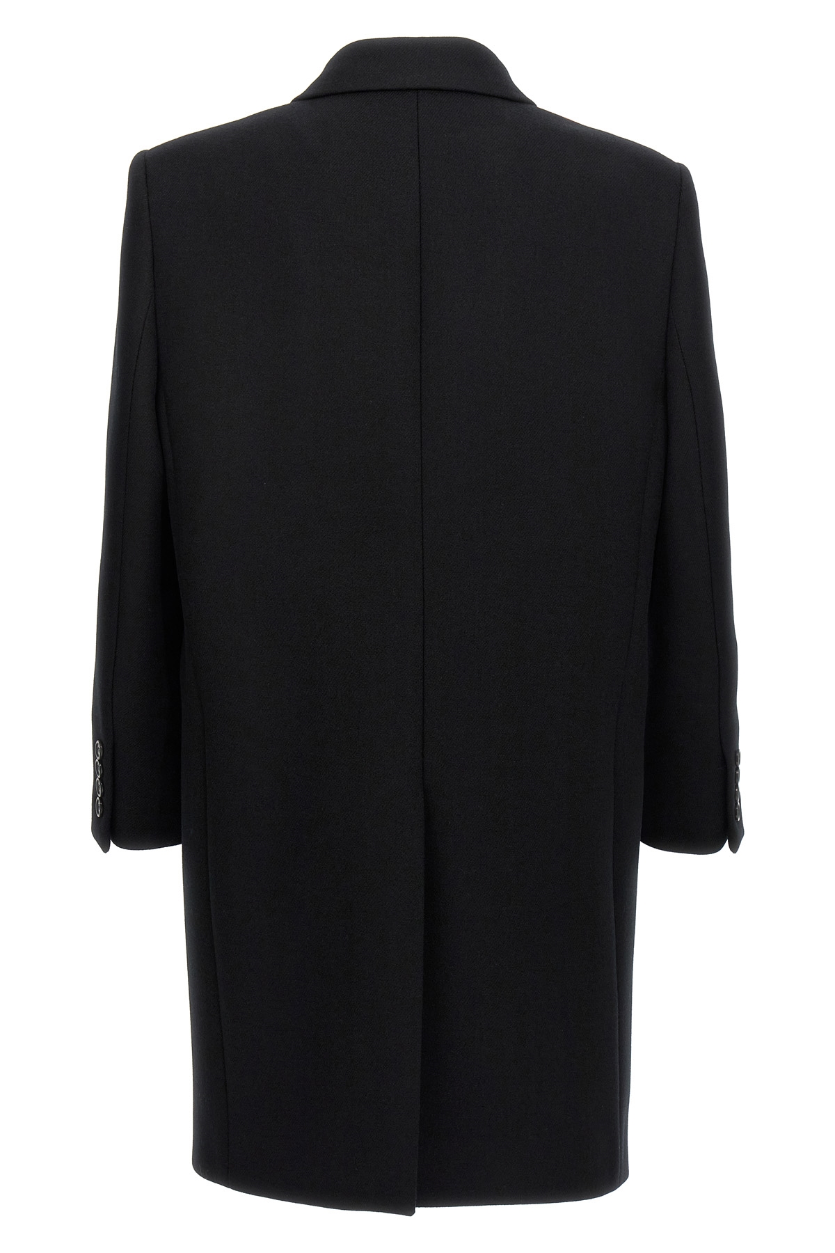 Double-breasted wool coat with button closure, pockets, long sleeves, back split.