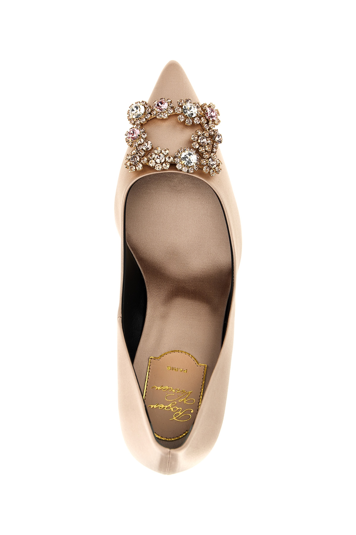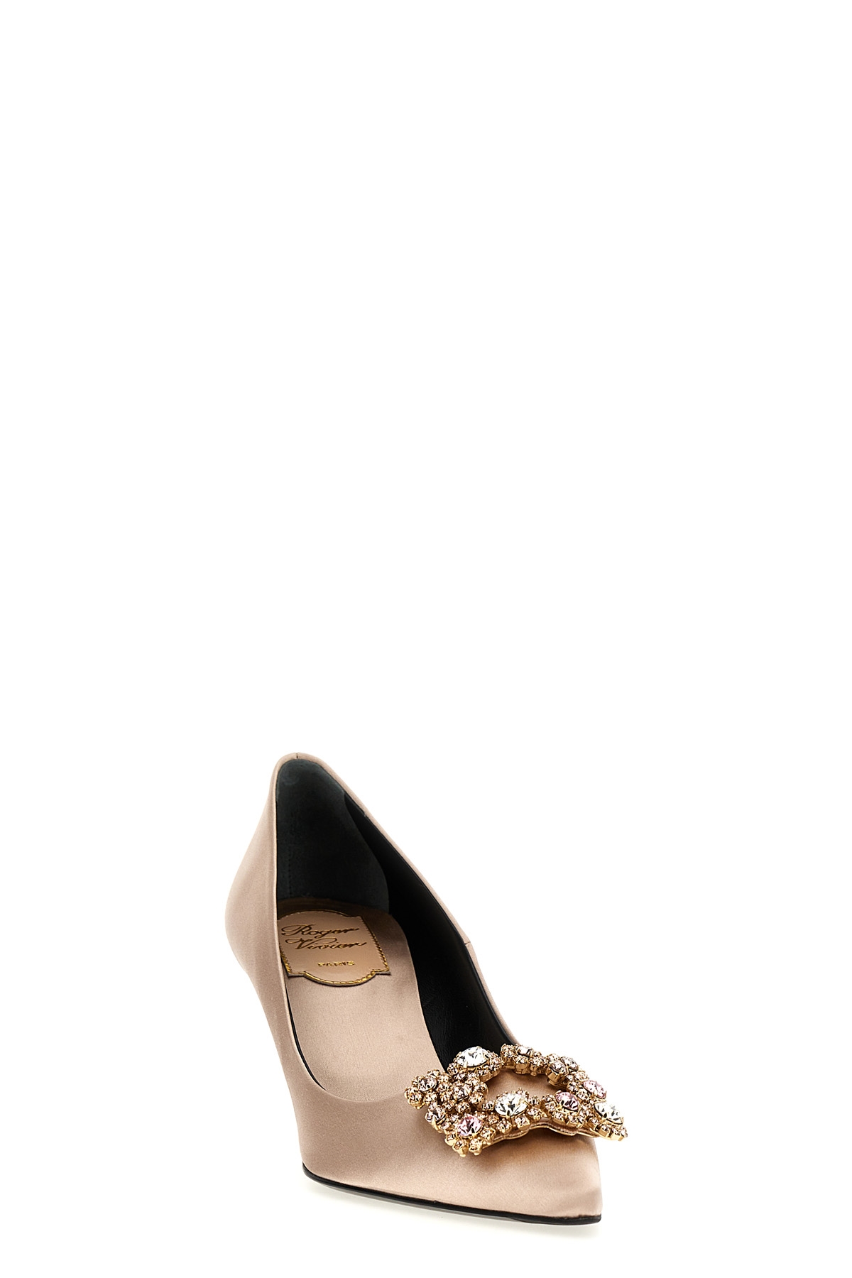 'Efflorescence' satin pumps with jewel buckle at the front, pointed toe, heel.