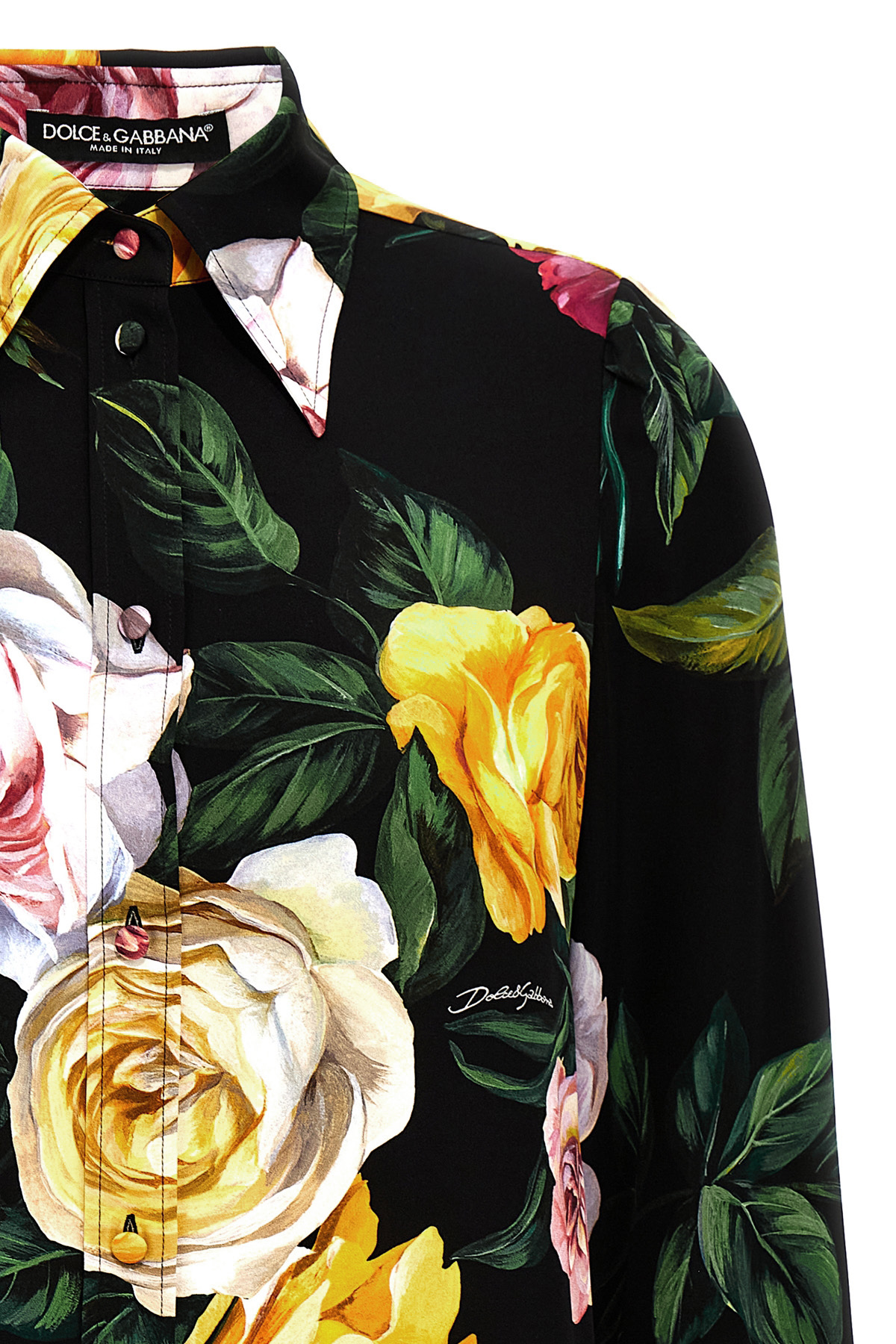 Floral print stretch silk charmeuse shirt, button closure, long cuffed sleeves, side splits.