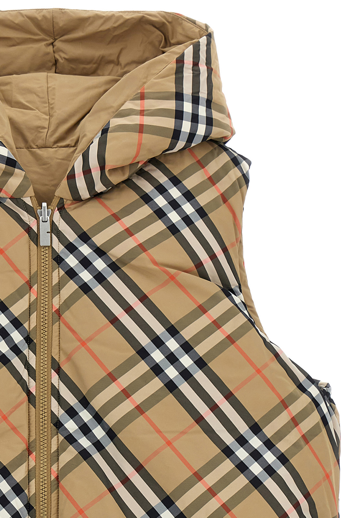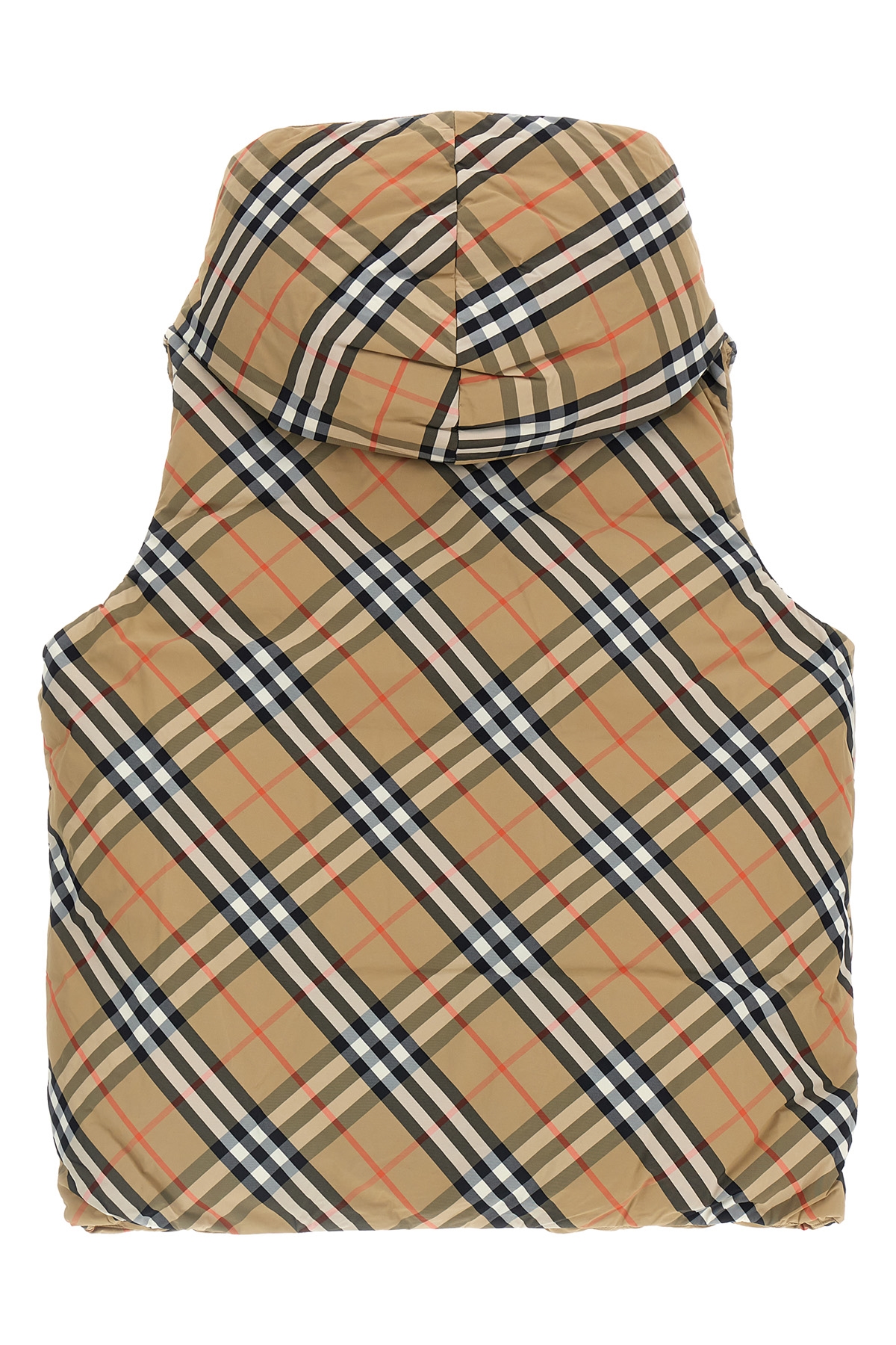 KIDS Reversible nylon vest with down padding, check print and solid color, hood and pockets.