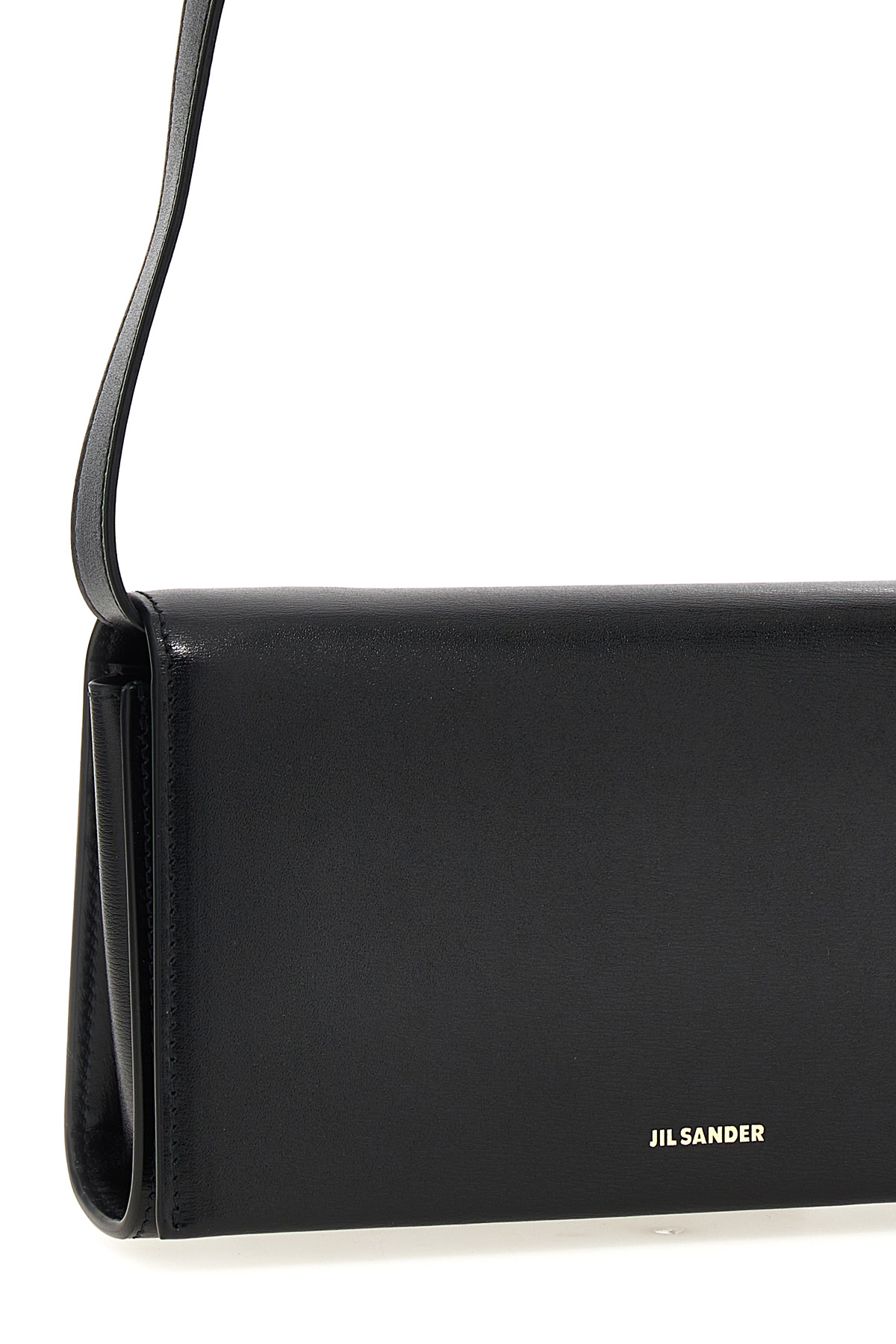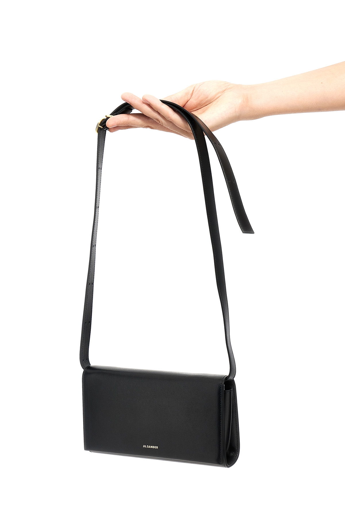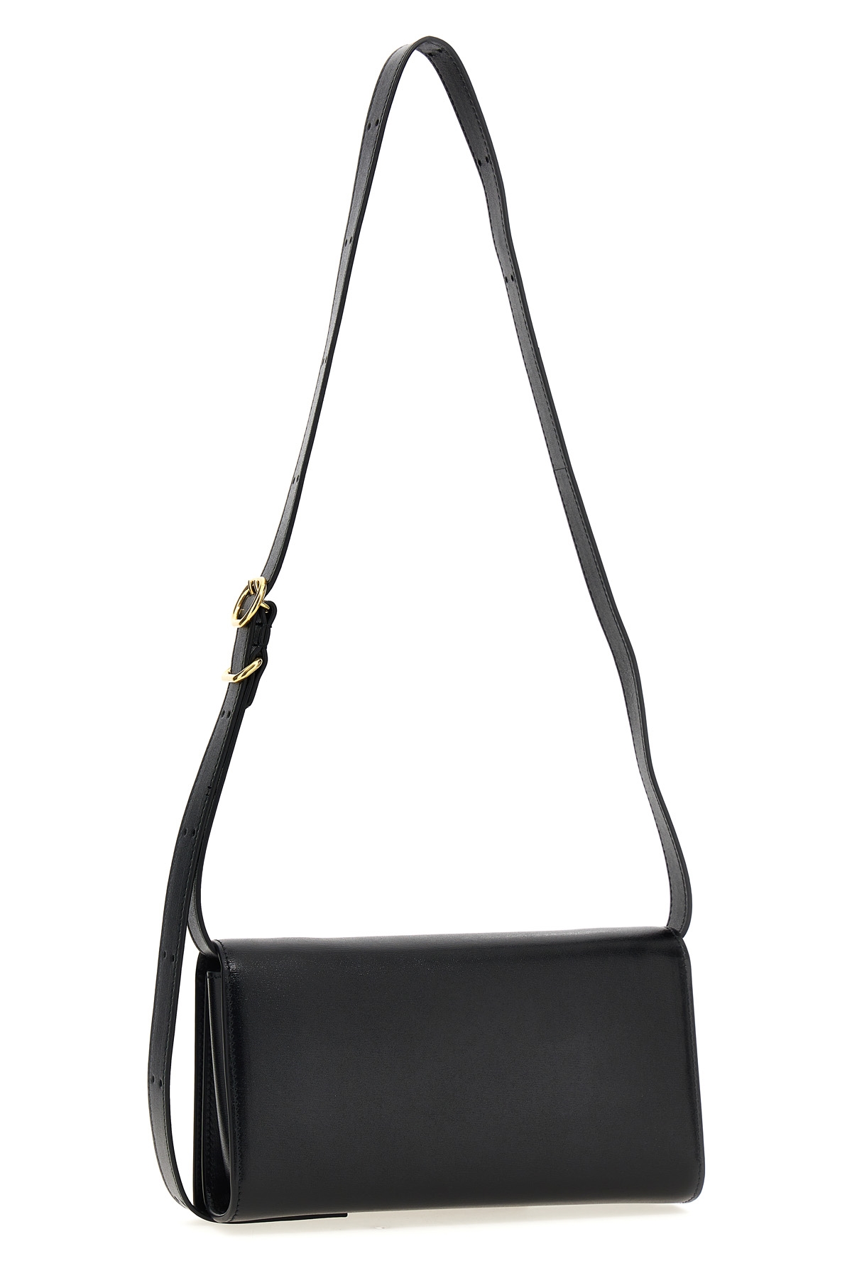 'All-Day' leather crossbody bag with snap button closure, front embossed logo, adjustable shoulder strap.