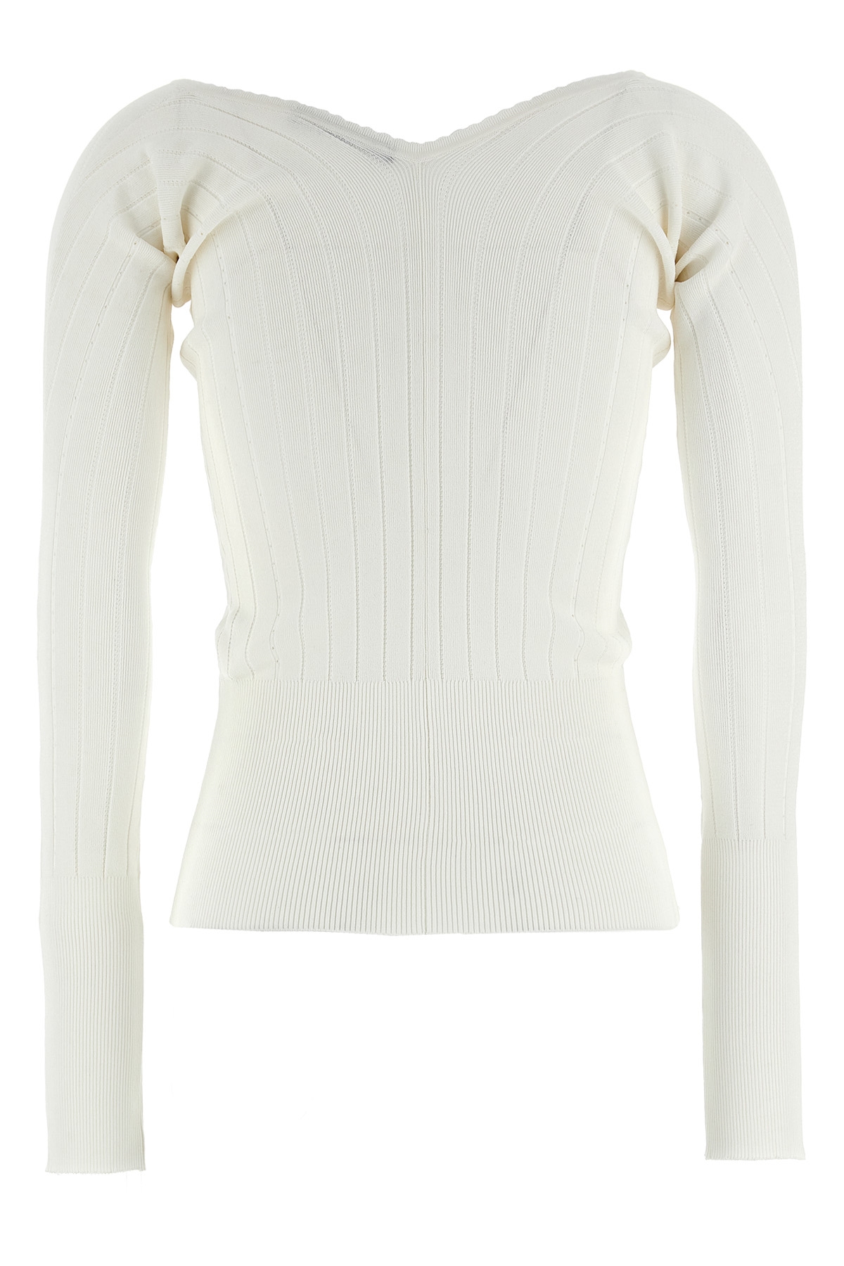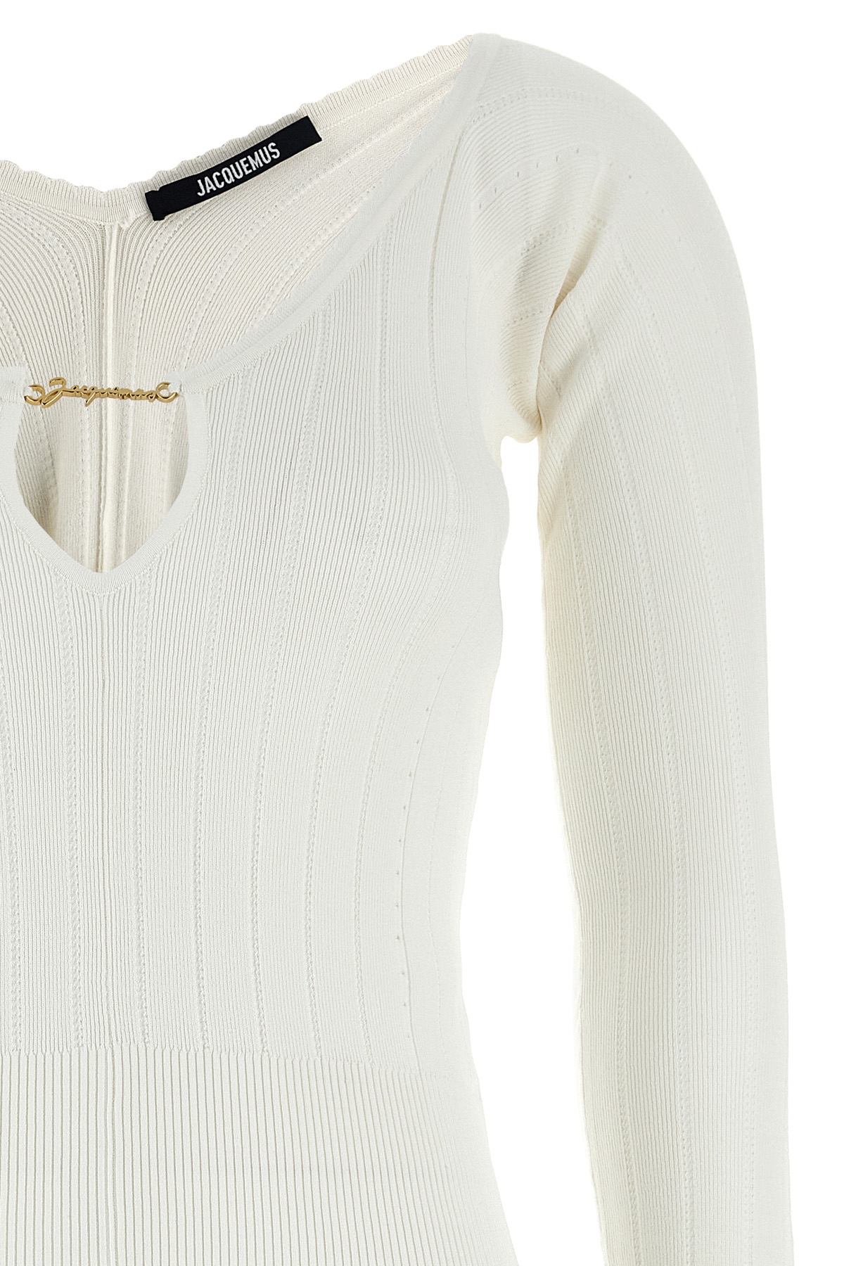 'Le haut Pralu' ribbed stretch viscose top, front cut-out detail with gold metal logo charm, long sleeves.