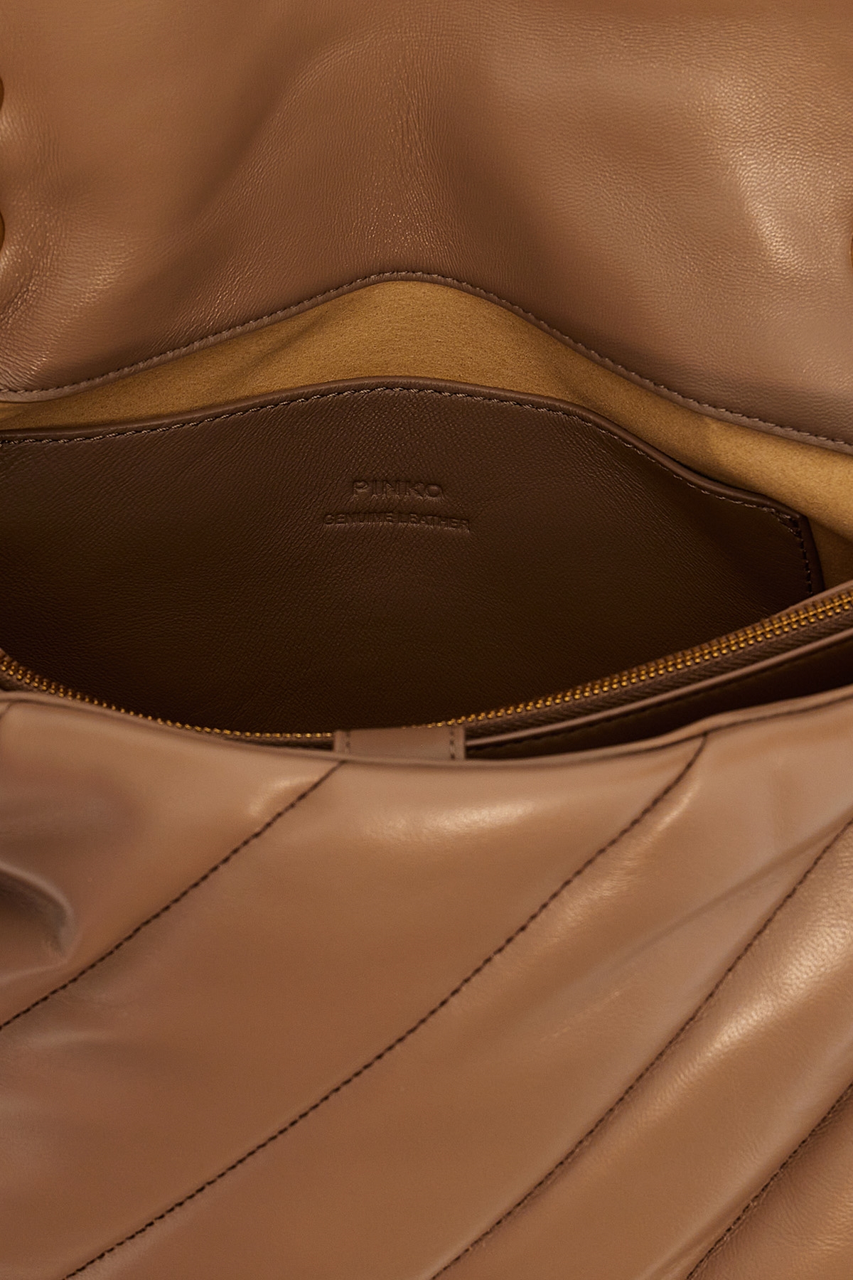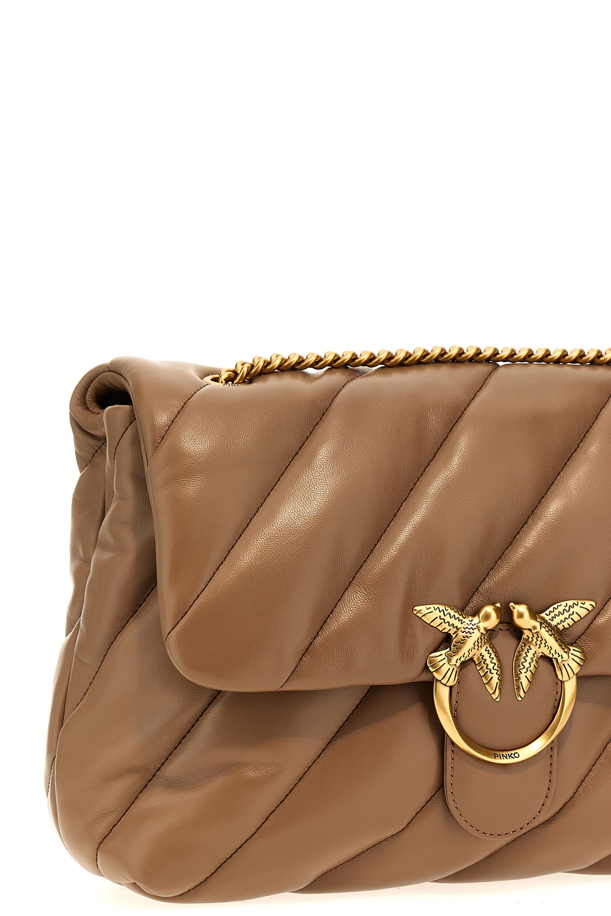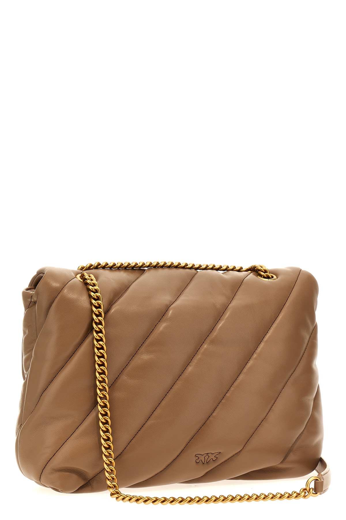 Big Love Bag Puff Maxi Quilt quilted leather crossbody bag, flap closure with front metal logo applique, and leather and chain shoulder strap.